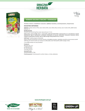 HERBATA ZIELONA Z MALINĄ + MARAKUJA Herbata zielona z dodatkiem owoców i płatków kwiatów, aromatyzowana, ekspresowa DELIKATNIE ZMYSŁOWA Składniki: herbata zielona (75%), owoc maliny (12%), owoc dzikiej róży, aromaty, owoc marakui (2%), płatki kwiatu bławatka 1%. Sposób parzenia: Saszetkę zalać szklanką gorącej wody. Zaparzać przez 2-3 min. Odkryj świat, poznaj potęgę natury i wyraź siebie wybierając BIG-ACTIVE. Towarzyszymy Ci w poszukiwaniu nowych doświadczeń, tego co autentyczne i prawdziwe. Realizujemy się tworząc różnorodne, herbaciane mieszanki, którym nadajemy indywidualny charakter. Wyrusz własną drogą i odkryj wśród nich to, co lubisz! LOOK bag™ torebki przyjazne środowisku Zobacz kolorowe kompozycje suszonych owoców, ziół, płatków kwiatów i dodatków wewnątrz przezroczystej saszetki LOOK bag. Na Twoich oczach susz rozwija się, odkrywając przed Tobą jakość i pełnię swojego smaku. U nas każda herbata ma swój charakter! Producent: Big-Active Sp. z o.o. ul. Bobrowiecka 6 00-728 Warszawa www.big-active.pl Zawartość netto 34 g (20 torebek x 1,7 g) Przechowywanie: Przechowywać w suchym miejscu, w temp. pokojowej. www.herbapol.com.pl