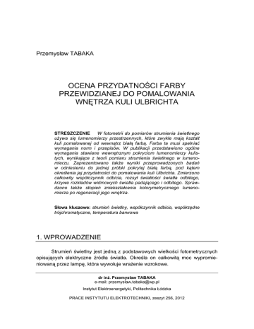 Przemysław TABAKA OCENA PRZYDATNOŚCI FARBY PRZEWIDZIANEJ DO POMALOWANIA WNĘTRZA KULI ULBRICHTA STRESZCZENIE W fotometrii do pomiarów strumienia świetlnego używa się lumenomierzy przestrzennych, które zwykle mają kształt kuli pomalowanej od wewnątrz białą farbą. Farba ta musi spełniać wymagania norm i przepisów. W publikacji przedstawiono ogólne wymagania stawiane wewnętrznym pokryciom lumenomierzy kulistych, wynikające z teorii pomiaru strumienia świetlnego w lumenomierzu. Zaprezentowano także wyniki przeprowadzonych badań w odniesieniu do jednej próbki pokrytej białą farbą, pod kątem określenia jej przydatności do pomalowania kuli Ulbrichta. Zmierzono całkowity współczynnik odbicia, rozsył światłości światła odbitego, krzywe rozkładów widmowych światła padającego i odbitego. Sprawdzono także stopień zniekształcenia kolorymetrycznego lumenomierza po regeneracji jego wnętrza. Słowa kluczowe: strumień świetlny, współczynnik odbicia, współrzędne trójchromatyczne, temperatura barwowa 1. WPROWADZENIE Strumień świetlny jest jedną z podstawowych wielkości fotometrycznych opisujących elektryczne źródła światła. Określa on całkowitą moc wypromieniowaną przez lampę, która wywołuje wrażenie wzrokowe. dr inż. Przemysław TABAKA e-mail: [email protected] Instytut Elektroenergetyki, Politechnika Łódzka PRACE INSTYTUTU ELEKTROTECHNIKI, zeszyt 256, 2012 88 P. Tabaka W praktyce przyjmuje się, że wrażenia świetlne odbierane przez oko ludzkie, wywołuje promieniowanie elektromagnetyczne o długości fali w zakresie 380÷780 nm. Podany przedział ma oczywiście charakter umowny. W warunkach rzeczywistych jego granice mogą ulegać zmianom, w zależności od indywidualnych cech człowieka. Im dane źródło posiada większy strumień świetlny, tym intensywniej świeci. Bardzo często jednak wzrost strumienia świetlnego utożsamiany jest ze wzrostem mocy źródła światła. To, że nie jest to regułą, może świadczyć przykład dwóch świetlówek kompaktowych, jednego z czołowych producentów, o mocach 18 W i 20 W których znamionowy strumień świetlny jest identyczny i wynosi 1200 lm. W większości przypadków kształty brył fotometrycznych elektrycznych źródeł światła (które wynikają z rozkładu luminancji na ich powierzchni) nie spełniają założonych wymagań dotyczących rozsyłu światła. Strumień świetlny wypromieniowany jest zarówno w górną, jak i dolną półprzestrzeń, zachodzi więc potrzeba sztucznego ukształtowania bryły fotometrycznej. Zadanie to realizują m.in. odbłyśniki, w które wyposażone są oprawy oświetleniowe. Niestety, każdemu takiemu procesowi będą towarzyszyły straty (część strumienia świetlnego wysyłanego przez źródło światła zostanie pochłonięta). Taką miarą poniesionych strat dla uzyskania właściwego (pożądanego) rozkładu przestrzennego strumienia świetlnego jest sprawność oprawy oświetleniowej. A zatem pojęcie strumienia świetlnego ma zastosowanie nie tylko w odniesieniu do źródeł światła, ale i także do opraw oświetleniowych. Całkowity strumień świetlny wypromieniowany – czy przez źródło światła, czy przez oprawę oświetleniową – można wyznaczyć w dwojaki sposób: • na postawie przestrzennego rozsyłu światła; • przez pomiar w lumenomierzu przestrzennym. Wyznaczenie strumienia świetlnego pierwszą metodą jest długotrwałe. Dla odwzorowania bryły fotometrycznej zachodzi potrzeba przeprowadzenia wielu pomiarów, w celu wyznaczenia zbioru krzywych światłości, odpowiadających przecięciom półprzestrzeni szeregiem płaszczyzn przechodzących przez oś optyczną (oprawy, czy też źródła światła) i nachylonych względem siebie o zadany kąt. Następnie należy scałkować cząstkowe strumienie będące iloczynami średnich światłości odpowiadających im małych kątów bryłowych. Z przedstawionych powodów w fotometrii zwykle korzysta się z drugiej metody (przez pomiar w lumenomierzu przestrzennym), która w stosunkowo prosty i szybki sposób pozwala wyznaczyć całkowity strumień świetlny. Teoria pomiaru strumienia świetlnego opracowana w latach dwudziestych ubiegłego wieku przez Friedricha Richarda Ulbrichta – profesora Politechniki Drezdeńskiej, okazała się najlepszą i pomimo że od tego czasu minęło już ponad sto lat, jej idea nie uległa zmianie. Do pomiarów strumienia Ocena przydatność farby przewidzianej do pomalowania wnętrza kuli Ulbrichta 89 świetlnego używa się kuli (której wnętrze pokryte jest specjalną białą farbą) oraz źródła odniesienia (wzorca strumienia świetlnego). Zasadę pomiaru strumienia świetlnego opisano w [1, 2, 3]. W wyniku eksploatacji farba, którą pokryte jest wnętrze lumenomierza, ulega stopniowemu starzeniu, dodatkowo na jej powierzchni (zwłaszcza tej dolnej) osadza się kurz. A zatem zachodzi potrzeba cyklicznego odnawiania wewnętrznego pokrycia kuli Ulbrichta. Częstość tych zabiegów jest uzależniona od stopnia używania lumenomierza oraz zapylenia (zakurzenia) pomieszczenia, w którym się on znajduje. Wg literatury [1], regeneracja lumenomierza powinna występować raz na rok. 2. WYMAGANIA JAKOŚCIOWE DLA FARBY DO POKRYCIA WNĘTRZA POWIERZCHNI LUMENOMIERZA U podstaw teorii pomiaru strumienia świetlnego metodą obiektywną leży założenie, że natężenie oświetlenia na okienku pomiarowym kuli Ulbrichta jest proporcjonalne do strumienia świetlnego badanego źródła światła czy oprawy oświetleniowej. Założenie to będzie słuszne, jeśli m.in. farba, którą zostanie pokryte wnętrze lumenomierza, będzie spełniała kilka wymagań jakościowych określonych przez normę [6]. Wymagania sformułowane w punkcie 3.9 normy [6] są następujące: 1. Wewnętrzna powierzchnia kuli powinna być matowa, odbijać w sposób rozproszony, zgodny z prawem Lamberta lub zbliżony do tego rodzaju odbicia i nie wykazywać zjawiska 