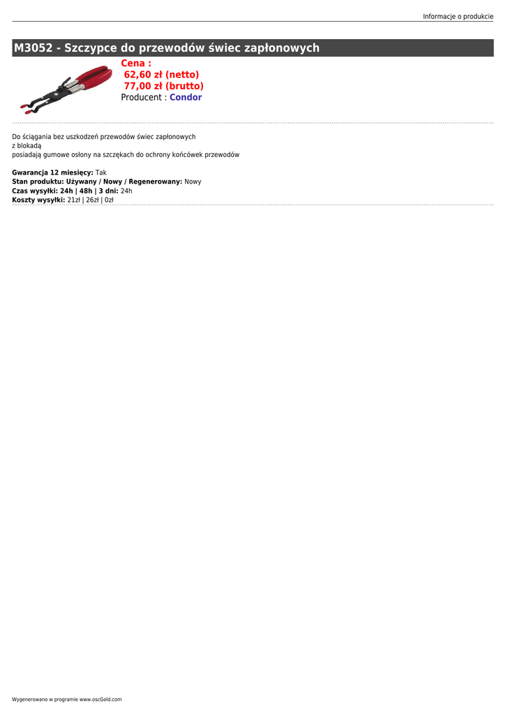 Informacje o produkcie M3052 - Szczypce do przewodów świec zapłonowych Cena : 62,60 zł (netto) 77,00 zł (brutto) Producent : Condor Do ściągania bez uszkodzeń przewodów świec zapłonowych z blokadą posiadają gumowe osłony na szczękach do ochrony końcówek przewodów Gwarancja 12 miesięcy: Tak Stan produktu: Używany / Nowy / Regenerowany: Nowy Czas wysyłki: 24h | 48h | 3 dni: 24h Koszty wysyłki: 21zł | 26zł | 0zł Wygenerowano w programie www.oscGold.com
