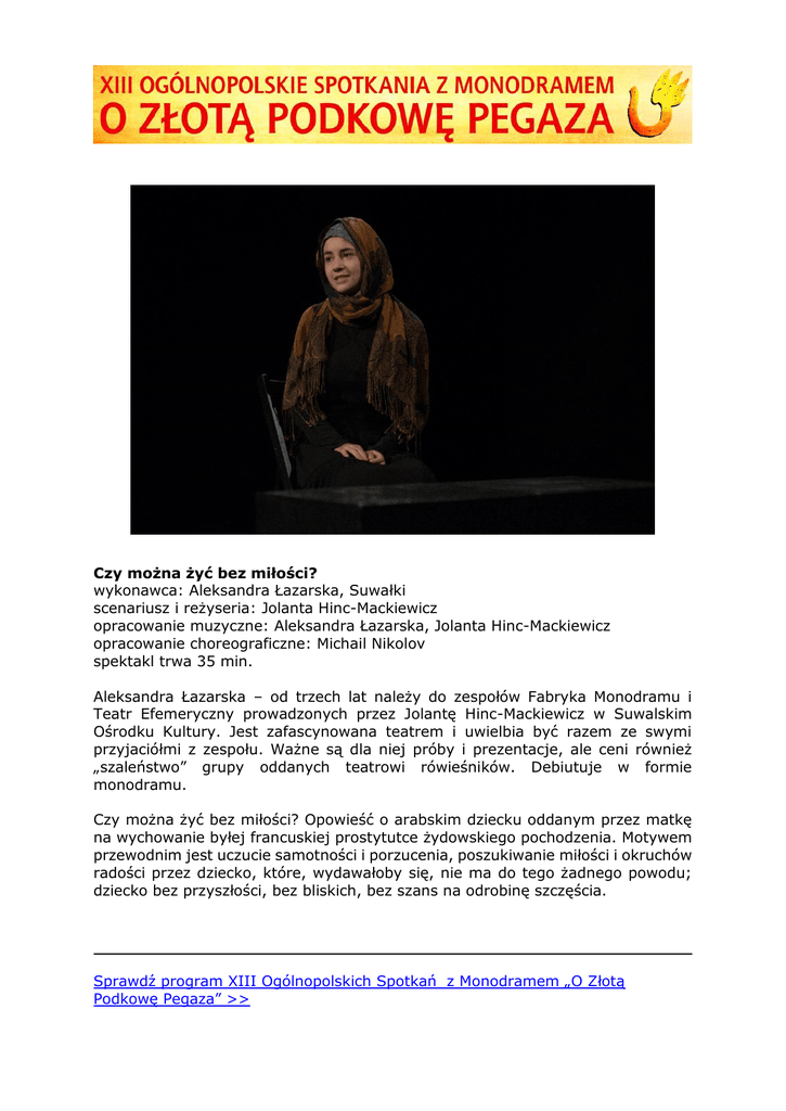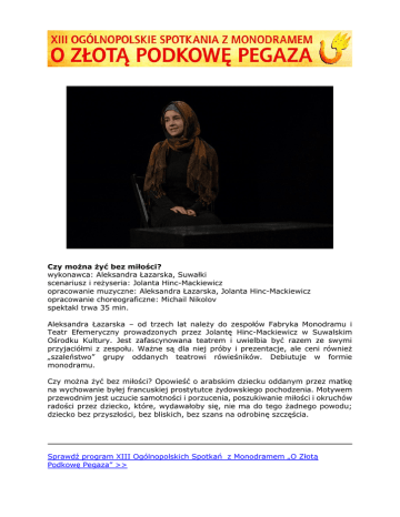 Czy można żyć bez miłości? wykonawca: Aleksandra Łazarska, Suwałki scenariusz i reżyseria: Jolanta Hinc-Mackiewicz opracowanie muzyczne: Aleksandra Łazarska, Jolanta Hinc-Mackiewicz opracowanie choreograficzne: Michail Nikolov spektakl trwa 35 min. Aleksandra Łazarska – od trzech lat należy do zespołów Fabryka Monodramu i Teatr Efemeryczny prowadzonych przez Jolantę Hinc-Mackiewicz w Suwalskim Ośrodku Kultury. Jest zafascynowana teatrem i uwielbia być razem ze swymi przyjaciółmi z zespołu. Ważne są dla niej próby i prezentacje, ale ceni również „szaleństwo” grupy oddanych teatrowi rówieśników. Debiutuje w formie monodramu. Czy można żyć bez miłości? Opowieść o arabskim dziecku oddanym przez matkę na wychowanie byłej francuskiej prostytutce żydowskiego pochodzenia. Motywem przewodnim jest uczucie samotności i porzucenia, poszukiwanie miłości i okruchów radości przez dziecko, które, wydawałoby się, nie ma do tego żadnego powodu; dziecko bez przyszłości, bez bliskich, bez szans na odrobinę szczęścia. Sprawdź program XIII Ogólnopolskich Spotkań z Monodramem „O Złotą Podkowę Pegaza” >>