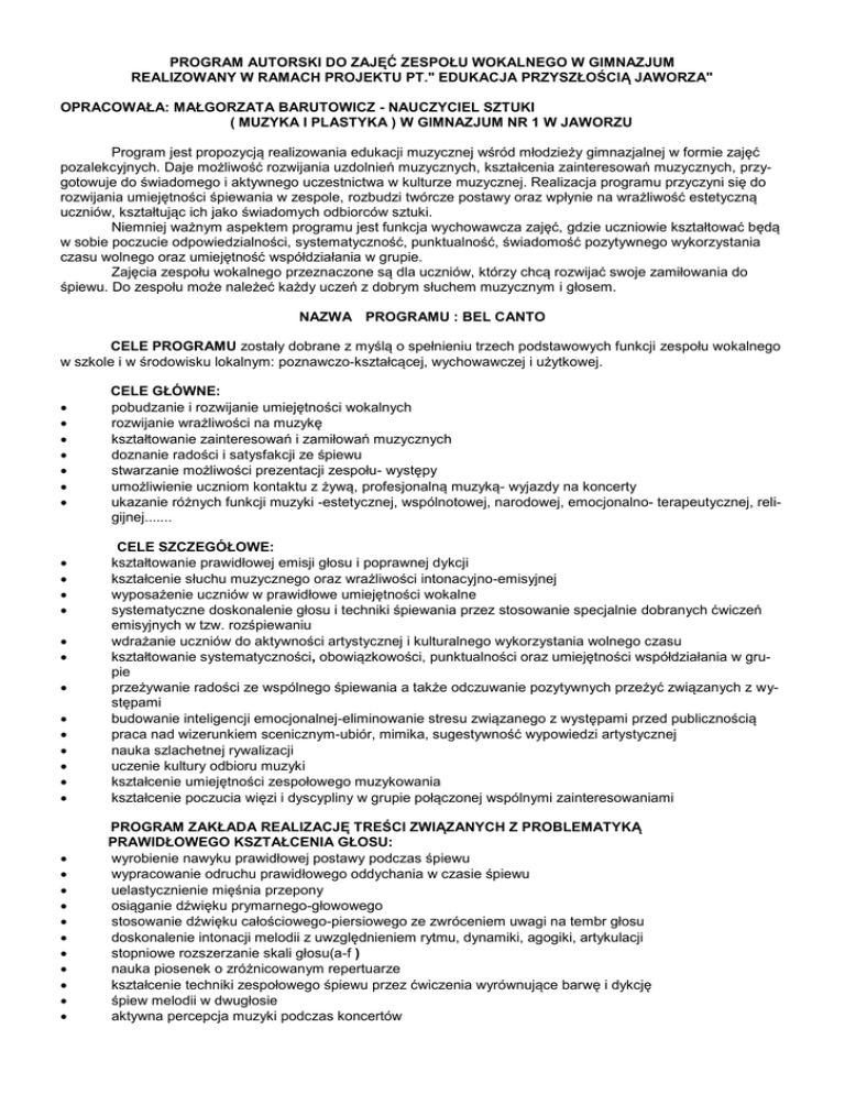 PROGRAM AUTORSKI DO ZAJĘĆ ZESPOŁU WOKALNEGO W GIMNAZJUM REALIZOWANY W RAMACH PROJEKTU PT." EDUKACJA PRZYSZŁOŚCIĄ JAWORZA" OPRACOWAŁA: MAŁGORZATA BARUTOWICZ - NAUCZYCIEL SZTUKI ( MUZYKA I PLASTYKA ) W GIMNAZJUM NR 1 W JAWORZU Program jest propozycją realizowania edukacji muzycznej wśród młodzieży gimnazjalnej w formie zajęć pozalekcyjnych. Daje możliwość rozwijania uzdolnień muzycznych, kształcenia zainteresowań muzycznych, przygotowuje do świadomego i aktywnego uczestnictwa w kulturze muzycznej. Realizacja programu przyczyni się do rozwijania umiejętności śpiewania w zespole, rozbudzi twórcze postawy oraz wpłynie na wrażliwość estetyczną uczniów, kształtując ich jako świadomych odbiorców sztuki. Niemniej ważnym aspektem programu jest funkcja wychowawcza zajęć, gdzie uczniowie kształtować będą w sobie poczucie odpowiedzialności, systematyczność, punktualność, świadomość pozytywnego wykorzystania czasu wolnego oraz umiejętność współdziałania w grupie. Zajęcia zespołu wokalnego przeznaczone są dla uczniów, którzy chcą rozwijać swoje zamiłowania do śpiewu. Do zespołu może należeć każdy uczeń z dobrym słuchem muzycznym i głosem. NAZWA PROGRAMU : BEL CANTO CELE PROGRAMU zostały dobrane z myślą o spełnieniu trzech podstawowych funkcji zespołu wokalnego w szkole i w środowisku lokalnym: poznawczo-kształcącej, wychowawczej i użytkowej. CELE GŁÓWNE: pobudzanie i rozwijanie umiejętności wokalnych rozwijanie wrażliwości na muzykę kształtowanie zainteresowań i zamiłowań muzycznych doznanie radości i satysfakcji ze śpiewu stwarzanie możliwości prezentacji zespołu- występy umożliwienie uczniom kontaktu z żywą, profesjonalną muzyką- wyjazdy na koncerty ukazanie różnych funkcji muzyki -estetycznej, wspólnotowej, narodowej, emocjonalno- terapeutycznej, religijnej....... CELE SZCZEGÓŁOWE: kształtowanie prawidłowej emisji głosu i poprawnej dykcji kształcenie słuchu muzycznego oraz wrażliwości intonacyjno-emisyjnej wyposażenie uczniów w prawidłowe umiejętności wokalne systematyczne doskonalenie głosu i techniki śpiewania przez stosowanie specjalnie dobranych ćwiczeń emisyjnych w tzw. rozśpiewaniu wdrażanie uczniów do aktywności artystycznej i kulturalnego wykorzystania wolnego czasu kształtowanie systematyczności, obowiązkowości, punktualności oraz umiejętności współdziałania w grupie przeżywanie radości ze wspólnego śpiewania a także odczuwanie pozytywnych przeżyć związanych z występami budowanie inteligencji emocjonalnej-eliminowanie stresu związanego z występami przed publicznością praca nad wizerunkiem scenicznym-ubiór, mimika, sugestywność wypowiedzi artystycznej nauka szlachetnej rywalizacji uczenie kultury odbioru muzyki kształcenie umiejętności zespołowego muzykowania kształcenie poczucia więzi i dyscypliny w grupie połączonej wspólnymi zainteresowaniami PROGRAM ZAKŁADA REALIZACJĘ TREŚCI ZWIĄZANYCH Z PROBLEMATYKĄ PRAWIDŁOWEGO KSZTAŁCENIA GŁOSU: wyrobienie nawyku prawidłowej postawy podczas śpiewu wypracowanie odruchu prawidłowego oddychania w czasie śpiewu uelastycznienie mięśnia przepony osiąganie dźwięku prymarnego-głowowego stosowanie dźwięku całościowego-piersiowego ze zwróceniem uwagi na tembr głosu doskonalenie intonacji melodii z uwzględnieniem rytmu, dynamiki, agogiki, artykulacji stopniowe rozszerzanie skali głosu(a-f ) nauka piosenek o zróżnicowanym repertuarze kształcenie techniki zespołowego śpiewu przez ćwiczenia wyrównujące barwę i dykcję śpiew melodii w dwugłosie aktywna percepcja muzyki podczas koncertów REPERTUAR : piosenki popularne i młodzieżowe wybrane przykłady klasyki polskiej muzyki rozrywkowej i musicalowej piosenki-propozycje uczniów Do osiągnięcia wyznaczonych celów przewiduję następujące metody, formy i środki dydaktyczne: METODY: analityczno-percepcyjna ( zaprezentowanie wzoru wykonania oraz przeprowadzenie z uczniami analizy słuchowej w celu świadomego zapamiętania ) ekspresji praktycznego działania występ przed publicznością wycieczka edukacyjna - udział w koncercie w charakterze słuchacza FORMY: praca grupowa i indywidualna ŚRODKI DYDAKTYCZNE: pianino i inny instrument klawiszowy sprzęt audio CD zeszyty-śpiewniki prowadzone przez uczniów, z tekstami piosenek przygotowanymi przez nauczyciela środki pieniężne na zakup biletów i przejazd na koncert REFLEKSJA NAUCZYCIELA Młodzież w wieku gimnazjalnym charakteryzuje wzrost zainteresowań otaczającym światem, wzmożony krytycyzm i duże poczucie tożsamości. Często jednak zainteresowania kulturą, muzyką bywają jednostronne i powierzchowne. Uczniowie ci wyrośli już z wieku dziecięcych piosenek, ale nie stali się jeszcze świadomymi odbiorcami sztuki. Są na etapie poszukiwań i kształtowania gustu muzycznego. Warto więc rozbudzać i rozwijać ich zainteresowania muzyką, literaturą, plastyką, ogólnie sztuką i właściwie kształtować ich wrodzoną wrażliwość. Starając się wyjść naprzeciw ich oczekiwaniom powstał ten program, uwzględniający różnorodność repertuaru.