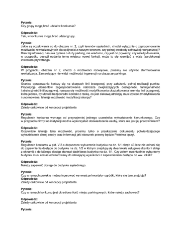 Pytanie: Czy grupy mogą brać udział w konkursie? Odpowiedź: Tak, w konkursie mogą brać udział grupy. Pytanie: Jakie są oczekiwania co do obszaru nr. 2, czyli terenów sąsiednich, chodzi wyłącznie o zaproponowanie możliwości rewitalizacyjnych dla spójności z naszym terenem, czy pełnej swobody całkowitej reorganizacji? Brak tej informacji nasuwa pytanie o duży parking, nie wiadomo, czy jest on prywatny, czy należy do miasta, w przypadku decyzji nadania temu miejscu nowej funkcji, może to się rozmijać z wizją (zarobkową) inwestora prywatnego. Odpowiedź: W przypadku obszaru nr 2, chodzi o możliwości rozwojowe, prosimy nie używać sformułowania rewitalizacja. Zamawiający nie widzi możliwości ingerencji na obszarze parkingu. Pytanie: Granica opracowania kończy się na skarpach linii brzegowej, przy założeniu pełnej realizacji punktu: Propozycję elementów zagospodarowania nabrzeża zwiększających dostępność, funkcjonalność i atrakcyjność linii brzegowej. nasuwa się możliwość modyfikowania ukształtowania terenów linii brzegowej, która jednak, by ułatwić bezpośredni kontakt z rzeką, co jest ciekawą atrakcją, musi zostać zmodyfikowana i unormowana. Istnieje możliwość modyfikacji skarpy? Odpowiedź: Zależy całkowicie od koncepcji projektanta Pytanie: Regulamin konkursu wymaga od przynajmniej jednego uczestnika wykształcenia kierunkowego. Czy w przypadku firmy lub instytucji można wykorzystać doświadczenie osoby, która nie jest jej pracownikiem? Odpowiedź: Oczywiście istnieje taka możliwość, prosimy tylko o przekazanie dokumentu potwierdzającego wykształcenie danej osoby oraz informacji jaki stosunek prawny będzie Państwa łączył. Pytanie: Regulamin konkursu w pkt. V.2.a dopuszcza wyburzenie budynku na dz. 1/1 obręb 43 lecz nie odnosi się do zapewnienia dostępu do budynku na dz. 1/2 w którym znajdują się dwa lokale usługowe (kantor i sklep z oknami) a do którego dostęp stanowi dach/taras budynku na dz. 1/1. Czy zatem ewentualnie wyburzony budynek musi zostać odwzorowany do istniejącej wysokości z zapewnieniem dostępu do ww. lokali? Odpowiedź: Należy zapewnić dostęp do budynku sąsiedniego. Pytanie: Czy w ramach projektu można ingerować we wnętrze kwartału- ogródki, które się tam znajdują? Odpowiedź: Zależy całkowicie od koncepcji projektanta. Pytanie: Czy w ramach konkursu jest określona ilość miejsc parkingowych, które należy zachować? Odpowiedź: Zależy całkowicie od koncepcji projektanta Pytanie: Czy możliwe jest rozszerzenie granicy opracowania na rzekę Olzę? Odpowiedź: Nie przewiduje się rozszerzenia granicy opracowania Pytanie: Czy zostaną udostępnione rzuty budynku przejścia granicznego- potrzebne w przypadku planów jego przebudowy. Odpowiedź: Rzuty dostępne będą na stronie urbanworkshop.eu Pytanie: Na terenie przy ulicy Przykopa w ostatnim czasie powstał parking, została również zbudowana ścieżka rowerowa wzdłuż Alei Łyska i ul. Przykopa. Czy zamawiający udostępnia projekt według którego zostało wykonane zadanie lub aktualna mapę w formacie dwg? Odpowiedź: Zamawiający nie udostępnia materiałów w tym zakresie Pytanie: Czy w koncepcji zagospodarowania terenów przy ul. Przykopa należy uwzględnić ten istniejący parking? Wobec tego do zagospodarowania zostanie raptem mały skwerek na działce nr 6, czy o to chodziło Zamawiającemu? Odpowiedź: Zależy całkowicie od koncepcji projektanta Pytanie: Czy organizator udostępnia dokumentację fotograficzną terenu? Odpowiedź: Organizator nie udostępnia dokumentacji fotograficznej obszaru. Pytanie: Całkowite wyburzenie budynku m.in. na dz.14/3 - 35 m2 i dz. 1/1 - 127 m2 - co się mieści w tej podziemnej części budynku? Odpowiedź: Część podziemna nie jest użytkowana Pytanie: Warunki przewidują możliwość odbudowy budynku w dowolnej formie do wysokości 5 m nad poziomem obecnego fundamentu - czyli od której rzędnej podanej na mapie zasadniczej? Odpowiedź: Prosimy kierować się rzędną 268,82 z mapy zasadniczej Pytanie: W koncepcji zagospodarowania należy uwzględnić m.in. historyczne koncepcje zagospodarowania tego terenu - o które koncepcje, czyjego autorstwa i z jakich lat chodzi? Odpowiedź: Opracowania zostaną zamieszczone na naszej stronie internetowej urbanworshop.eu i BIP UM Cieszyn Pytanie: Organizator może w każdym czasie, przed upływem terminu składania prac konkursowych, zmodyfikować treść Regulaminu - czy dotyczy to części : IV, X i XI ? Odpowiedź: Możliwość modyfikacji regulaminu dotyczy wszystkich jego części Pytanie Część graficzna powinna zawierać koncepcję zagospodarowania pod kątem zachowanej lub nadanej funkcji w skali 1:500 - czy ma to być odrębne opracowanie graficzne na załączniku nr 6 czy w ramach punktu b części graficznej? Odpowiedź: Zgodnie z punktem X. 2. b. ma być to zagospodarowanie obszaru przedstawionego na mapie zasadniczej w skali 1:500, Pytanie: Gdzie mają się znaleźć liczby identyfikacyjne na planszach i w części opisowej - o jakiej wysokości i w którym narożniku, żeby było to jednolite na wszystkich pracach konkursowych? Odpowiedź: Miejsce nie zostało jednoznacznie określone aby uczestnicy mogli umieścić je tam gdzie nie będą zasłaniały istotnych elementów Pytanie: Jak zachować anonimowość przy oddawaniu pracy konkursowej osobiście w UM Cieszyn mając oznakowaną pracę liczbą identyfikacyjną - na opakowaniu i na kopercie ? Komu w Urzędzie Miasta należy oddać pracę tak, aby zachować anonimowość? Odpowiedź: Pracę należy zostawić w Kancelarii Ogólnej, holl, Rynek 1 Pytanie: Kto jest Sekretarzem zespołu konkursowego? Odpowiedź: Sekretarzem zgodnie z zapisami regulaminu konkursu jest Pani Renata Karpińska Pytanie: Umowa o przeniesieniu praw autorskich może dotyczyć praw autorskich majątkowych. Prawa autorskie osobiste są niezbywalne. Czy Organizatorzy przewidzieli w umowie