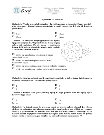 Powiatowy Internetowy Konkurs M@tem@tyczny Mała Liga Zadaniowa Edycja IV Szkoła Podstawowa nr 2 im. Jana Pawła II ul. Wolności 30 87-200 Wąbrzeźno Odpowiedzi do zestawu 5 Zadanie 1. Wanda przecięła kwadratowy kawałek papieru o obwodzie 20 cm i powstały dwa prostokąty. Obwód jednego prostokąta wynosił 16 cm. Jaki był obwód drugiego prostokąta? 9 cm 14 cm 12 cm 16 cm Zadanie 2. W maszynie znajdują się dwa koła zębate (popatrz na rysunek). Większe koło ma 3 razy więcej zębów niż mniejsze. Co się stanie z mniejszym kołem, jeśli większe obróci się jednokrotnie zgodnie z ruchem wskazówek zegara? obróci się jednokrotnie przeciwnie do ruchu wskazówek zegara obróci się trzykrotnie przeciwnie do ruchu wskazówek zegara obróci się trzykrotnie zgodnie z ruchem wskazówek zegara obróci się jednokrotnie zgodnie z ruchem wskazówek zegara Zadanie 3. Jaka jest najmniejsza liczba dzieci w rodzinie, w której każde dziecko ma co najmniej jednego brata i co najmniej jedną siostrę? 2 4 3 5 Zadanie 4. Półtora kota zjada półtorej myszy w ciągu półtora dnia. Ile myszy zje 6 kotów w ciągu 6 dni? 6 18 12 24 Zadanie 5. Na każdej kostce do gry suma oczek na przeciwległych ścianach jest równa siedem. Na pokratkowanej planszy położona jest taka kostka w pozycji jak na rysunku. Kostkę tę przetaczamy na kolejne pola, tak jak wskazują strzałki, obracając ją za każdym razem względem odpowiedniej krawędzi. Jaka będzie liczba oczek na górnej ścianie kostki w momencie, gdy znajdzie się ona na kwadracie oznaczonym *? Powiatowy Internetowy Konkurs M@tem@tyczny Mała Liga Zadaniowa Edycja IV 1 2 3 4 Szkoła Podstawowa nr 2 im. Jana Pawła II ul. Wolności 30 87-200 Wąbrzeźno