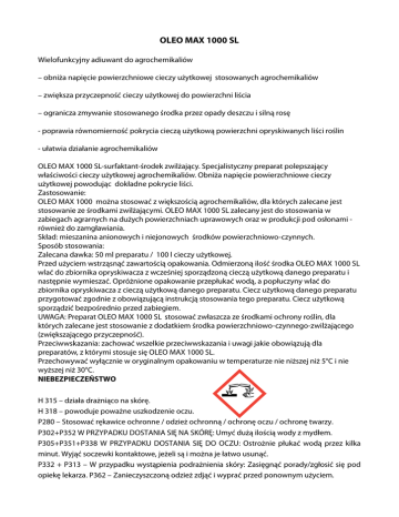 OLEO MAX 1000 SL Wielofunkcyjny adiuwant do agrochemikaliów – obniża napięcie powierzchniowe cieczy użytkowej stosowanych agrochemikaliów – zwiększa przyczepność cieczy użytkowej do powierzchni liścia – ogranicza zmywanie stosowanego środka przez opady deszczu i silną rosę - poprawia równomierność pokrycia cieczą użytkową powierzchni opryskiwanych liści roślin - ułatwia działanie agrochemikaliów OLEO MAX 1000 SL-surfaktant-środek zwilżający. Specjalistyczny preparat polepszający właściwości cieczy użytkowej agrochemikaliów. Obniża napięcie powierzchniowe cieczy użytkowej powodując dokładne pokrycie liści. Zastosowanie: OLEO MAX 1000 można stosować z większością agrochemikaliów, dla których zalecane jest stosowanie ze środkami zwilżającymi. OLEO MAX 1000 SL zalecany jest do stosowania w zabiegach agrarnych na dużych powierzchniach uprawowych oraz w produkcji pod osłonami również do zamgławiania. Skład: mieszanina anionowych i niejonowych środków powierzchniowo-czynnych. Sposób stosowania: Zalecana dawka: 50 ml preparatu / 100 l cieczy użytkowej. Przed użyciem wstrząsnąć zawartością opakowania. Odmierzoną ilość środka OLEO MAX 1000 SL wlać do zbiornika opryskiwacza z wcześniej sporządzoną cieczą użytkową danego preparatu i następnie wymieszać. Opróżnione opakowanie przepłukać wodą, a popłuczyny wlać do zbiornika opryskiwacza z cieczą użytkową danego preparatu. Ciecz użytkową danego preparatu przygotować zgodnie z obowiązującą instrukcją stosowania tego preparatu. Ciecz użytkową sporządzić bezpośrednio przed zabiegiem. UWAGA: Preparat OLEO MAX 1000 SL stosować zwłaszcza ze środkami ochrony roślin, dla których zalecane jest stosowanie z dodatkiem środka powierzchniowo-czynnego-zwilżającego (zwiększającego przyczepność). Przeciwwskazania: zachować wszelkie przeciwwskazania i uwagi jakie obowiązują dla preparatów, z którymi stosuje się OLEO MAX 1000 SL. Przechowywać wyłącznie w oryginalnym opakowaniu w temperaturze nie niższej niż 5°C i nie wyższej niż 30°C. NIEBEZPIECZEŃSTWO H 315 – działa drażniąco na skórę. H 318 – powoduje poważne uszkodzenie oczu. P280 – Stosować rękawice ochronne / odzież ochronną / ochronę oczu / ochronę twarzy. P302+P352 W PRZYPADKU DOSTANIA SIĘ NA SKÓRĘ: Umyć dużą ilością wody z mydłem. P305+P351+P338 W PRZYPADKU DOSTANIA SIĘ DO OCZU: Ostrożnie płukać wodą przez kilka minut. Wyjąć soczewki kontaktowe, jeżeli są i można je łatwo usunąć. P332 + P313 – W przypadku wystąpienia podrażnienia skóry: Zasięgnąć porady/zgłosić się pod opiekę lekarza. P362 – Zanieczyszczoną odzież zdjąć i wyprać przed ponownym użyciem. Okres ważności - 2 lata Zawartość netto : Data produkcji : Nr partii : Producent: SYNTHOS AGRO Sp. z o.o. ul. Chemików 1, 32-600 Oświęcim, tel. +48 33 847 47 77, fax +48 33 847 47 78 www.synthosagro.com e-mail: [email protected]