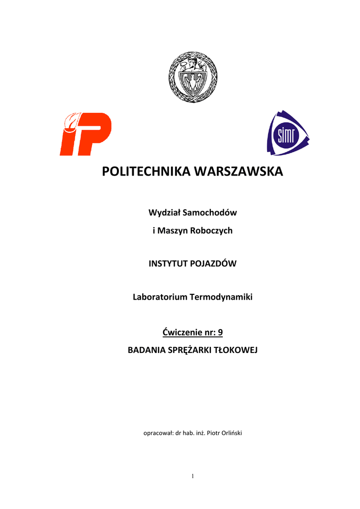 POLITECHNIKA WARSZAWSKA Wydział Samochodów i Maszyn Roboczych INSTYTUT POJAZDÓW Laboratorium Termodynamiki Ćwiczenie nr: 9 BADANIA SPRĘŻARKI TŁOKOWEJ opracował: dr hab. inż. Piotr Orliński 1 CEL ĆWICZENIA Cel ćwiczenia obejmuje indykowanie sprężarki oraz obróbkę wykresu indykatorowego, obliczenie parametrów termodynamicznych i wielkości energetycznych w modelach sprężarek teoretycznych, obliczenie parametrów termodynamicznych i wielkości energetycznych w obiegu sprężarki rzeczywistej oraz analizę właściwości sprężarki rzeczywistej w porównaniu do sprężarek teoretycznych. 1. STANOWISKO BADAWCZE Rys. 1.1. Schemat stanowiska badawczego: 1 - sprężarka tłokowa, 2 - silnik elektryczny trójfazowy, 3 - zbiornik sprężonego powietrza, 4 - indykator mechaniczny, 5 - manometr, 6 – tachometr cyfrowy (pomiar prędkości obrotowej wału), 7 – watomierz Rys. 1.2. Widok sprężarki tłokowej jednocylindrowej wykorzystywanej w badaniach laboratoryjnych 2 Dane techniczne stanowiska badawczego: - dane jednocylindrowej sprężarki tłokowej: - średnica cylindra d = 62 mm, - skok tłoka s = 36 mm, - objętość szkodliwa sprężarki Vsz = 0,05.Vs, - podciśnienie zasysania p1 1. 104 Pa - dane uzupełniające: - sprawność silnika elektrycznego el = 0,6, - sprawność przekładni pasowej p = 0,95, - strata mocy w łożyskach silnika elektrycznego Nop =15 W, - stała watomierza kW = 2 W/działkę, - dane indykatora: - stała ciśnieniowa, podziałka ciśnienia kP = 11528 Pa/mm, DANE POTRZEBNE DO OPRACOWANIA SPRAWOZDANIA Z ĆWICZENIA Podczas wykonywania ćwiczenia dokonuje się następujących pomiarów: ciśnienia w zbiorniku sprężarki - pzb ciśnienia otoczenia - pb temperatury otoczenia - tot prędkości obrotowej sprężarki - n liczby działek na watomierzu - W Na podstawie wykresu indykatorowego oblicza się pole Fwyk odpowiadające pracy indykowanej sprężarki Li. Wyniki pomiarów należy zestawić w tablicy wg wzoru (tablica 1): TABELA 1: Dane pomiarowe: pzb Lp. [MPa] pb [Pa] [mmHg] [Pa] tot n [oC] [obr/min] Liczba działek watomierza W - Fwyk [mm2] 1 2 3 Legenda: pzb [MPa] - ciśnienie manometryczne w zbiorniku, pb [mmHg]- ciśnienie baryczne, tot [st. C] temperatura powietrza, n [obr/min] - prędkość obrotowa wału sprężarki zmierzona tachometrem, Nel [W] - moc elektryczna pobierana przez silnik elektryczny z sieci, Fwyk [mm2] - pole splanimetrowanej powierzchni wykresu indykatorowego. 3 2. WPROWADZENIE Sprężarka jest to maszyna robocza, której celem jest dostarczenie gazów lub par cieczy o podwyższonym ciśnieniu. Gazy sprężone są potrzebne w wielu dziedzinach techniki, poza tym sprężarki często są częścią bardziej złożonych urządzeń, np. chłodziarek, turbin gazowych i innych. Podstawowymi wielkościami określającymi i charakteryzującymi proces sprężania w sprężarkach rzeczywistych są: stosunek ciśnienia końcowego do ciśnienia początkowego, nazywany stosunkiem sprężania lub sprężem, ciśnienie i temperatura końcowa czynnika tłoczonego, ilość czynnika przetłaczanego przez sprężarkę w jednostce czasu - tzw. wydatek, zapotrzebowanie energii na jednostkę masy (kg) lub objętości (m3) sprężonego czynnika oraz stosunek ilości czynnika rzeczywiście przetłoczonego na jeden obrót wału sprężarki do ilości czynnika odpowiadającej objętości teoretycznej sprężarki - tzw. współczynnik przetłaczania lub rzeczywisty współczynnik wydatku . 2.1. TYPY SPRĘŻAREK Sprężarki w których sprężanie odbywa się okresowo zaliczane są do sprężarek wyporowych. W zależności od sposobu realizacji procesu sprężania, dzieli się je następująco: sprężarki tłokowe - proces sprężania zachodzi w cylindrze, w którym porusza się tłok ruchem posuwisto-zwrotnym, sprężarki rotacyjne - proces sprężania realizowany jest za pomocą elementów wirujących, przez które gaz przepływa w sposób ciągły. Sprężarki te dzielą się z kolei na: łopatkowe, o jednym tłoku wykonującym ruch obrotowy – Rotasco oraz o dwóch tłokach wykonujących ruch obrotowy - Rootsa oraz sprężarki śrubowe. Sprężarki w których ciśnienie końcowe czynnika tłoczonego osiągane jest w jednym procesie sprężania noszą nazwę sprężarek jednostopniowych. Natomiast sprężarki w których ciśnienie końcowe osiągane jest w kilku kolejnych procesach sprężania pomiędzy którymi następuje ochładzanie czynnika - to sprężarki wielostopniowe. 2.2. ROZWIĄZANIA KONSTRUKCYJNE Sprężarki tłokowe dzielone są na: jednostopniowe i wielostopniowe - w zależności od liczby stopni sprężania, jednostronnego lub dwustronnego działania - w zależności od tego, czy tłok spręża gaz po jednej czy po dwóch stronach, chłodzone powietrzem lub wodą, bezwodzikowe i wodzikowe - w zależności od tego czy układ korbowy zawiera wodzik czy nie. 4 Rys. 2.1. Sprężarka tłokowa jednocylindrowa (nasz obiekt badań): 1 - koło pasowe z żebrami, 2- cylinder, 3 - głowica, 4 - filtr powietrza, 5 - tłok, 6 - wał korbowy, 7 - korbowód, 8 - zawór ssący, 9 - zawór wylotowy W małych i średnich sprężarkach stosowane są układy cylindrów stojące lub widlaste. W średnich i dużych sprężarkach wolnobieżnych stosuje się układ kątowy w kształcie litery L lub układy leżące. Cylindry sprężarek chłodzonych powietrzem są użebrowane, a na wale korbowym umieszcza się wentylator powodujący wymuszony przepływ powietrza tak, aby omywało użebrowanie, chłodząc tym samym cylindry. Cylindry sprężarek chłodzonych wodą otoczone są płaszczem wodnym, stanowiącym część wodnego układu chłodzenia sprężarki z wymuszonym obiegiem wody. Zaletą sprężarek chłodzonych powietrzem w porównaniu ze sprężarkami chłodzonymi wodą jest brak wodnego układu chłodzenia co umożliwia ich pracę przy temperaturze otoczenia niższej od 0C. Wadą jest mniejsza intensywność chłodzenia (większy wykładnik politropy s
