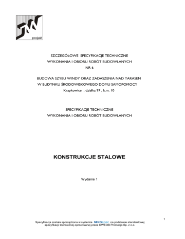 SZCZEGÓŁOWE SPECYFIKACJE TECHNICZNE WYKONANIA I OBIORU ROBÓT BUDOWLANYCH NR 6 BUDOWA SZYBU WINDY ORAZ ZADASZENIA NAD TARASEM W BUDYNKU ŚRODOWISKOWEGO DOMU SAMOPOMOCY Krapkowice , działka 97 , k.m. 10 SPECYFIKACJE TECHNICZNE WYKONANIA I OBIORU ROBÓT BUDOWLANYCH KONSTRUKCJE STALOWE Wydanie 1 1 Specyfikacja została sporządzona w systemie SEKOspec SEKOspec na podstawie standardowej specyfikacji technicznej OWEOB opracowanej Promocjaprzez Sp. zOWEOB o.o. 2005Promocja Sp. z o.o. 6 .SZCZEGÓŁOWA SPECYFIKACJA TECHNICZNA B.07.00.00 KONSTRUKCJE STALOWE 1. Wstęp 1.1. Przedmiot SST Przedmiotem niniejszej szczegółowej specyfikacji technicznej są wymagania dotyczące wykonania i odbioru konstrukcji stalowych. 1.2. Zakres stosowania SST Szczegółowa specyfikacja techniczna jest stosowana jako dokument przetargowy i kont-raktowy przy zlecaniu i realizacji robót wymienionych w pkt. 1.1. 1.3. Zakres robót wymienionych w SST Roboty których dotyczy specyfikacja obejmują wszystkie czynności umoŜliwiające i mają-ce na celu wykonanie i montaŜ konstrukcji stalowych, występujących w obiekcie przetar-gowym. 1.4. Określenia podstawowe Określenia podane w niniejszej SST są zgodne z obowiązującymi odpowiednimi normami i wytycznymi. 1.5. Ogólne wymagania dotyczące robót Wykonawca robót jest odpowiedzialny za jakość wykonania robót, ich zgodność z dokumentacją projektową, SST i poleceniami InŜyniera. 2. Materiały 2.1. Stal Do konstrukcji stalowych stosuje się: 2.1.1 Wyroby walcowane gotowe ze stali klasy 1 w gatunkach St3S; St3SX; St3SY wg PN-EN 10025:2002 (1) Dwuteowniki wg PN-EN 10024:1998 Dwuteowniki dostarczane są o długościach: do 140 mm - 3 do 13 m; powyŜej 140 mm - 3 do 15 m z odchyłkami do 50 mm dla długości do 6,0 m; do 100 mm dla długości większej. Dopuszczalna krzywizna do 1.5 mm/m. (2) Ceowniki wg PN-EN 10279:2003 Ceowniki dostarczane są o długościach: do 80 mm - 3 do 12 m; 80 do 140 - 3-13 m powyŜej 140 mm -3 do 15 m z odchyłkami: do 50 mm dla długości do 6.0 m; do 100 mm dla długości większej. Dopuszczalna krzywizna 1.5 mm/m. (3) Kątowniki PN-EN 10056-2:1998 i w PN-EN 10056-1:2000 Kątowniki dostarczane są o długościach:do 45 mm - 3 do 12 m; powyŜej 45 - 3 do 15 m z odchyłkami do 50 mm dla długoś-ci do 4,0 m; do 100 mm dla długości większej. Krzywizna ramion nie powinna przekraczać 1 mm/m. (4) Blachy a) Blachy uniwersalne wg PN-H/92203:1994 Blachy uniwersalne dostarcza się w grubościach 6-40 mm. szerokościach 160-700 mm i długościach: dla grubości do 6 mm - 6.0 m dla grubości 8-25 mm - do 14,0 m z odchyłką do 250 mm. Tolerancje wymiarowe wg ww. normy b) Blachy grube wg PN-80/H-92200 Blachy grube dostarcza się w grubościach 5-140 mm. Zakres grubości Zalecane formaty mm mm 5-12 1000x2000 1250x2500 1500x3000 1000x4000 1250x5000 1500x6000 1000x6000 powyŜej 12 1000x2000 1250x2500 1750x3500 1500x6000 1500x3000 Tolerancje wymiarowe wg ww. normy Specyfikacja została sporządzona w systemie SEKOspec SEKOspec na podstawie standardowej specyfikacji technicznej OWEOB opracowanej Promocjaprzez Sp. zOWEOB o.o. 2005Promocja Sp. z o.o. 2 Uwaga: do produkcji elementów z blach a szczególnie blach węzłowych zaleca się stosowanie blach grubych. c) Blacha Ŝebrowana wg PN-73/H-92127 Blachę Ŝebrowaną dostarcza się w grubościach 3,5-8,0 mm. Zalecane wymiary: 1000x2000 mm; 1250x2500 mm; 1500x3000 mm. Tolerancje wymiarowe wg ww normy. d) Bednarka wg PN-76/H-92325 Bednarkę dostarcza się w grubościach 1.5-5 mm i szerokościach 20-200 mm w kręgach o masie: - przy szerokości do 30 mm - do 60 kg - przy szerokości 30 do 50 mm - do 100 kg - przy szerokości 50 do 100 mm - do 120 kg Tolerancje wymiarowe wg ww normy. e) Pręty okrągłe wg PN-75/H-93200/00 Pręty dostarcza się o długościach: - przy średnicy do 25 mm - 3-10 m - przy średnicy do 25 do 50 mm - 3-9 m. Tolerancje wymiarowe wg ww normy. 2.1.2. Kształtowniki zimnogięte. Wykonywane są jako otwarte (ceowniki, kątowniki, zetowniki) oraz zamknięte (rury kwadratowe i okrągłe). Produkuje się je ze stali konstrukcyjnej węglowej zwykłej jakości StOS, St3SX, St3SY. Długości fabrykacyjne od 2 do 6 m przy zwiększonej dokładności wykona-nia. 2.1.3. Własności mechaniczne i technologiczne powinny odpowiadać wymaganiom podanym w PN-EN 10025:2002. - Wady powierzchniowe - powierzchnia walcówki i prętów powinna być bez pęk-nięć, pęcherzy i naderwań. - Na powierzchniach czołowych niedopuszczalne są pozostałości jamy usadowej, rozwarstwienia i pęknięcia widoczne gotym okiem. - Wady powierzchniowe takie jak rysy, drobne łuski i zawalcowania, wtrącenia nie-metaliczne, wŜery, wypukłości, wgniecenia, zgorzeliny i chropowatości są do-puszczalne jeŜeli: - mieszczą się w granicach dopuszczalnych odchyłek - nie przekraczają 0.5 mm dla walcówki o grubości od 25 mm. 0,7 mm dla walcówki o grubości większej. 2.1.4. Odbiór stali na budowie powinien być dokonany na podstawie atestu, w który po-winien być zaopatrzony kaŜdy element !ub partia materiału. Atest powinien za-wierać: - znak wytwórcy - profil - gatunek stali - numer wyrobu lub partii - znak obróbki cieplnej Cechowanie materiałów wywalcowane na profilach lub na przywieszkach meta-lowych. 2.1.5. Odbiór konstrukcji na budowie winien być dokonany na podstawie protokółu ostatecznego odbioru konstrukcji w wytwórni wraz z oświadczeniem wytwórni, Ŝe usterki w czasie odbiorów międzyoperacyjnych zostały usunięte. Cechowanie elementów farbą na elemencie. .2. Łączniki Jako łączniki występują: połączenia spawane oraz połączenia na śruby. 2.2.1. Materiały do spawania Do spawania konstrukcji ze stali zwykłej stosuje się spawanie elektryczne przy uŜy-ciu elektrod otulonych EA-146 wg PN-91/M-69430. Zastępczo moŜna stosować elektrody ER-346 lub ER-546. Elektrody EA-146 są to elektrody grubootulone przeznaczone do spawania konst-rukcji stalowych naraŜonych na obciąŜ