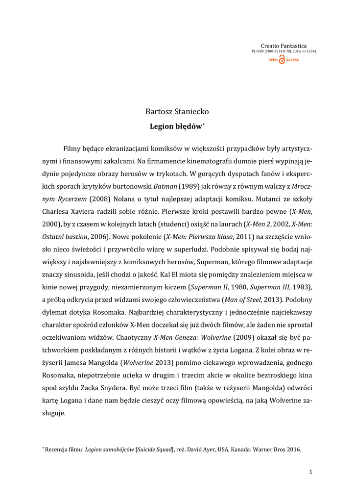 Creatio Fantastica PL ISSN: 2300-2514 R. XII, 2016, nr 3 (54) Bartosz Staniecko Legion błędów ∗ Filmy będące ekranizacjami komiksów w większości przypadków były artystycz- nymi i finansowymi zakalcami. Na firmamencie kinematografii dumnie pierś wypinają jedynie pojedyncze obrazy herosów w trykotach. W gorących dysputach fanów i eksperc- kich sporach krytyków burtonowski Batman (1989) jak równy z równym walczy z Mrocz- nym Rycerzem (2008) Nolana o tytuł najlepszej adaptacji komiksu. Mutanci ze szkoły Charlesa Xaviera radzili sobie różnie. Pierwsze kroki postawili bardzo pewne (X-Men, 2000), by z czasem w kolejnych latach (studenci) osiąść na laurach (X-Men 2, 2002, X-Men: Ostatni bastion, 2006). Nowe pokolenie (X-Men: Pierwsza klasa, 2011) na szczęście wnio- sło nieco świeżości i przywróciło wiarę w superludzi. Podobnie spisywał się bodaj największy i najsławniejszy z komiksowych herosów, Superman, którego filmowe adaptacje znaczy sinusoida, jeśli chodzi o jakość. Kal El miota się pomiędzy znalezieniem miejsca w kinie nowej przygody, niezamierzonym kiczem (Superman II, 1980, Superman III, 1983), a próbą odkrycia przed widzami swojego człowieczeństwa (Man of Steel, 2013). Podobny dylemat dotyka Rosomaka. Najbardziej charakterystyczny i jednocześnie najciekawszy charakter spośród członków X-Men doczekał się już dwóch filmów, ale żaden nie sprostał oczekiwaniom widzów. Chaotyczny X-Men Geneza: Wolverine (2009) okazał się być patchworkiem poskładanym z różnych historii i wątków z życia Logana. Z kolei obraz w reżyserii Jamesa Mangolda (Wolverine 2013) pomimo ciekawego wprowadzenia, godnego Rosomaka, niepotrzebnie ucieka w drugim i trzecim akcie w okolice beztroskiego kina spod szyldu Zacka Snydera. Być może trzeci film (także w reżyserii Mangolda) odwróci kartę Logana i dane nam będzie cieszyć oczy filmową opowieścią, na jaką Wolverine zasługuje. ∗ Recenzja filmu: Legion samobójców [Suicide Squad], reż. David Ayer, USA, Kanada: Warner Bros 2016. 1 Innego podejścia do superherosów próbował Zack Snyder, który swoim trzecim filmem dokonał dekonstrukcji superbohaterskiego mitu opierając swój obraz na kanwie klasycznej już noweli graficznej Alana Moore’a Watchmen. Snyder kreśli przed nami dojrzałą wizję ludzi, których przygniata odpowiedzialność, jaką wzięli na swoje barki. Ekranizacja okazała się artystycznym sukcesem, krytycy chwalili odwagę i zmysł reżyserski autora Świtu żywych trupów, jednak film został zauważony tylko przez wąskie grono fanów komiksowych opowieści. Stan ten zmieniły kolejne filmy ze stajni Marvela (trylogia Iron Man, seria Aven- gers), których prosta (nie mylić z prostacką) konstrukcja okazała się strzałem w dzie- siątkę światowego box office’u. Od tego czasu Marvel wraz z Disneyem niepodzielnie rządzą światem komiksowych blockbusterów, gdy tymczasem DC wraz z Warner Bros. szuka sposobu, by zdetronizować konkurencję. Jednak od czasu sukcesu nolanowskiego Mrocz- nego Rycerza Detective Comics wciąż ponosi artystyczne i finansowe porażki. Komplet- nym fiaskiem okazała się być ekranizacja Batman vs Superman. Świt sprawiedliwości (2016), która miała ogromny potencjał stać się finansowym, jeśli nie artystycznym hitem. Starcie dwóch ikonicznych postaci uniwersum DC, fundamenty w postaci komiksu Franka Millera, dawały nadzieję, że otrzymamy wspaniałe widowisko, będące jednocześnie przeciwwagą dla beztroskich i utrzymanych w lekkim komediowym tonie filmów Marvela. Niestety po raz kolejny doświadczyliśmy porażki. Film okazał się klapą finansową i artystyczną. Scenariusz był niespójny, tempo rwane, motywacje bohaterów niezrozumiałe, a finałowy pojedynek rozczarowujący. Jedynie skazywany na pożarcie Ben Affleck sprostał z nawiązką wymaganiom i dostarczył nam Batmana, który wzbudza aplauz i zachwyt. Po tak sromotnej porażce finansowej DC spróbowało nowego podejścia. A co by było, gdybyśmy spróbowali zrobić film o anty superbohaterach? Pomysł niekiepski i całkiem świeży, bo do tej pory kompletnie nieeksplorowany (nie licząc trzech ekranizacji przygód Franka Castle’a vel Punishera). Padło na Legion samobójców, grupę złożoną z przestępców, zwyrodnialców i łotrów cechujących się nie tylko niestabilną psychiką, ale także nadnaturalnymi mocami. W skład komanda wchodzi naprawdę barwna galeria postaci: mamy tu ukochaną Jokera, Harley Quinn, snajpera Deadshota, Kapitan Boomeranga, Killer Croca, Enchantress, Rick Flaga, Slipknota oraz El Diablo posiadającego zdolności bliskie tym, którymi dysponuje Human Torch z Fantastycznej czwórki. 2 Główny wątek fabularny zasadza się wokół zbuntowanej Enchantress i próbie jej pacyfikacji przez tytułowych samobójców. Harley, Deadshot i spółka są więc swego ro- dzaju echem Parszywej dwunastki z tą różnicą, że oddział dowodzony 49 lat temu przez Lee Marvina nie popełniał tylu błędów w sztuce wojennej i filmowej. Niewiele dobrego można napisać o filmie Davida Ayera. Punktem wyróżniającym się jest Harley Quinn. Margot Robbie miała pomysł na zagranie pani doktor, która oszalała na punkcie swojego zielonowłosego pacjenta. Fantastycznie odnalazła się w tej kreacji i stworzyła przecudownie szaloną Harley. Gdyby nie strona formalna, która przesadnie eksponowała i skupiała się na jej aspektach fizycznych, to Harley, mimo, że niestabilna psychicznie, mogłaby być kolejnym świetnym przykładem women empowerment w kinie fantastycznonaukowym i przyciągnąć do ekranów całe rzesze młodych dziewcząt. Drugim jasnym punktem jest muzyka. Bardzo dobrze dobrana, ale niestety z nie- wiadomych względów wręcz zmasakrowana nieudolnym montażem obrazu i dźwięku. Sceny z utworami muzycznymi nie posiadają tej siły i energii, którymi cechowały się re- welacyjne przecież pod tym względem zwiastuny. Gdyby 