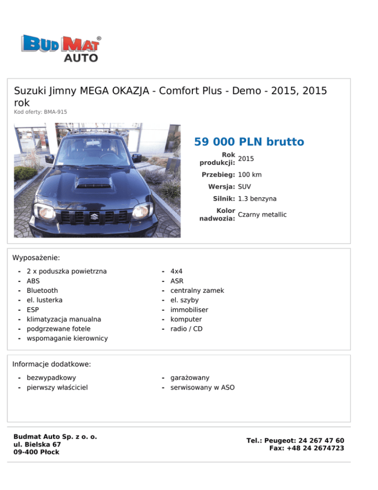 Suzuki Jimny MEGA OKAZJA - Comfort Plus - Demo - 2015, 2015 rok Kod oferty: BMA-915 59 000 PLN brutto Rok 2015 produkcji: Przebieg: 100 km Wersja: SUV Silnik: 1.3 benzyna Kolor Czarny metallic nadwozia: Wyposażenie: - 2 x poduszka powietrzna ABS Bluetooth el. lusterka ESP klimatyzacja manualna podgrzewane fotele wspomaganie kierownicy - 4x4 ASR centralny zamek el. szyby immobiliser komputer radio / CD Informacje dodatkowe: - bezwypadkowy - pierwszy właściciel Budmat Auto Sp. z o. o. ul. Bielska 67 09-400 Płock - garażowany - serwisowany w ASO Tel.: Peugeot: 24 267 47 60 Fax: +48 24 2674723