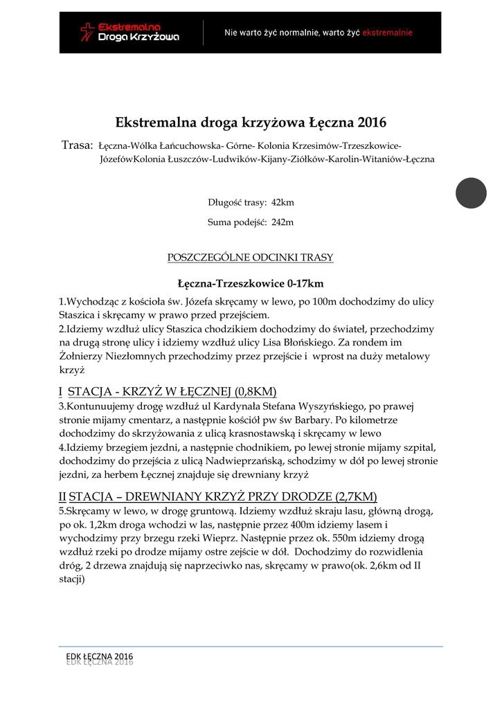 Ekstremalna droga krzyżowa Łęczna 2016 Trasa: Łęczna-Wólka Łańcuchowska- Górne- Kolonia Krzesimów-TrzeszkowiceJózefówKolonia Łuszczów-Ludwików-Kijany-Ziółków-Karolin-Witaniów-Łęczna Długość trasy: 42km Suma podejść: 242m 1 POSZCZEGÓLNE ODCINKI TRASY Łęczna-Trzeszkowice 0-17km 1.Wychodząc z kościoła św. Józefa skręcamy w lewo, po 100m dochodzimy do ulicy Staszica i skręcamy w prawo przed przejściem. 2.Idziemy wzdłuż ulicy Staszica chodzikiem dochodzimy do świateł, przechodzimy na drugą stronę ulicy i idziemy wzdłuż ulicy Lisa Błońskiego. Za rondem im Żołnierzy Niezłomnych przechodzimy przez przejście i wprost na duży metalowy krzyż I STACJA - KRZYŻ W ŁĘCZNEJ (0,8KM) 3.Kontunuujemy drogę wzdłuż ul Kardynała Stefana Wyszyńskiego, po prawej stronie mijamy cmentarz, a następnie kościół pw św Barbary. Po kilometrze dochodzimy do skrzyżowania z ulicą krasnostawską i skręcamy w lewo 4.Idziemy brzegiem jezdni, a następnie chodnikiem, po lewej stronie mijamy szpital, dochodzimy do przejścia z ulicą Nadwieprzańską, schodzimy w dół po lewej stronie jezdni, za herbem Łęcznej znajduje się drewniany krzyż II STACJA – DREWNIANY KRZYŻ PRZY DRODZE (2,7KM) 5.Skręcamy w lewo, w drogę gruntową. Idziemy wzdłuż skraju lasu, główną drogą, po ok. 1,2km droga wchodzi w las, następnie przez 400m idziemy lasem i wychodzimy przy brzegu rzeki Wieprz. Następnie przez ok. 550m idziemy drogą wzdłuż rzeki po drodze mijamy ostre zejście w dół. Dochodzimy do rozwidlenia dróg, 2 drzewa znajdują się naprzeciwko nas, skręcamy w prawo(ok. 2,6km od II stacji) EDK ŁĘCZNA 2016 6.Po skręcie przechodzimy przez prowizoryczny mostek z europalet, idziemy prosto, po obu naszych stronach mijamy kępy krzaków. Po 400m dochodzimy do małego drewnianego mostku nad kanałem, skręcamy w prawo i przechodzimy przez niego. Idziemy prosto przez 90m, dochodzimy do pasa drzew, lekko skręcamy w lewo i przechodzimy przez nie. Idziemy prosto przez ok. 110m kierując się w stronę metalowego mostu na rzece Wieprz. 7. Za mostem idziemy prosto kierując się w stronę zabudowań. Dochodzimy do skrzyżowania z drogą asfaltową. Skręcamy w lewo i idziemy wzdłuż drogi, mijamy 2 przystanek autobusowy, dochodzimy do słupa latarni nr33, po prawej stronie widzimy drewniany dom z brązowym ogrodzeniem i drewnianym krzyżem przed nim III STACJA – KRZYŻ W WÓLCE ŁAŃUCHOWSKIEJ 8.Za krzyżem wchodzimy w drogę gruntową. Idziemy 2km prosto, do skrzyżowania z drogą asfaltową. Przechodzimy przez ulicę i po prawej stronie mijamy kapliczkę. Idziemy dalej prosto drogą asfaltową 1km i dochodzimy do skrzyżowania z drogą gruntową po lewej stronie znajduje się metalowy krzyż IV STACJA – KRZYŻ W GÓRNYM 9.Idziemy drogą asfaltową i po 30m odbijamy lekko w lewo w drogę gruntową. Idziemy prosto ok. 1km i dochodzimy do rozwidlenia, skręcamy w prawo, mijamy staw po prawej stronie, dochodzimy do skrzyżowania i idziemy prosto. Po 700m dochodzimy do kolejnego rozwidlenia, skręcamy w lewo. Idziemy ok. 1km prosto, dochodzimy do skrzyżowania i krzyża w drzewach V STACJA – KRZYŻ W DRZEWACH 10.Przy krzyżu skręcamy w lewo PAMIĘTAJ SKĄD PRZYSZEDŁEŚ!!! Idziemy prosto, dochodzimy do skrzyżowania przy słupie energetycznym nr 49/3, skręcamy w prawo. Po 1km dochodzimy do kolejnego skrzyżowania ze słupem i lampą LED(nie zawsze świeci), skręcamy w prawo w drogę asfaltową. Idziemy prosto, dochodzimy do kapliczki po lewej stronie i skręcamy w prawo. Po ok 300m dochodzimy do kolejnego skrzyżowania, po prawej stronie widzimy krzyż, skręcamy w lewo. Idziemy prosto, po ok. 800m po prawej stronie w brzózkach znajduje się krzyż VI STACJA – KRZYŻ W BRZÓZKACH-TRZESZKOWICE EDK ŁĘCZNA 2016 Trzeszkowice-Kijany 17-32km 1.Idziemy dalej prosto, droga skręcamy łukiem w prawą stronę i po 100m dochodzimy do skrzyżowania, idziemy lekko w prawo i prosto, po lewej stronie mijamy dużą remizę. Przechodzimy przez most i dochodzimy do skrzyżowania w Trzeszkowicach. Skręcamy w lewo, a następnie po 30m w prawo, po lewej stronie sklep, przed sklepem altana. Idziemy drogą, aż dojdziemy do skrzyżowania ze znakiem „Józefów 2” po lewej stronie, skręcamy w prawo. Po 1,5km mijamy krzyż 3 po lewej stronie. Idziemy prosto przez 1km aż do skrzyżowania z drogą asfaltową. Przy skrzyżowaniu pod drzewem znajduje się krzyż. VII STACJA – KRZYŻ W JÓZEFOWIE 12. Idziemy prosto drogą gruntową skrajem lasu i częściowo w lesie przez ok. 2km. Wychodząc z lasu na drogę skręcamy w lewo. Idziemy prosto przez ok. 1,3km(żółtym szlakiem turystycznym). Skręcamy w prawo, a po 200m w lewo(tak jak żółty szlak). Idziemy prosto, aż do lasu, wchodzimy w las i idziemy wciąż żółtym szlakiem. Wychodzimy z lasu na asfalt przy zielonym szlabanie. Idziemy ulicą prosto przez 1km. Dochodzimy do skrzyżowania i po prawej stronie widzimy krzyż. VIII STACJA – KRZYŻ W KOLONII ŁUSZCZÓW 13.Skręcamy w lewo i idziemy prosto ok. 400m. Dochodzimy do pierwszego skrzyżowania i skręcamy w prawo. Idziemy prosto 800m aż do skrzyżowania z drogą wojewódzką nr 82. Po prawej stronie widzimy drewniany krzyż IX STACJA – KRZYŻ PRZY DRODZE 82 14.Przechodzimy na drugą stronę jezdni, skręcamy w prawo. Idziemy ok. 150m aż do skraju lasu i skręcamy w lewo. Idziemy skrajem lasu i częściowo w lesie przez ok 800m. Wychodzimy z lasu i idziemy po łuku w prawo. Idziemy drogą asfaltową przez ok. 1km i dochodzimy do rozwidlenia. Skręcamy w prawo, idziemy cały czas tą drogą, po ok. 300m skręcamy w prawo, a następnie po 100m w prawo(tak jak prowadzi nas asfalt). Idziemy prosto przez ok. 500m i skręcamy w lewo. Idziemy 300m prosto i dochodzimy do skrzyżowania, przy którym znajduje się metalowy krzyż. EDK ŁĘCZNA 2016 X STACJA – METALOWY KRZYŻ 15.Kontynuujemy drogę idąc prosto przez ok. 700m. Dochodzimy do rozwidlenia i skręcamy w p