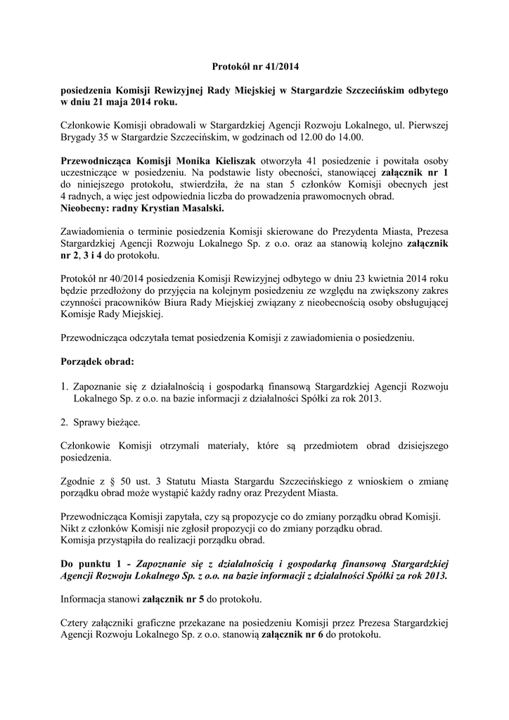 Protokół nr 41/2014 posiedzenia Komisji Rewizyjnej Rady Miejskiej w Stargardzie Szczecińskim odbytego w dniu 21 maja 2014 roku. Członkowie Komisji obradowali w Stargardzkiej Agencji Rozwoju Lokalnego, ul. Pierwszej Brygady 35 w Stargardzie Szczecińskim, w godzinach od 12.00 do 14.00. Przewodnicząca Komisji Monika Kieliszak otworzyła 41 posiedzenie i powitała osoby uczestniczące w posiedzeniu. Na podstawie listy obecności, stanowiącej załącznik nr 1 do niniejszego protokołu, stwierdziła, że na stan 5 członków Komisji obecnych jest 4 radnych, a więc jest odpowiednia liczba do prowadzenia prawomocnych obrad. Nieobecny: radny Krystian Masalski. Zawiadomienia o terminie posiedzenia Komisji skierowane do Prezydenta Miasta, Prezesa Stargardzkiej Agencji Rozwoju Lokalnego Sp. z o.o. oraz aa stanowią kolejno załącznik nr 2, 3 i 4 do protokołu. Protokół nr 40/2014 posiedzenia Komisji Rewizyjnej odbytego w dniu 23 kwietnia 2014 roku będzie przedłożony do przyjęcia na kolejnym posiedzeniu ze względu na zwiększony zakres czynności pracowników Biura Rady Miejskiej związany z nieobecnością osoby obsługującej Komisje Rady Miejskiej. Przewodnicząca odczytała temat posiedzenia Komisji z zawiadomienia o posiedzeniu. Porządek obrad: 1. Zapoznanie się z działalnością i gospodarką finansową Stargardzkiej Agencji Rozwoju Lokalnego Sp. z o.o. na bazie informacji z działalności Spółki za rok 2013. 2. Sprawy bieżące. Członkowie Komisji otrzymali materiały, które są przedmiotem obrad dzisiejszego posiedzenia. Zgodnie z § 50 ust. 3 Statutu Miasta Stargardu Szczecińskiego z wnioskiem o zmianę porządku obrad może wystąpić każdy radny oraz Prezydent Miasta. Przewodnicząca Komisji zapytała, czy są propozycje co do zmiany porządku obrad Komisji. Nikt z członków Komisji nie zgłosił propozycji co do zmiany porządku obrad. Komisja przystąpiła do realizacji porządku obrad. Do punktu 1 - Zapoznanie się z działalnością i gospodarką finansową Stargardzkiej Agencji Rozwoju Lokalnego Sp. z o.o. na bazie informacji z działalności Spółki za rok 2013. Informacja stanowi załącznik nr 5 do protokołu. Cztery załączniki graficzne przekazane na posiedzeniu Komisji przez Prezesa Stargardzkiej Agencji Rozwoju Lokalnego Sp. z o.o. stanowią załącznik nr 6 do protokołu. Zastępca Prezydenta Miasta Andrzej Korzeb powiedział, że Spółka była oceniana za rok 2013 przez Radę Miejską na sesji w dniu 29 kwietnia 2014 roku. Prezes Stargardzkiej Agencji Rozwoju Lokalnego Sp. z o.o. Krzysztof Kowalczyk powiedział, że zgodnie z informacjami zawartymi w sprawozdaniu rocznym, Spółka zajmuje się zadaniami umożliwiającymi wsparcie biznesu, który działa na terenie Stargardzkiego Parku Przemysłowego, czyli na terenach po byłych Zakładach Naprawczych Taboru Kolejowego i terenów zlokalizowanych przy ulicach: Hanzeatyckiej, Stralsundzkiej, Skandynawskiej, Przemysłowej, Nasiennej, Cieplnej, Usługowej, Składowej. Radna Agnieszka Ignasiak zapytała, jakie są plany dotyczące remontu biurowca po byłych Zakładach Naprawczych Taboru Kolejowego, gdzie obecnie znajduje się siedziba Spółki. Prezes Stargardzkiej Agencji Rozwoju Lokalnego Sp. z o.o. Krzysztof Kowalczyk powiedział, że obecnie Spółka złożyła zapotrzebowania na dofinansowanie i czeka na odpowiedź o przyznaniu ewentualnych środków na remont biurowca. Odnowiona została sala konferencyjna oraz utworzony został coworking, czyli stanowiska biurowe na wynajem dla początkujących przedsiębiorców, których nie stać na dzierżawę lokali biurowych. Biurowiec będzie odnawiany stopniowo. Przeprowadzony zostanie między innymi remont łazienek i malowanie korytarzy. Radna Agnieszka Ignasiak powiedziała, że pytanie dotyczyło remontu elewacji, okien i dachu, gdyż to są największe koszty. Radna zapytała również, czy Spółka współpracuje z Funduszem Poręczeń Kredytowych Sp. z o.o. w zakresie pomocy dla przedsiębiorców. Prezes Stargardzkiej Agencji Rozwoju Lokalnego Sp. z o.o. Krzysztof Kowalczyk powiedział, że priorytetem Spółki jest przygotowanie pomieszczeń wewnątrz biurowca, natomiast z czasem i przy współpracy z innymi będzie można wyremontować budynek również i na zewnątrz. Fundusz Poręczeń Kredytowych Sp. z o.o. posiadał środki finansowe w formie niskooprocentowanych pożyczek na poziomie 1%. Znaleźli się przedsiębiorcy, którzy chcieli zainwestować w Stargardzkim Parku Przemysłowym i dzięki temu finansowaniu inwestorzy nie musieli zwracać się o dodatkowe środki do banku komercyjnego. Efektem tej współpracy jest sfinalizowanie transakcji polegającej na tym, że jeden z inwestorów stanął do przetargu, natomiast druga transakcja jest w trakcie realizacji. Radna Agnieszka Ignasiak zapytała, jakie są ceny i zainteresowanie stanowiskami biurowymi coworkingu. Prezes Stargardzkiej Agencji Rozwoju Lokalnego Sp. z o.o. Krzysztof Kowalczyk powiedział, że cena wynosi 199 zł brutto. Jest to cena promocyjna obowiązująca do końca roku. Stanowiska coworkingu nie są przekazywane na stałe i często jest tak, że po sprawdzeniu rynku przedsiębiorcy wynajmują osobny pokój. Obecnie są wynajęte dwa stanowiska. Radna Agnieszka Ignasiak zapytała o ilość stanowisk biurowych i jakie jest obłożenie całego biurowca. 2 Prezes Stargardzkiej Agencji Rozwoju Lokalnego Sp. z o.o. Krzysztof Kowalczyk powiedział, że zakupionych jest sześć biurek, do pewnego czasu cztery były zajęte, po czym dwie osoby zrezygnowały. Jeżeli chodzi o biurowiec, to obłożenie wynosi około 80%. Zastępca Przewodniczącej Komisji Amadou Sy zapytał, co stało się z pracownikami firm BS Vognen i Stal-Kol Sp. z o.o., które ogłosiły upadłość. Prezes Stargardzkiej Agencji Rozwoju Lokalnego Sp. z o.o. Krzysztof Kowalczyk powiedział, że te procesy upadłościowe już trwały, gdy został Prezesem SARL Sp. z o.o. Pracownicy prawdopodobnie znaleźli prac