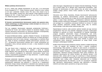 Biblijne podstawy bierzmowania to: Dz 8,17 – Wtedy więc wkładali /Apostołowie/ na nich ręce, a oni otrzymywali Ducha Świętego.Dz 9,17 – Wtedy Ananiasz poszedł. Wszedł do domu, położył na nim ręce i powiedział: «Szawle, bracie, Pan Jezus, który ukazał ci się na drodze, którą szedłeś, przysłał mnie, abyś przejrzał i został napełniony Duchem Świętym».Dz 19,6 – A kiedy Paweł włożył na nich ręce, Duch Święty zstąpił na nich. Mówili też językami i prorokowali. Bierzmowanie w Kościele rzymskokatolickim W Kościele rzymskokatolickim bierzmowanie spełnia rolę wyznania wiary, niejako świadomego, bo dokonywanego w wieku dorosłym (lub zbliżonym do dorosłości) powtórzenia chrztu. Pod tym względem bierzmowanie odpowiada protestanckiej Konfirmacji i żydowskiej bar micwie i jest znakiem przejścia do dojrzałości religijnej. Innymi nazwami sakramentu bierzmowania są: sakrament dojrzałości chrześcijańskiej, sakrament umocnienia w wierze oraz sakrament dopełnienia. W naszej Archidiecezji Łódzkiej – zgodnie z Statutem III Synodu - do sakramentu bierzmowania może przystąpić młodzież nie młodsza jak w III klasie gimnazjum. Jednocześnie winny być to osoby wierzące i uczęszczające na niedzielne Msze św.. Nadto III Synodu Archidiecezji Łódzkiej jednoznacznie zaznaczył w Art. 217 – że Sakrament bierzmowania udzielany jest w parafii zamieszkania tym kandydatom, którzy ukończyli piętnasty rok życia – a więc niezależnie do jakiej szkoły chodzi. Ten sam Synod mówi o katechezie w szkole, toteż przed bierzmowaniem młodzież poprosi swoich katechetów w szkołach o opinię do tutejszej Parafii. Młodzież, która wypisała się z lekcje religii w swoich szkołach zamyka dla siebie możliwość przystąpienia do sakramentu bierzmowania. Synod mówi również o bezpośrednim przygotowaniu do tego sakramentu – w parafii swojego zamieszkania (a nie zameldowania). Ponieważ jakakolwiek dojrzałość wymaga wiedzy, toteż młodzież winna w okresie przygotowania zdobyć wiedzę religijną i zdać cztery na piśmie testy z podstawowych wiadomości oraz katechizm z I Komunii św. z dodatkowymi elementami. Swego rodzaju wchodzeniem w dojrzałość wiary wykazuje się przez to, że kandydat wybiera nowe imię - na bierzmowanie. Kandydat winien wybrać sobie imię kogoś z błogosławionych lub świętych Kościoła Katolickiego. Powinna być to postać kogoś, kto w zakresie wiary zaimponował kandydatowi. Toteż kandydat do bierzmowania nie tylko wybiera imię, ale winien znać życiorys swojego nowego patrona. Imiona można wybierać na stronie internetowej imiona.net.pl Odnowione przez Stolicę Apostolską „Obrzędy bierzmowania” jednoznacznie stwierdzają, że każdemu bierzmowanemu powinien towarzyszyć świadek bierzmowania. Dalej zaznacza się, że jego rola nie może ograniczyć się tylko do udziału w czasie liturgii sakramentu i przedstawienia szafarzowi kandydata. Świadek powinien towarzyszyć kandydatowi w przygotowaniach do sakramentu oraz pomagać mu w wypełnieniu przyrzeczeń złożonych na chrzcie. W czasie liturgii udzielania sakramentu świadek kładzie prawą rękę na ramieniu bierzmowanego i może także podać szafarzowi jego imię. Najważniejszym kryterium, jakie powinien spełniać świadek jest jego duchowe przygotowanie. Poza tym musi posiadać następujące przymioty: wystarczająca dojrzałość do pełnienia tej funkcji, przynależność do Kościoła katolickiego, przyjęcie wszystkich sakramentów inicjacji chrześcijańskiej, czyli chrztu, bierzmowania i Eucharystii oraz brak wykluczenia od życia sakramentalnego. Oznacza to, że osoby rozwiedzione i żyjące w nowym związku małżeńskim nie mogą być świadkami bierzmowania. Toteż każdy świadek na tydzień przed uroczystością winien dostarczyć zaświadczenie ze swojej Parafii, że jest wierzącym i praktykującym katolikiem. Kodeks Prawa Kanonicznego potwierdza przepisy zawarte w księdze liturgicznej i mówi, że wypada, aby świadkiem był ktoś z rodziców chrzestnych bierzmowanego. Stąd powinien on spełniać te same warunki, co kandydat na chrzestnego. Do jego zadań należy troska o to, aby bierzmowany postępował jak prawdziwy świadek Chrystusa i wiernie wypełniał obowiązki związane z tym sakramentem. Natomiast instrukcja Episkopatu Polski zaleca dodatkowo, aby świadkami bierzmowania byli rodzice chrzestni: dla chłopców ojcowie, a dla dziewcząt matki. Jednak, jeśli nie mogą oni uczestniczyć w liturgii sakramentu bierzmowania, to świadkami mogą być inne osoby, ale muszą być praktykujące i prowadzące życie według wiary. Udzielanie sakramentu jest w Kościele katolickim zarezerwowane dla biskupów i są tam oni zwyczajnymi szafarzami tego sakramentu. Nadzwyczajnym szafarzem tego sakramentu w Kościele katolickim jest każdy kapłan upoważniony do tego przez biskupa. W razie niebezpieczeństwa śmierci, sakramentu tego może udzielić każdy proboszcz lub każdy ksiądz, zgodnie z kanonem 883 kodeksu prawa kanonicznego z 1983. Istotny obrzęd bierzmowania składa się z trzech elementów wykonywanych równocześnie. Są to: namaszczenie olejem Krzyżma na czole ochrzczonego, nałożenie ręki biskupa na jego głowę, słowa: "Przyjmij znamię daru Ducha Świętego". Skutki bierzmowania są następujące: udoskonala łaskę chrztu, głębiej zakorzenia nas w synostwie Bożym, ściślej jednoczy nas z Chrystusem, pomnaża w nas dary Ducha Świętego, udoskonala naszą więź z Kościołem, umacnia do świadczenia o wierze chrześcijańskiej słowem i czynem. Bierzmowanie, podobnie jak chrzest, nie może być powtarzane ze względu na niezatarty charakter czyli znamię Chrystusa, które wyciska na duszy chrześcijanina. Symbolika Nakładanie rąk na głowę jest gestem biblijnym (Rdz 48, 14; Kpł 9, 22; Lb 8,10; 27, 25...), który w liturgii należy do najstarszych obrzędów. W sakramencie bierzmowania w