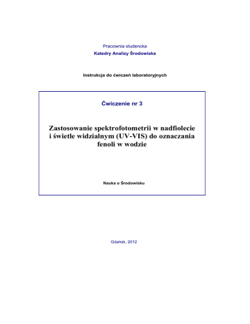 Pracownia studencka Katedry Analizy Środowiska Instrukcja do ćwiczeń laboratoryjnych Ćwiczenie nr 3 Zastosowanie spektrofotometrii w nadfiolecie i świetle widzialnym (UV-VIS) do oznaczania fenoli w wodzie Nauka o Środowisku Gdańsk, 2012 Nauka o Środowisku – Ćwiczenie 3 2 1. Wstęp Fenole są bardzo często używane jako reagenty w przemyśle chemicznym a wśród nich głównie fenol i krezol. Odprowadzane ze ściekami do środowiska wodnego stanowią poważne zagrożenie. Znajdują się przede wszystkim w ściekach z koksowni, gazowni, rafinerii, z zakładów produkcji tworzyw sztucznych, barwników, środków ochrony roślin. Do wód podziemnych fenole przedostają się z wysypisk odpadów komunalnych, gdzie powstają w wyniku rozkładu białka, związków humusowych, lignin i innych. Fenole są związkami toksycznymi dla środowiska wodnego i zakłócają procesy samooczyszczania. Niewielkie ilości fenoli, naturalnie występujące w wodach lądowych, nie stanowią zagrożenia dla zdrowia. Problem pojawia się w czasie chlorowania wody. W czasie dezynfekcji wody w wyniku chlorowania substancji humusowych powstają chlorofenole. Jest to ogólna nazwa pochodnych fenolu, w którym jeden lub więcej atomów wodoru jest zastąpiony atomem chloru. W sumie tworzą one 19 różnych kongenerów. Wszystkie chlorowe pochodne fenolu charakteryzują się bardzo intensywnym zapachem, wyczuwalnym w wodzie nawet na poziomie ppb (części na miliard). Woda pitna po dezynfekcji, zawierająca 4-chlorofenol, 2,4,5-trichlorofenol lub 2,4,6-trichlorofenol jest głównym źródłem narażenia człowieka na toksyczne działanie chlorofenoli. Dopuszczalna zawartość fenoli, oznaczana jako suma wszystkich pochodnych fenolu (tzw. indeks fenolowy) została przedstawiona w Tab. 3. Prezentowane stężenia są wartościami granicznymi w klasach czystości wód od I do V – zarówno dla wód powierzchniowych, jak i wód podziemnych. Tab. 1. Wartości graniczne stężeń (mg/l) sumy fenoli (indeks fenolowy) Chlorofenole przedostają się do naturalnego środowiska wodnego ze ściekami z przemysłu chemicznego, ale głównie ze źródeł rolniczych na skutek stosowania pestycydów. W warstwach powierzchniowych wód chlorowe pochodne fenolu ulegają przemianom fotochemicznym, prowadzącym do powstania nowych związków o różnym stopniu toksyczności i trwałości, np. fotodegradacja pentachlorofenolu prowadzi do powstania około 30 nowych związków chemicznych: pochodnych fenolu, katecholi, alkoholi i kwasów karboksylowych. W wodach chlorofenole ulegają stopniowej adsorpcji w osadach dennych, gdzie ulegają biodegradacji z udziałem mikroorganizmów. Najbardziej toksycznym i uciążliwym chlorofenolem w środowisku jest pentachlorofenol (PCP), stosowany głównie jako herbicyd do niszczenia młodych chwastów dwuliściennych (fungicyd) oraz jako środek do zaprawiania drewna. Techniczny preparat PCP może być zanieczyszczony polichlorodibenzodioksynami (PCDDs) i polichlorodibenzofuranami Nauka o Środowisku – Ćwiczenie 3 3 (PCDFs), co znacznie podnosi jego działanie toksyczne. Innym źródłem PCP w środowisku jest przemysł celulozowo-papierniczy. Powstaje on także w wyniku rozpadu innych pestycydów, tj. lindanu lub heksachlorobenzenu. PCP wchłania się do ustroju przez przewód pokarmowy, skórę oraz układ oddechowy. Bez względu na drogę narażenia, pentachlorofenol jest związkiem toksycznym (LD 27-205 mg/kg), wykazującym u ludzi działanie silnie drażniące na skórę i błony śluzowe. Przy bezpośrednim kontakcie wywołuje stany zapalne skóry i oparzenia, a przy wielokrotnym działaniu – trądzik chlorowy i czyraczność. Badania toksykologiczne wykazują, iż wysokie dawki PCP mogą powodować zmiany mutagenne u zwierząt. 2. Zasada oznaczania fenoli metodą pośrednią Za pomocą spektrofotometrii UV/VIS można oznaczyć fenole obecne w wodzie lub ściekach metodą pośrednią, tzn. po przeprowadzeniu ich w barwny związek absorbujący promieniowanie UV/VIS. Fenole wydziela się z wody za pomocą destylacji z parą wodną z kwaśnego roztworu (w środowisku kwaśnym fenole są niezdysocjowanymi kwasami lotnymi z parą wodną, podczas gdy fenolany nie destylują z parą wodną). Do oznaczeń wykorzystuje się tworzenie przez fenole barwnych pochodnych z 4-aminoantypiryną (1-fenylo-2,3-dimetylo-4aminopirazolonem). Reakcje przeprowadza się w środowisku alkalicznym (pH = 9,8) w obecności heksacyjanożelazianu(III) potasu jako utleniacza: Rys. 1. Schemat 4-aminoantypiryny z fenolem w środowisku alkalicznym Produkty reakcji charakteryzują się barwą od zielonożółtej do pomarańczowej, w zależności od stężenia fenoli i absorbują promieniowanie w zakresie widzialnym. Pomiaru absorbancji dokonuje się przy długości fali ʎ = 460 nm. Z uwagi na podatność fenoli na biochemiczne i chemiczne utlenianie analizę należy wykonać w krótkim czasie (do 4 godz. od momentu pobrania próbki) lub utrwalić próbkę bezpośrednio po pobraniu. Utrwalenie dokonuje się przez zakwaszenie kwasem fosforowym(V) wobec oranżu metylowego do pH = 4.0. Bezpośrednio po tym dodaje się roztwór siarczanu(VI) miedzi(II) - jako inhibitora biodegradacji - w takiej ilości, aby uzyskać stężenie 1 g/dm3 wody. Jony Cu2+ tworzą nielotne kompleksy z fenolami wielowodorotlenowymi, Nauka o Środowisku – Ćwiczenie 3 4 wytrącają ewentualne zanieczyszczenia jonami S2- w postaci CuS. Środowisko kwaśne zapobiega tworzeniu się Cu(OH)2, który utlenia fenole. Jeżeli próbka wody jest zanieczyszczona olejami lub smarami, należy je usunąć poprzez ekstrakcję tetrachlorkiem węgla. 3. Wykonanie ćwiczenia 3.1. Destylacja z parą wodną Do kolby kulistej o poj. 500 ml odmierzyć cylindrem 100 ml badanej próbki wody. Dodać do próbki 5 kropli oranżu metylowego i za pomocą roztworu kwasu fosforowego(V) (1:9, v/v) doprowadzić pH do poniżej 4,0 (do osiągnięcia barwy bladoróżowej). Następ
