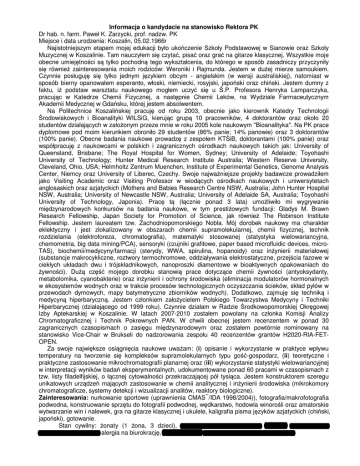 Informacja o kandydacie na stanowisko Rektora PK Dr hab. n. farm. Paweł K. Zarzycki, prof. nadzw. PK Miejsce i data urodzenia: Koszalin, 05.02.1966r Najistotniejszym etapem mojej edukacji było ukończenie Szkoły Podstawowej w Sianowie oraz Szkoły Muzycznej w Koszalinie. Tam nauczyłem się czytać, pisać oraz grać na gitarze klasycznej. Wszystkie moje obecne umiejętności są tylko pochodną tego wykształcenia, do którego w sposób zasadniczy przyczyniły się również zainteresowania moich rodziców: Weroniki i Rajmunda. Jestem w dużej mierze samoukiem. Czynnie posługuję się tylko jednym językiem obcym - angielskim (w wersji australiskiej), natomiast w sposób bierny opanowałem esperanto, włoski, niemiecki, rosyjski, japoński oraz chiński. Jestem dumny z faktu, iż podstaw warsztatu naukowego mogłem uczyć się u Ś.P. Profesora Henryka Lamparczyka, pracując w Katedrze Chemii Fizycznej, a następnie Chemii Leków, na Wydziale Farmaceutycznym Akademii Medycznej w Gdańsku, której jestem absolwentem. Na Politechnice Koszalińskiej pracuję od roku 2003, obecnie jako kierownik Katedry Technologii Środowiskowych i Bioanalityki WILSiG, kierując grupą 10 pracowników, 4 doktorantów oraz około 20 studentów działających w założonym przeze mnie w roku 2005 kole naukowym "Bioanalityka". Na PK prace dyplomowe pod moim kierunkiem obroniło 29 studentów (86% panie; 14% panowie) oraz 3 doktorantów (100% panie). Obecne badania naukowe prowadzę z zespołem KTŚiB, doktorantami (100% panie) oraz współpracuję z naukowcami w polskich i zagranicznych ośrodkach naukowych takich jak: University of Queensland, Brisbane; The Royal Hospital for Women, Sydney; University of Adelaide; Toyohashi University of Technology; Hunter Medical Research Institute Australia; Western Reserve University, Cleveland, Ohio, USA; Helmholtz Zentrum Muenchen, Institute of Experimental Genetics, Genome Analysis Center, Niemcy oraz University of Liberec, Czechy. Swoje najważniejsze projekty badawcze prowadziłem jako Visiting Academic oraz Visiting Professor w wiodących ośrodkach naukowych i uniwersytetach anglosaskich oraz azjatyckich (Mothers and Babies Research Centre NSW, Australia; John Hunter Hospital NSW, Australia; University of Newcastle NSW, Australia; University of Adelaide SA, Australia; Toyohashi University of Technology, Japonia). Pracę tą (łącznie ponad 3 lata) umożliwiło mi wygrywanie międzynarodowych konkursów na badania naukowe, w tym prestiżowych fundacji: Gladys M. Brawn Research Fellowship, Japan Society for Promotion of Science, jak również The Robinson Institute Fellowship. Jestem laureatem tzw. Zachodniopomorskiego Nobla. Mój dorobek naukowy ma charakter eklektyczny i jest zlokalizowany w obszarach chemii supramolekularnej, chemii fizycznej, technik rozdzielania (elektroforeza, chromatografia), matematyki stosowanej (statystyka wielowariancyjna, chemometria, big data mining/PCA), sensoryki (czujniki grafitowe, paper based microfluidic devices, microTAS), biochemii/medycyny/farmacji (sterydy, WWA, spirulina, hopanoidy) oraz inżynierii materiałowej (substancje makrocykliczne, roztwory termochromowe, oddziaływania elektrostatyczne, przejścia fazowe w ciekłych układach dwu i trójskładnikowych, nanoproszki diamentowe w bioaktywnych opakowaniach do żywności). Dużą część mojego dorobku stanowią prace dotyczące chemii żywności (antyoksydanty, metabolomika, cyanobakterie) oraz inżynierii i ochrony środowiska (eliminacja modulatorów hormonalnych w ekosystemów wodnych oraz w trakcie procesów technologicznych oczyszczania ścieków, skład pyłów w przewodach dymowych, mapy batymetryczne zbiorników wodnych). Dodatkowo, zajmuję się techniką i medycyną hiperbaryczną. Jestem członkiem założycielem Polskiego Towarzystwa Medycyny i Techniki Hiperbarycznej (działającego od 1999 roku). Czynnie działam w Radzie Środkowopomorskiej Okręgowej Izby Aptekarskiej w Koszalinie. W latach 2007-2010 zostałem powołany na członka Komisji Analizy Chromatograficznej i Technik Pokrewnych PAN. W chwili obecnej jestem recenzentem w ponad 30 zagranicznych czasopismach o zasięgu międzynarodowym oraz zostałem powtórnie nominowany na stanowisko Vice-Chair w Brukseli do nadzorowania zespołu 40 recenzentów grantów H2020-RIA-FETOPEN. Za swoje największe osiągnięcia naukowe uważam: (i) opisanie i wykorzystanie w praktyce wpływu temperatury na tworzenie się kompleksów supramolekularnych typu gość-gospodarz, (ii) teoretyczne i praktyczne zastosowanie mikrochromatografii planarnej oraz (iii) wykorzystanie statystyki wielowariancyjnej w interpretacji wyników badań eksperymentalnych, udokumentowane ponad 60 pracami w czasopismach z tzw. listy filadelfijskiej, o łącznej cytowalności przekraczającej pół tysiąca. Jestem konstruktorem szeregu unikatowych urządzeń mających zastosowanie w chemii analitycznej i inżynierii środowiska (mikrokomory chromatograficze, systemy detekcji i wizualizacji analitów, reaktory biologiczne). Zainteresowania: nurkowanie sportowe (uprawnienia CMAS**/IDA 1998/2004)), fotografia/makrofotografia podwodna, konstruowanie sprzętu do fotografii podwodnej, wędkarstwo, hodowla winorośli oraz amatorskie wytwarzanie win i nalewek, gra na gitarze klasycznej i ukulele, kaligrafia pisma języków azjatyckich (chiński, japoński), gotowanie. Stan cywilny: żonaty (1 żona, 3 dzieci), wyznanie: rzymskokatolickie, poglądy i przekonania polityczne: prawicowe, alergia na biurokrację, przynależność do partii politycznych: bezpartyjny.