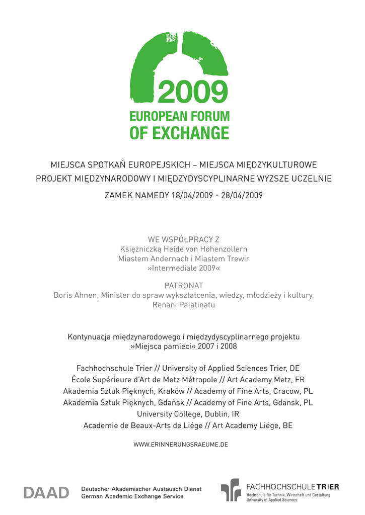Miejsca spotkań europejskich – miejsca międzykulturowe Projekt międzynarodowy i międzydyscyplinarne wyzsze uczelnie Zamek Namedy 18/04/2009 - 28/04/2009 We współpracy z Księżniczką Heide von Hohenzollern Miastem Andernach i Miastem Trewir »Intermediale 2009« Patronat Doris Ahnen, Minister do spraw wykształcenia, wiedzy, młodzieży i kultury, Renani Palatinatu Kontynuacja międzynarodowego i międzydyscyplinarnego projektu »Miejsca pamieci« 2007 i 2008 Fachhochschule Trier // University of Applied Sciences Trier, DE École Supérieure d’Art de Metz Métropole // Art Academy Metz, FR Akademia Sztuk Pięknych, Kraków // Academy of Fine Arts, Cracow, PL Akademia Sztuk Pięknych, Gdañsk // Academy of Fine Arts, Gdansk, PL University College, Dublin, IR Academie de Beaux-Arts de Liége // Art Academy Liége, BE www.erinnerungsraeume.de Treść filozofia strona 1 WspÓlpraca /// KontaKty strona 2 Grupa pedagogiczna strona 3 miejsca międzykulturowe strona 4-5 Tematyka /// Metody strona 6 Intencje /// Wspólne strona 7 Workshops strona 8 Program 18/04/09 – 27/04/09 strona 9 Sympozjum strona 10 Filozofia Filozofia projektu Projekt ”Miejsca spotkań europejskich, miejsca międzykulturowe”, to już trzeci z rzędu projekt ”Miejsca pamięci«. Bazuje on na idei „mobilnej uczelni wyższej”, tworzonej przez europejskie wyższe szkoły artystyczne. Około sześćdziesięciu studentów i dwudziestu profesorów pracuje wspölnie artystycznie i naukowo podczas 12 dni raz w roku w różnych krajach Europy. Ten typ spotkań i współpracy umożliwia wymianę międzykulturową, poznanie historii i jezyka kraju goszczącego, jego tradycji, zwyczajów, a równocześnie uczy tolerancji, daje poczucie naturalnej przynależności do Europy. Ponieważ w projekcie biorą udział również lokalni artyści, naukowcy, politycy i rzemieślnicy, powstaje dzięki tej współpracy międzynarodowy projekt uczelniany o charakterze lokalnym. Miejsca spotkań europejskich 2009 – Zamek Namedy Praca artystyczna 18/04 - 24/04/09 Studenci z pięciu krajów przygotują w interdyscyplinarnych zespołach projekty pod kierunkiem profesorów uczelni partnerskich. Zamek Namedy z otaczającym go parkiem w swoim historycznym i krajobrazowym kontekście stanowić będzie przez 10 dni centrum wszystkich międzydyscyplinarnie wypracowanych projektów artystycznych i architektonicznych. Również poza zamkiem Namedy, dwa najstarsze miasta Niemiec, Trewir i Andernach, oferują możliwość współpracy. Wystawa 25/04/09 Rezultaty projektu z dziedziny rysunku, malarstwa, fotografii, ceramiki, multimediów, video, performancu, teatru, architektury, landartu, światła i dźwięku zostaną przedstawione publiczności w sobotę, 25.04.2009, w ramach imprezy „Noc sztuki w zamku Namedy”. Impreza będzie urozmaicona programem muzycznym i poczęstunkiem. Sympozjum końcowe we współpracy z „Intermediale 2009” 27/04/09 Jak zachować pamięć wspólnej kultury w perspektywie przyszłości, w dialogu z młodą generacją? W krótkich referatach, przykładowo dla różnych europejskich krajów, będzie poruszony i dyskutowany temat „Transforming Memories - w jakim kierunku zmierzamy z naszym dorobkiem kulturowym” ? W drugiej części sympozjum będą przedstawione rezultaty projektu „Miejsca spotkań europejskich” 2009. Dokumentacja Rezultaty i proces rozwoju projektu zostaną udokumentowane w formie książki w dwóch językach oraz na stronie internetowej. Uczelnie biorące w nim udział otrzymają przygotowany materiał do zorganizowania we własnej uczelni wystawy rezultatów projektu. 1 Wspólpraca /// KontaKty Koncepcja, Kierownictwo i organizacja Prof. Anna Bulanda-Pantalacci, University of Applied Sciences Trier, DE Asystentka: Dipl. Des. Silke Jaspers, University of Applied Sciences Trier, DE Kontakt Prof. Bulanda-Pantalacci [email protected]; [email protected] | Phone 0049 (0)179.523.04.89 Silke Jaspers // Asystentka [email protected] | Phone 0049 (0)176.831.33.217 Dirk Oelmann // Press & »Night of Art« [email protected] | Phone 0049 (0)151.510.36.130 www.erinnerungsraeume.de Koncept Symposium »Transforming Memories« »Intermediale 09«, Prof. Franz Kluge, University of Applied Sciences Trier, DE Wspólpraca/ Sponsoring Förderkreis der Burg Namedy Generaldirektion Kulturelles Erbe Rheinland-Pfalz »and more« Veranstaltungstechnik, Andernach Studierendenwerk Trier Agenturhaus Trier Akademisches Auslandsamt, FH Trier Kulturstiftung Sparkasse Trier Förderkreis der Fachhochschule Trier Z pomocą studentów Kommunikationsdesign i Intermediales Design FH Trier Uczelnie biorące udział w projekcie Fachhochschule Trier // University of Applied Sciences Trier, DE École Supérieure d’Art de Metz Métropole // Art Acamedy Metz, FR Akademia Sztuk Pieknych, Kraków // Academy of Fine Arts, Cracow, PL Akademia Sztuk Pieknych, Gdansk // Academy of Fine Arts, Gdansk, PL University College, Dublin, IR Academie de Beaux-Arts de Liége // Art Academy Liège, BE Zaproszone uczelnie Concordia University, Montréal, Kanada, Wydzial Design & Commpution Arts, Dziekan Prof. Martin Racine FH Koblenz, Instytut artystycznej Ceramiki, D Prof. Jochen Brandt, Dyrektor Instytutu, Prof. Ingrid Conrad-Lindig EPSA, Ivry/Paris, F, Dyrektor Brigitte Leroux Uniwersytet Opolski, Instytut Sztuki, PL, Dyrektor Prof. Lucja Baginska 2 Grupa pedagogiczna Prof. Éléonore Bak, École Superieure d’Art de Metz Métropole, FR // Light & Sound Prof. Anna Bulanda-Pantalacci, Fachhochschule Trier, DE // Visual Art, Plakat, rysunek Prof. Marion Goerdt, Fachhochschule Trier, DE // Architektura Prof. Oskar Spital-Frenking, Fachhochschule Trier, DE // Architektura Prof. Michael Heurich, University College, Dublin, IE // Architektura pejzazu Prof. Antoni Porczak, Akademia Sztuk Pięknych, Kraków, PL // rzezba, multimedia Prof. Jerzy Nowakowski, Akademia Sztuk Pięknych, Kraków, PL // rzezba, ceramika Prof. Andrzej Ziębliński, Akad