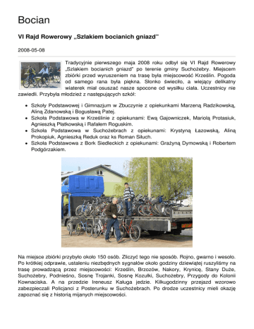 Bocian VI Rajd Rowerowy „Szlakiem bocianich gniazd” 2008-05-08 Tradycyjnie pierwszego maja 2008 roku odbył się VI Rajd Rowerowy „Szlakiem bocianich gniazd” po terenie gminy Suchożebry. Miejscem zbiórki przed wyruszeniem na trasę była miejscowość Krześlin. Pogoda od samego rana była piękna. Słonko świeciło, a wiejący delikatny wiaterek miał osuszać nasze spocone od wysiłku ciała. Uczestnicy nie zawiedli. Przybyła młodzież z następujących szkół: Szkoły Podstawowej i Gimnazjum w Zbuczynie z opiekunkami Marzeną Radzikowską, Aliną Zdanowską i Bogusławą Patej. Szkoła Podstawowa w Krześlinie z opiekunami: Ewą Gajowniczek, Mariolą Protasiuk, Agnieszką Płatkowską i Rafałem Roguskim. Szkoła Podstawowa w Suchożebrach z opiekunami: Krystyną Łazowską, Aliną Prokopiuk, Agnieszką Reduk oraz ks Roman Siłuch. Szkoła Podstawowa z Bork Siedleckich z opiekunami: Grażyną Dymowską i Robertem Podgórzakiem. Na miejsce zbiórki przybyło około 150 osób. Zliczyć tego nie sposób. Rojno, gwarno i wesoło. Po krótkiej odprawie, ustaleniu niezbędnych sygnałów około godziny dziewiątej ruszyliśmy na trasę prowadzącą przez miejscowości: Krześlin, Brzozów, Nakory, Krynicę, Stany Duże, Suchożebry, Podnieśno, Sosnę Trojanki, Sosnę Kozułki, Suchożebry, Przygody do Kolonii Kownaciska. A na przedzie Ireneusz Kaługa jedzie. Kilkugodzinny przejazd wzorowo zabezpieczali Policjanci z Posterunku w Suchożebrach. Po drodze uczestnicy mieli okazję zapoznać się z historią mijanych miejscowości. Przyroda w pełnym rozkwicie. Pola i łąki zielenią się, grusze śródpolne obsypane kwiatami. Drzewa w lasach wabią nas soczystą zielenią, a mijane oczka wodne mrugają wesoło. Pobocza dróg żółcą się kwitnącym mniszkiem lekarskim popularnie zwanym mleczem. Fajnie jest, pogoda i humory dopisują. Ekipa 100 Tysięcy Bocianów pod dowództwem Marcina Krzyżańskiego i Teresa Błażejczyk z Telewizyjnego Kuriera Warszawskiego dokumentują nasze poczynania. Podróż umila nam przelot skowronka, pustułki, błotniaka, bociana białego i kumkanie żab. Uczestnicy oglądali najpiękniejsze gniazda bocianie zlokalizowane na trasie. Żywo interesowali się projektem ochrony bociana białego i związanymi z nim działaniami. Podczas postojów gorąco dyskutowano o roli dolin rzecznych jako środowisk występowania różnych gatunków roślin i zwierząt. W okolicach oczek wodnych, mijanych w kilku miejscach, poruszano zagadnienia związane z projektem ochrony płazów. W projekt ten zaangażowanych jest wiele szkół z całego województwa. Omówiono problemy potrzeby ochrony alei lipowych i zwrócono uwagę na aspekt wycinania śródpolnych grusz. Po drodze wstąpiliśmy na jeden z dwu cmentarzy żołnierzy radzieckich w okolicy miejscowości Suchożebry. Młodzież mogła zapoznać się z wydarzeniami z tamtego mrocznego okresu historii początkowych lat 40 ubiegłego wieku. Przejazd tak dużej grupy rowerzystów wzbudzał zainteresowanie mieszkańców. Pozdrawiali nas wesoło. Pod koniec przejazdu nad horyzontem zaczęły gromadzić się czarne chmury, ale dalej słoneczko nie dawało za wygraną i wesoło świeciło. Rajd zakończył się tradycyjnie ogniskiem w schronisku dla poszkodowanych zwierząt w Kolonii Kownaciska na posesji Powiatowego Lekarza Weterynarii – Bogdana Tarczyńskiego. Każdego roku schronisko odwiedza spora liczba poszkodowanych zwierząt różnych gatunków. Rozmowom i dyskusjom nie było końca. Każdy miał coś ważnego do powiedzenia. Nagle pociemniało i zagrzmiało. Lunął zlewny deszcz. Uczestnicy chronili się pod dachami. Ale to nic, deszcz majowy – czapki z głowy jak mówi ludowe porzekadło i dyskusje trwały nadal. Rozstaliśmy się zapłakani tym majowym deszczem. Następne spotkanie za rok. Będzie pogoda i basta, żaden deszczyk niech nami nie szasta. Ryszard Ryś Sprawna organizacja Rajdu mogła się odbyć tylko dzięki zaangażowaniu całej grupy przyjaciół, którym serdecznie dziękujemy. Są to: Bogdan Tarczyński – powiatowy lekarz weterynarii, Jacek Świrski – wójt Gminy Suchożebry, Piekarnia Krześlin – Dariusz i Leszek Mlonek, Rzeźnik Zbuczyn, Zakład Drobiarski „Nasz Drób” – Ujrzanów, Janusz Szewczak, Ryszard Ryś, „Kozak Druk”, Janusz Łuczak, Marcin Krzyżański z ekipą 100 Tysięcy Bocianów, Teresa Błażejczyk z Telewizyjnego Kuriera Warszawskiego, policjanci z Posterunku w Suchożebrach, Marzena Radzikowska, Alina Zdanowska, Bogusława Patej, Ewa Gajowniczek, Mariola Protasiuk, Agnieszka Płatkowska, Rafał Roguski, Krystyna Łazowska, Alina Prokopiuk, Agnieszka Reduk, ks Roman Siłuch, Grażyna Dymowska, Robert Podgórzak.