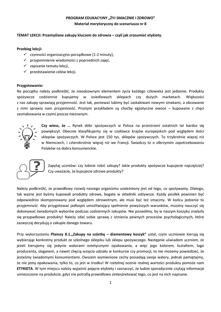PROGRAM EDUKACYJNY „ŻYJ SMACZNIE I ZDROWO” Materiał merytoryczny do scenariusza nr 8 TEMAT LEKCJI: Przemyślane zakupy kluczem do zdrowia – czyli jak zrozumieć etykiety. Przebieg lekcji: czynności organizacyjno-porządkowe (1-2 minuty), przypomnienie wiadomości z poprzednich zajęć, zapisanie tematu lekcji, przedstawienie celów lekcji. Przygotowanie: Na początku należy podkreślić, że nieodzownym elementem życia każdego człowieka jest jedzenie. Produkty spożywcze codziennie kupujemy w osiedlowych sklepach czy dużych marketach. Większości z nas zakupy sprawiają przyjemność. Jest tak, ponieważ lubimy być zaskakiwani nowymi smakami, a obcowanie z nimi sprawia nam przyjemność. Prostym przykładem są choćby egzotyczne owoce – kupowane z chęci zasmakowania w czymś jeszcze nieznanym. Czy wiesz, że … Rynek dóbr spożywczych w Polsce na przestrzeni ostatnich lat bardzo się powiększył. Obecnie klasyfikujemy się w czołówce krajów europejskich pod względem ilości sklepów spożywczych. W Polsce jest 150 tys. sklepów spożywczych. To trzykrotnie więcej niż w Niemczech, i czterokrotnie więcej niż we Francji. Świadczy to o olbrzymim zapotrzebowaniu Polaków na dobra konsumenckie. Zapytaj uczniów: czy lubicie robić zakupy? Jakie produkty spożywcze kupujecie najczęściej? Czy uważacie, że kupujecie zdrowe produkty? Należy podkreślić, że prawidłowy rozwój naszego organizmu uzależniony jest od tego, co spożywamy. Dlatego, tak ważne jest byśmy kupowali produkty zdrowe, bogate w składniki odżywcze. Każdy posiłek powinien być odpowiednio skomponowany pod względem zdrowotnym, ale musi być też smaczny. W końcu jedzenie to przyjemność. Aby przygotować jadłospis umożliwiający spełnienie powyższych warunków, musimy nauczyć się dokonywać świadomych wyborów podczas codziennych zakupów. Nie pozwólmy, by w naszym koszyku znalazły się przypadkowe produkty! Należy zdać sobie sprawę z istnienia pewnych procesów psychologicznych, które zazwyczaj decydują o zakupie danego towaru. Przy wykorzystaniu Planszy 8.1.„Zakupy na szóstkę – diamentowy koszyk” ustal, czym uczniowie kierują się wybierając konkretny produkt ze szkolnego sklepiku lub sklepu spożywczego. Następnie uświadom uczniom, że jeżeli kierujemy się jedynie walorami estetycznymi opakowania, a więc jego kolorem, kształtem, logo producenta, sloganem, a nawet chęcią wzięcia udziału w konkursie czy promocji, to nie możemy powiedzieć, że jesteśmy świadomymi konsumentami. Owszem wymienione cechy posiadają swoje walory, jednak pamiętajmy, że nie jemy opakowania, tylko to, co jest w środku! W rzetelnej ocenie realnej wartości produktu pomoże nam ETYKIETA. W tym miejscu należy wyjaśnić pojęcie etykiety i zaznaczyć, że ludzie sporadycznie czytają informacje umieszczone na produkcie, gdyż nie potrafią prawidłowo zinterpretować tego, co jest na nich napisane. 1 Na etykietę produktu spożywczego składają się wszystkie informacje występujące na opakowaniu. Uczniowie wspólnymi siłami powinni postarać się ustalić, jakie informacje zawarte są na etykiecie. Niech wykorzystają do tego opakowania produktów przyniesionych przez siebie lub nauczyciela. Na etykiecie mogą być umieszczane następujące informacje: nazwa produktu, skład produktu, „data minimalnej trwałości" lub „termin przydatności do spożycia”, zawartość netto lub liczba sztuk, warunki przechowywania, nazwa i adres producenta, kraj pochodzenia, sposób użycia, tabela wartości odżywczej, wskazane dzienne spożycie, informacje zdrowotne, klasa jakości, kod kreskowy, dodatkowe informacje np. o pochodzeniu warzywa. Lista obowiązkowych treści, a także tych, które nie mogą pojawiać się w obrębie etykiety, została ustalona zgodnie z wymogami ustawodawczymi Unii Europejskiej. Każdy z producentów zobowiązany jest do zamieszczenia tych wiadomości na swoim towarze. Selekcja dotycząca przekazu pomyślana została tak, aby była zwięzła, a jednocześnie dostarczała konkretnych danych. Zaznacz, że dzięki owym wskazówkom zyskujemy możliwość porównywania dwóch podobnych towarów dostępnych na rynku. Umożliwia to zakup produktu spożywczego korzystniejszego dla naszego zdrowia oraz odpowiadającego naszym preferencjom kulinarnym. Zadaj pytanie uczniom: na jakich produktach nie umieszcza się etykiety i dlaczego? Ważne jest, aby zwrócić uwagę, iż etykietę umieszcza się na każdym produkcie spożywczym, który jest przetworzony i pakowany fabrycznie. Pozostaje jeszcze kwestia braku załączonej etykiety. Z taką sytuacją mamy często do czynienia przy zakupie warzyw i owoców. Wymienione artykuły stanowią pewnego rodzaju etykietę samą w sobie. Rolę etykiety spełniają w tym przypadku cechy organoleptyczne (smak, zapach lub konsystencja). Oceniając teksturę, kolor, zapach oraz szereg innych cech, zdobywamy pewność odpowiedniego wyboru. Część główna: praca w parach: uczniowie samodzielnie próbują określić elementy etykiety na przyniesionych przez siebie opakowaniach, praca w grupach polegająca na porównaniu produktów spożywczych, na podstawie informacji żywieniowej i wskazanego dziennego spożycia, prezentacja pracy w grupach i dyskusja. Korzystając z plansz 8.4. – 8.8. przedstaw „6 zasad czytania etykiet”. Należy zaakcentować, że znajomość tych zasad pozwala na dokonywanie świadomych wyborów żywieniowych. Plansza 8.4. „Nie daj się wpuścić w maliny – poznaj swoje prawa konsumenckie” Nauczyciel rozpoczyna od pytania: czym różni się jogurt o smaku brzoskwiniowym od jogurtu brzoskwiniowego? Różnica w napisie jest niewielka, lecz kluczowa. W jogurcie o smaku brzoskwiniowym nie ma w ogóle owoców. Są tylko barwniki i aromaty owocowe, o czym dowiemy się z listy składników. Następnie należy zaznaczyć, że zgodnie z prawem, treść etykiety nie może wprowadzać nas w błąd an