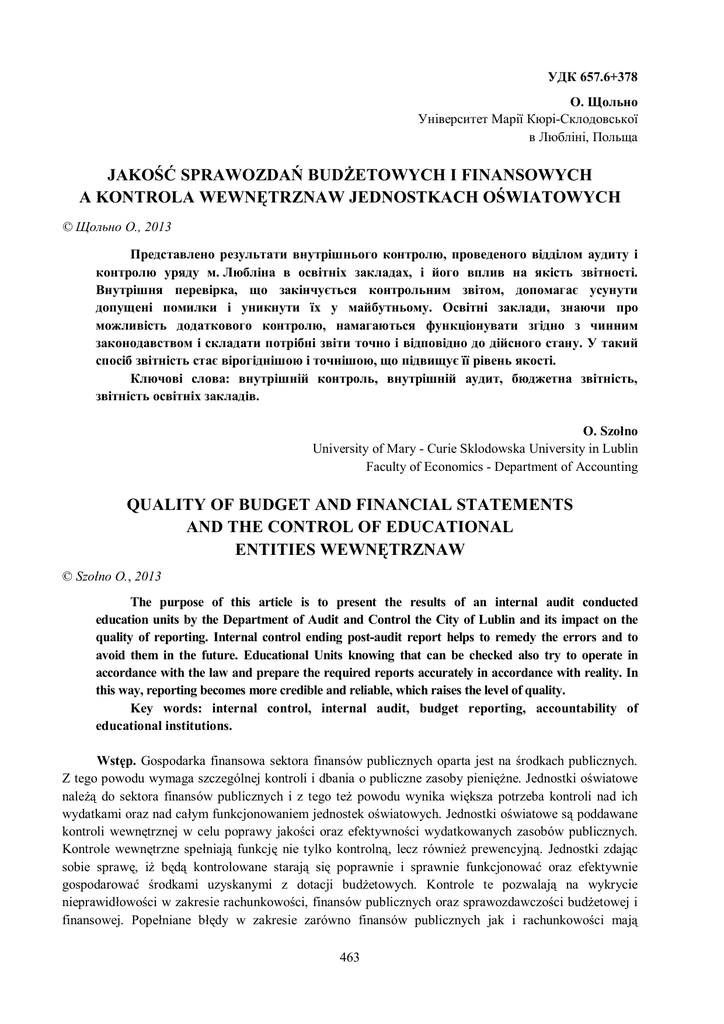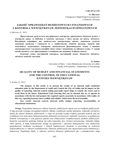 УДК 657.6+378 O. Щольно Університет Марії Кюрі-Склодовської в Любліні, Польща JAKOŚĆ SPRAWOZDAŃ BUDŻETOWYCH I FINANSOWYCH A KONTROLA WEWNĘTRZNAW JEDNOSTKACH OŚWIATOWYCH © Щольно O., 2013 Представлено результати внутрішнього контролю, проведеного відділом аудиту і контролю уряду м. Любліна в освітніх закладах, і його вплив на якість звітності. Внутрішня перевірка, що закінчується контрольним звітом, допомагає усунути допущені помилки і уникнути їх у майбутньому. Освітні заклади, знаючи про можливість додаткового контролю, намагаються функціонувати згідно з чинним законодавством і складати потрібні звіти точно і відповідно до дійсного стану. У такий спосіб звітність стає вірогіднішою і точнішою, що підвищує її рівень якості. Ключові слова: внутрішній контроль, внутрішній аудит, бюджетна звітність, звітність освітніх закладів. O. Szołno University of Mary - Curie Sklodowska University in Lublin Faculty of Economics - Department of Accounting QUALITY OF BUDGET AND FINANCIAL STATEMENTS AND THE CONTROL OF EDUCATIONAL ENTITIES WEWNĘTRZNAW © Szołno O., 2013 The purpose of this article is to present the results of an internal audit conducted education units by the Department of Audit and Control the City of Lublin and its impact on the quality of reporting. Internal control ending post-audit report helps to remedy the errors and to avoid them in the future. Educational Units knowing that can be checked also try to operate in accordance with the law and prepare the required reports accurately in accordance with reality. In this way, reporting becomes more credible and reliable, which raises the level of quality. Key words: internal control, internal audit, budget reporting, accountability of educational institutions. Wstęp. Gospodarka finansowa sektora finansów publicznych oparta jest na środkach publicznych. Z tego powodu wymaga szczególnej kontroli i dbania o publiczne zasoby pieniężne. Jednostki oświatowe należą do sektora finansów publicznych i z tego też powodu wynika większa potrzeba kontroli nad ich wydatkami oraz nad całym funkcjonowaniem jednostek oświatowych. Jednostki oświatowe są poddawane kontroli wewnętrznej w celu poprawy jakości oraz efektywności wydatkowanych zasobów publicznych. Kontrole wewnętrzne spełniają funkcję nie tylko kontrolną, lecz również prewencyjną. Jednostki zdając sobie sprawę, iż będą kontrolowane starają się poprawnie i sprawnie funkcjonować oraz efektywnie gospodarować środkami uzyskanymi z dotacji budżetowych. Kontrole te pozwalają na wykrycie nieprawidłowości w zakresie rachunkowości, finansów publicznych oraz sprawozdawczości budżetowej i finansowej. Popełniane błędy w zakresie zarówno finansów publicznych jak i rachunkowości mają 463 wymierny wpływ na sprawozdawczość oraz jego jakość, rzetelność i wiarygodność. Sprawozdawczość kształtuje obraz całej jednostki oświatowej, oraz pośrednio sektora finansów publicznych w zakresie sektora samorządowego, dlatego też musi opierać się na danych pochodzących z ksiąg rachunkowych prawidłowo odzwierciedlających wszystkie rzeczywiste zdarzenia gospodarcze. Jeżeli występują nieprawidłowości w ewidencji księgowej automatycznie przerzucane są one do sprawozdawczości. Jednostki oświatowe sporządzają zarówno sprawozdania finansowe, tak jak inne jednostki sektora prywatnego oraz specyficzne dla sektora publicznego, sprawozdania budżetowe. Sprawozdania budżetowe obejmują wykonanie i plan finansowy w zakresie dochodów, przychodów oraz wydatków. Natomiast sprawozdania finansowe obejmują zasoby majątkowe, fundusze, zmiany w funduszach oraz rachunek zysków strat danej jednostki. Sprawozdania zarówno budżetowe jak i finansowe podlegają rygorom kontroli wewnętrznej, co wpływa na zwiększenie ich wiarygodności i jakości. Artykuł prezentuje kontrolę wewnętrzną w jednostkach oświatowych w latach 2008-20012 oraz jej wpływ na jakość sprawozdawczości jednostek budżetowych. 1. Kontrola wewnętrzna w jednostkach oświatowych Jednostki oświatowe, które zaliczane są do sektora finansów publicznych, są finansowane ze środków publicznych. Stąd potrzeba zachowania wysokich standardów zarówno przy dyscyplinie budżetowej dotyczącej ich wydawania, jak i przekazywaniu informacji płynących z obowiązkowej sprawozdawczości budżetowej. Jednostki oświatowe są jednostkami budżetowymi, których rachunkowość opiera się zarówno na ustawie o rachunkowości4, jak i na regulacjach prawnych typowych dla sektora finansów publicznych takich jak ustawa o finansach publicznych5, Rozporządzenie Ministra finansów dnia 5 lipca 2010 r. w sprawie szczególnych zasad rachunkowości oraz planów kont dla budżetu państwa, budżetów jednostek samorządu terytorialnego, jednostek budżetowych, samorządowych zakładów budżetowych, państwowych funduszy celowych oraz państwowych jednostek budżetowych mających siedzibę poza granicami Rzeczypospolitej polskiej oraz Rozporządzenia Ministra Finansów z dnia 03.02.2010 r. w sprawie sprawozdawczości budżetowej. W sektorze finansów publicznych wyróżniamy dwa obszary grupowania informacji, które pochodzą z ksiąg rachunkowych – są to sprawozdania budżetowe oraz sprawozdania finansowe. Księgi rachunkowe dostarczają więc niezbędnych danych do sporządzania sprawozd