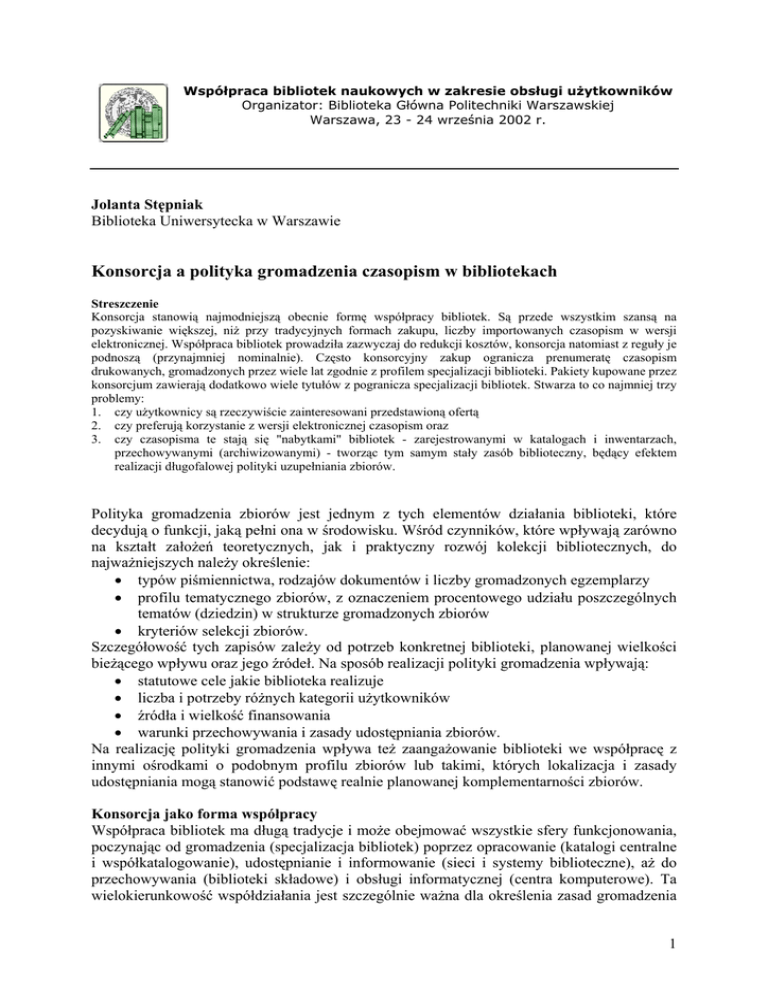 Współpraca bibliotek naukowych w zakresie obsługi użytkowników Organizator: Biblioteka Główna Politechniki Warszawskiej Warszawa, 23 - 24 września 2002 r. Jolanta Stępniak Biblioteka Uniwersytecka w Warszawie Konsorcja a polityka gromadzenia czasopism w bibliotekach Streszczenie Konsorcja stanowią najmodniejszą obecnie formę współpracy bibliotek. Są przede wszystkim szansą na pozyskiwanie większej, niż przy tradycyjnych formach zakupu, liczby importowanych czasopism w wersji elektronicznej. Współpraca bibliotek prowadziła zazwyczaj do redukcji kosztów, konsorcja natomiast z reguły je podnoszą (przynajmniej nominalnie). Często konsorcyjny zakup ogranicza prenumeratę czasopism drukowanych, gromadzonych przez wiele lat zgodnie z profilem specjalizacji biblioteki. Pakiety kupowane przez konsorcjum zawierają dodatkowo wiele tytułów z pogranicza specjalizacji bibliotek. Stwarza to co najmniej trzy problemy: 1. czy użytkownicy są rzeczywiście zainteresowani przedstawioną ofertą 2. czy preferują korzystanie z wersji elektronicznej czasopism oraz 3. czy czasopisma te stają się "nabytkami" bibliotek - zarejestrowanymi w katalogach i inwentarzach, przechowywanymi (archiwizowanymi) - tworząc tym samym stały zasób biblioteczny, będący efektem realizacji długofalowej polityki uzupełniania zbiorów. Polityka gromadzenia zbiorów jest jednym z tych elementów działania biblioteki, które decydują o funkcji, jaką pełni ona w środowisku. Wśród czynników, które wpływają zarówno na kształt założeń teoretycznych, jak i praktyczny rozwój kolekcji bibliotecznych, do najważniejszych należy określenie: • typów piśmiennictwa, rodzajów dokumentów i liczby gromadzonych egzemplarzy • profilu tematycznego zbiorów, z oznaczeniem procentowego udziału poszczególnych tematów (dziedzin) w strukturze gromadzonych zbiorów • kryteriów selekcji zbiorów. Szczegółowość tych zapisów zależy od potrzeb konkretnej biblioteki, planowanej wielkości bieżącego wpływu oraz jego źródeł. Na sposób realizacji polityki gromadzenia wpływają: • statutowe cele jakie biblioteka realizuje • liczba i potrzeby różnych kategorii użytkowników • źródła i wielkość finansowania • warunki przechowywania i zasady udostępniania zbiorów. Na realizację polityki gromadzenia wpływa też zaangażowanie biblioteki we współpracę z innymi ośrodkami o podobnym profilu zbiorów lub takimi, których lokalizacja i zasady udostępniania mogą stanowić podstawę realnie planowanej komplementarności zbiorów. Konsorcja jako forma współpracy Współpraca bibliotek ma długą tradycje i może obejmować wszystkie sfery funkcjonowania, poczynając od gromadzenia (specjalizacja bibliotek) poprzez opracowanie (katalogi centralne i współkatalogowanie), udostępnianie i informowanie (sieci i systemy biblioteczne), aż do przechowywania (biblioteki składowe) i obsługi informatycznej (centra komputerowe). Ta wielokierunkowość współdziałania jest szczególnie ważna dla określenia zasad gromadzenia 1 wydawnictw elektronicznych. Polityka gromadzenia zbiorów „pojedynczych” bibliotek powinna być postrzegana w szerszym kontekście nie tylko efektywności zakupu, ale także długofalowych konsekwencji jej realizacji, warunków udostępniania i przechowywania zbiorów, a przede wszystkim rzeczywistych korzyści dla użytkowników1. Celem podejmowania współpracy zawsze było i jest dążenie do obniżenie kosztów funkcjonowania lokalnej biblioteki, przy jednoczesnej poprawie warunków dostępu do zbiorów. Obecnie efekt ten biblioteki próbują osiągnąć tworząc konsorcja. Duża liczba uczestników zainteresowanych przedsięwzięciem, umożliwia z reguły negocjowanie korzystniejszych warunków umowy. Konsorcja biblioteczne, powstające w warunkach polskich już w latach 1990. — to przedsięwzięcia, których celem była najczęściej minimalizacja kosztów zakupu serwerów i systemów bibliotecznych działających w środowiskach lokalnych Dopiero tworzenie konsorcjów, których celem jest realizacja polityki gromadzenia czasopism przyniosło kilka ważnych dla bibliotek zmian, przede wszystkim, ale nie tylko, w aspekcie polityki gromadzenia. Udział bibliotek w konsorcjach spowodował realny wzrost kosztów gromadzenia czasopism — czyli generalnie większe wydatki z budżetu. Mimo to konsorcja są oceniane bardzo wysoko, gdyż zapewniają użytkownikom łatwy i wygodny dostęp do nieporównywalnie większej liczby tytułów, niż było to możliwe kiedykolwiek wcześniej. Cena udostępnianych przez nie tytułów, w przeliczeniu na opłaty ponoszone przez uczestników konsorcjów, jest znacznie niższa od ceny katalogowej każdego z tych tytułów. Uczestnicy konsorcjum dokonują zatem korzystnego zakupu. Jednak aby odczuć wymierny efekt finansowy, polegający na realnym spadku nakładów, lub co najmniej zahamowaniu wzrostu kosztów na bieżącą prenumeratę, biblioteki powinny zredukować listę czasopism kupowanych indywidualnie. Ta indywidualna decyzja jest jednak uzależniona przede wszystkim oferowanego zasobu i od sposobu zorganizowania konkretnego konsorcjum. Istotną i podstawową, z punktu widzenia polityki gromadzenia, cechą zakupu konsorcyjnego jest praktycznie całkowite uniezależnienie listy oferowanych tytułów od potrzeb indywidualnej biblioteki. Konsorcjum kupuje pakiet tytułów dla grupy bibliotek. Może to być: • pełna lista tytułów jednego wydawcy (zazwyczaj obejmująca różne dziedziny wiedzy, choć nierównomiernie reprezentowane) • lista tytułów prenumerowanych przez uczestników konsorcjum, przy czym lista uczestników jest otwarta i obejmuje biblioteki o różnej specjalności • pakiet, czasem określony dziedzinowo, czasem obejmujący wiele dyscyplin i czasopisma różnych wydawców, oferowany w całości przez dostawcę. Warunki kształtowania indywidualnej polityki gromadzenia uczestników 