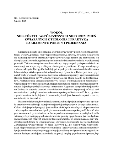 Liturgia Sacra 18 (2012), nr 1, s. 31–49 KS. KONRAD GLOMBIK Opole, UO WOKÓŁ NIEKTÓRYCH WSPÓŁCZESNYCH NIEPOROZUMIEŃ ZWIĄZANYCH Z TEOLOGIĄ I PRAKTYKĄ SAKRAMENTU POKUTY I POJEDNANIA Sakrament pokuty i pojednania, wiernie sprawowany przez Kościół na przestrzeni wieków, podlegał różnym przeobrażeniom, a kryzysy związane z zatarciem się i zmianą pewnych praktyk nie spowodowały jego zaniku, ale przyczyniły się do wykrystalizowania jego istotnych elementów i ukształtowania się współczesnej praktyki. Także w naszych czasach mówi się o kryzysie praktyki spowiedzi sakramentalnej, co wiąże się z różnymi złożonymi czynnikami. Kryzys ten dotyczy zwłaszcza krajów Europy Zachodniej, gdzie praktycznie została zminimalizowana lub zanikła praktyka spowiedzi indywidualnej. Sytuacja w Polsce jest inna, gdyż nadal wielu wiernych regularnie korzysta z sakramentu pokuty, a przy okazji świąt Bożego Narodzenia czy Wielkanocy ustawiają się długie kolejki do konfesjonałów. Praktykowanie sakramentu pokuty w Polsce, w odróżnieniu od zaniku indywidualnej spowiedzi w niektórych krajach zachodnich, nie musi z konieczności oznaczać dojrzałego podejścia do tego sakramentu. Argument pustych konfesjonałów na Zachodzie staje się czasami uzasadnieniem zbędności krytycznej refleksji nad rozumieniem i praktykowaniem sakramentu pokuty w Kościele w Polsce, zgodnie z przekonaniem, że lepiej niech pozostanie jak tak jest, bo może się stać u nas to, co stało się na Zachodzie. Rozumienie i praktykowanie sakramentu pokuty i pojednania powinno być stale przedmiotem refleksji, której celem jest dojrzałe podejście do tego sakramentu. Celem niniejszych dywagacji jest analiza niektórych aktualnych nieporozumień związanych z rozumieniem i praktykowaniem sakramentu pokuty w Polsce. O nieporozumieniach tych świadczą zarówno przekonania wyrażane w praktykach osób wierzących, przystępujących do sakramentu pokuty i pojednania, jak i w dyskusjach dotyczących różnych aspektów tego sakramentu. W ostatnim czasie przykładem tego jest debata na temat pierwszej spowiedzi, która miała miejsce na łamach „Tygodnika Powszechnego” w maju i czerwcu 2012 r. Wśród wielu współczesnych nieporozumień dotyczących rozumienia i praktykowania sakramentu pokuty i pojednania na szczególną uwagę zasługują problemy związane z istotą tego sakramentu. Jednym z nich jest zachwianie proporcji między pojednaniem i pokutą, bę- 32 KS. KONRAD GLOMBIK dącymi istotnymi elementami omawianego sakramentu. Kolejny problem dotyczy procesu wewnętrznej przemiany – metanoi, której istotnym elementem jest korzystanie z sakramentu pokuty i pojednania. Kryzys sakramentu pokuty na Zachodzie jest związany z zanikiem poczucia grzechu, co dotyka problemu materii sakramentu pokuty i pojednania. Także w tej sferze można mówić o nieporozumieniach w praktyce spowiedniczej w Polsce. Sakrament pokuty i pojednania ma charakter eklezjalny, który niezbyt wyraźnie obecny jest w świadomości wiernych i dlatego także w tym względzie można mówić o nieporozumieniu. Poniższy tekst ma na celu charakterystykę poszczególnych problemów w oparciu o dyskusje i praktyki oraz ich teologiczne wyjaśnienie i interpretację. 1. Problem równowagi między pojednaniem i pokutą Jedno z podstawowych nieporozumień związanych z sakramentem pokuty i pojednania dotyczy rozumienia jego istoty. Wiąże się ono z panującym w niektórych kręgach przekonaniem dotyczącym przekazywania łaski, która — podobnie jak lekarstwo — działa „automatycznie” poprzez przyjęcie sakramentu, tzn. bez własnego osobistego udziału, współdziałania w procesie osobistego uświęcenia. Taka indywidualistyczno-magiczna koncepcja jest niewłaściwa i nie odpowiada współczesnemu teologicznemu rozumieniu sakramentu. Bazuje ona na niewłaściwym rozumieniu używanego w dogmatyce pojęcia ex opere operato (skuteczny sam w sobie). Początki tej nauki sięgają pierwotnego Kościoła, w którym istniało przekonanie, że ważność udzielenia sakramentu nie zależy od godności jego szafarza, gdyż w przeciwnym razie zagrożone byłoby działanie zbawcze Kościoła. W średniowieczu przekonanie to zostało wyrażone za pomocą pojęcia ex opere operato, które początkowo oznaczało, że uświęcające działanie sakramentu jest niezależne od godności szafarza, ale nie niezależne od wiary przyjmującego sakrament. W ciągu wieków akcent został przesunięty na osobę przyjmującego sakrament, przy czym zbyt mało zwracano uwagę na fakt, że każdy sakrament przedstawia odpowiadającą życiu ludzkiemu właściwą formę osobistego spotkania z Chrystusem, które w istocie opiera się na wierze. Już św. Augustyn rozumiał sakrament nie jako znak, który na coś wskazuje, ale jako znak, który oznacza to, co sprawia w tym, że coś oznacza i zawsze zakłada wiarę. Zapoczątkowane przez chrzest nowe życie w Chrystusie jest dalej rozwijane w następnych różnych istotnych aspektach życia chrześcijanina. Spotkanie z Chrystusem, nowe życie w Chrystusie dokonuje się we wspólnocie wierzących, w Kościele, którego głową jest Chrystus. Takie spotkanie pozostawia w człowieku ślady, gdyż ze stanu grzechu człowiek przez miłosierną łaskę Bożą zostaje podniesiony i włączony do komunii z Chrystusem i w uświęcenie całego Kościoła. W ten sposób wyklucza się magiczne i indywidualistyczne rozumienie sakramentu w teologii katolickiej. Życie sakramentalne zawsze jest związane z ba- WOKÓŁ NIEKTÓRYCH WSPÓŁCZESNYCH NIEPOROZUMIEŃ ZWIĄZANYCH Z TEOLOGIĄ 33 zującym na wierze osobistym spotkaniem z osobą Jezusa Chrystusa, które jednocześnie posiada znaczenie społeczne i wspólnotowe — w nim dokonuje się życie Kościoła Jezusa Chrystusa1. Nieporozumieniem jest takie pojmowanie sakramentu pokuty i pojednania, w którym przywiązuje się szczególnie wielką wagę do tego, co speł