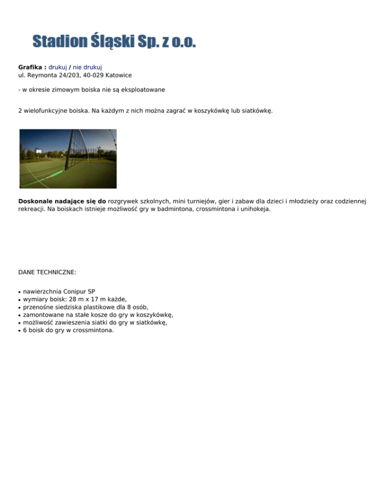 Grafika : drukuj / nie drukuj ul. Reymonta 24/203, 40-029 Katowice - w okresie zimowym boiska nie są eksploatowane 2 wielofunkcyjne boiska. Na każdym z nich można zagrać w koszykówkę lub siatkówkę. Doskonale nadające się do rozgrywek szkolnych, mini turniejów, gier i zabaw dla dzieci i młodzieży oraz codziennej rekreacji. Na boiskach istnieje możliwość gry w badmintona, crossmintona i unihokeja. DANE TECHNICZNE: ● ● ● ● ● ● nawierzchnia Conipur SP wymiary boisk: 28 m x 17 m każde, przenośne siedziska plastikowe dla 8 osób, zamontowane na stałe kosze do gry w koszykówkę, możliwość zawieszenia siatki do gry w siatkówkę, 6 boisk do gry w crossmintona.