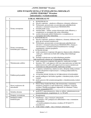 „NOWE ŻERNIKI” Wrocław OPIS WYKOŃCZENIA I WYPOSAŻENIA MIESZKAŃ „NOWE ŻERNIKI” Wrocław (mieszkania z wykończeniem) LOKAL MIESZKALNY I. a) b) 1. Ściany zewnętrzne 2. Ściany wewnętrzne konstrukcyjne i działowe 3. Wykończenie sufitów 4. Podłoża pod posadzki 5. Drzwi wejściowe do mieszkania 6. Stolarka okienna 7. 8. Parapety wewnętrzne Instalacja wodnokanalizacyjna KONSTRUKCJA bloczki wapienno – piaskowe silikatowe; elementy żelbetowe Wyburzanie, przesuwanie czy powiększanie jakichkolwiek otworów w ścianach nośnych jest NIEMOŻLIWE. OCIEPLENIE ścian: a) metoda lekka – mokra: system elewacyjny tynk silikatowy z ociepleniem ze styropianu lub wełny mineralnej b) system elewacyjny płytki klinkierowe z ociepleniem ze styropianu lub wełny mineralnej KONSTRUKCJA a) bloczki wapienno- piaskowe silikatowe, elementy żelbetowe lub płyty gk na rusztach metalowych b) Wyburzanie, przesuwanie czy powiększanie jakichkolwiek otworów w ścianach nośnych jest NIEMOŻLIWE. Zmiana w otworowaniu w ścianach nośnych każdorazowo wymaga uzgodnienia z biurem projektów. WYKOŃCZENIE a) tynki cementowo-wapienne lub gipsowe dopuszczalne okładzina z płyt g-k , malowane na biało lub według indywidualnego projektu b) łazienka wykończona wg indywidualnego projektu brak możliwości wkucia rur w konstrukcję żelbetową tynki cementowo-wapienne lub gipsowe, malowane na biało łazienka i WC- tynk gipsowy lub cem-wap malowany na biało lub jednowarstwowy sufit z płyt gipsowych na ruszcie metalowym wykonane na całej powierzchni, malowany na biało z zaprawy cementowej, zatarta na ostro, zbrojona siatką systemo wą lub zbrojeniem rozproszonym z izolacją podposadzkową (styropian) WYKOŃCZENIE WEDŁUG WYBRANEGO STANDARDU a) panele podłogowe lub deska (zgodnie z charakterystyką wykoń czenia) b) płytki gresowe lub ceramiczne(zgodnie z charakterystyką wykoń czenia) Drzwi firmy Gerda lub Porta, lub równoważne z ościeżnicą metalową, progiem ze stali nierdzewnej, zamkiem, wizjerem, szyldem i klamką posiadające odporność na włamanie 2 klasy normy europejskiej ENV profil PCV pięciokomorowy, okna ze szkłem jednokomorowym termoizolacyjnym, zespolonym, k= 1,1 W/m2K Konglomerat kanalizacja – rury z tworzyw sztucznych: - w łazience i WC podejścia do odbiorników wraz z montażem odbiorników - w kuchni podejście do pionu o średnicy Ø 50 lub Ø 75 (natynkowo) woda zimna i ciepła – rury z tworzyw sztucznych: Strona 1 z 3 „NOWE ŻERNIKI” Wrocław - w łazience i WC podejścia do odbiorników wraz z montażem odbiorników - w kuchni podejście zakończone zaślepką z tworzywa sztuczne go (natynkowo) podejścia w kuchni nie zakuwane w ścianie Instalacja wodno- kanalizacyjna w obrębie konstrukcji żelbetowej prowadzona natynkowo w zabudowie. Sieć ciepłownicza - Węzeł cieplny grzejniki płytowe, stalowe wraz z montażem głowic termostatycznych grzejnik drabinkowy – w łazience wraz z montażem głowic termostatycznych gniazda 230 V zabezpieczone wyłącznikiem różnicowoprądowym rozprowadzona instalacja oświetleniowa zakończona kostką w kuchni dodatkowo puszka NT do kuchenki 400V (montaż odbiorników o ile umowa przewidywała zabudowę kuchenną) w mieszkaniach tablice podtynkowe instalacja oświetleniowa w łazience – halogeny typu LED zespolone gniazdo: telefoniczne RJ 12 i internetowe RJ45 Gniazda typu RTVSAT aparat naścienny, instalacja przygotowana do montażu wideodomofonu posadzka z desek impregnowanych balustrady w konstrukcji stalowej/aluminiowej z wypełnieniem prętowym Posadzka cementowa ściany systemowe metalowe lekkie lub murowane nietynkowane instalacja elektryczna oświetleniowa. żelbetowe monolityczne, malowane żelbetowe monolityczne lub murowane z bloczków betonowych lub silikatowych, malowane posadzka betonowa przemysłowa utwardzona powierzchniowo żelbetowy monolityczny ocieplony w obrębie powierzchni użytkowej parteru posadzka betonowa przemysłowa utwardzona powierzchniowo lub płytki gresowe ściany bez tynków, drzwi do pomieszczeń technicznych stalowe systemowe instalacja oświetlenia podstawowego, awaryjnego i ewakuacyjnego instalacja wentylacji mechanicznej wywiewnej instalacja odgromowa 9. Ogrzewanie 10. Instalacja elektryczna 12. Instalacja telefoniczna i internetowa Instalacja telewizyjna 13. Instalacja domofonowa 14. Balkony 15. Komórki lokatorskie 11. II. Garaż 1. Ściany zewnętrzne 2. Ściany wewnętrzne 3. Płyta posadzkowa 4. Strop garażu 5. 6. Pomieszczenia techniczne Instalacje III. KOMUNIKACJA WEWNĘTRZNA - KLATKI SCHODOWE Strona 2 z 3 „NOWE ŻERNIKI” Wrocław 1. Ściany wewnętrzne i sufity 2. Posadzki, schody 3. Instalacja oświetleniowa 4. Winda osobowa tynk cementowo-wapienny lub tynk gipsowy malowanie farbą płytki gresowe lub ceramiczne oświetlenie i osprzęt dostosowany do wymogów oświetlenia schodowego dźwig osobowy firmy Kone lub tożsamy W przypadku trudności w nabyciu danego rodzaju materiału, może być zastosowany materiał zastępczy o porównywalnej jakości. Strona 3 z 3