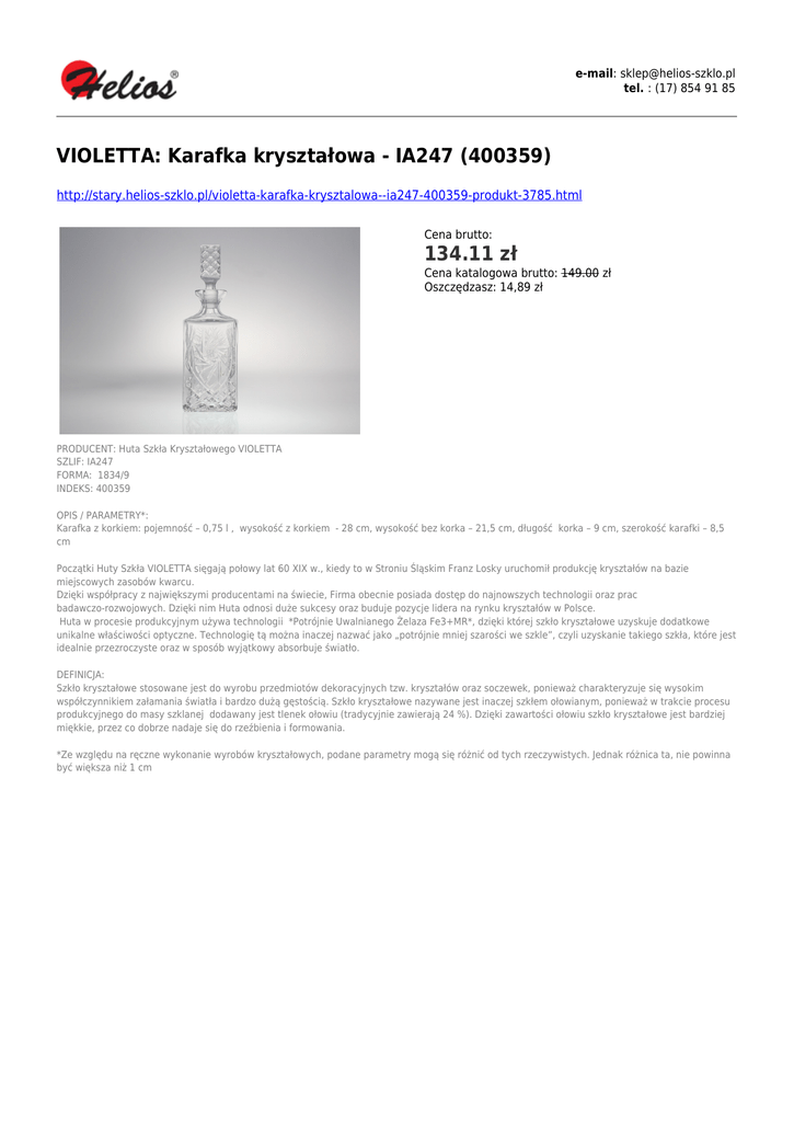 e-mail: [email protected] tel. : (17) 854 91 85 VIOLETTA: Karafka kryształowa - IA247 (400359) http://stary.helios-szklo.pl/violetta-karafka-krysztalowa--ia247-400359-produkt-3785.html Cena brutto: 134.11 zł Cena katalogowa brutto: 149.00 zł Oszczędzasz: 14,89 zł PRODUCENT: Huta Szkła Kryształowego VIOLETTA SZLIF: IA247 FORMA: 1834/9 INDEKS: 400359 OPIS / PARAMETRY*: Karafka z korkiem: pojemność – 0,75 l , wysokość z korkiem - 28 cm, wysokość bez korka – 21,5 cm, długość korka – 9 cm, szerokość karafki – 8,5 cm Początki Huty Szkła VIOLETTA sięgają połowy lat 60 XIX w., kiedy to w Stroniu Śląskim Franz Losky uruchomił produkcję kryształów na bazie miejscowych zasobów kwarcu. Dzięki współpracy z największymi producentami na świecie, Firma obecnie posiada dostęp do najnowszych technologii oraz prac badawczo-rozwojowych. Dzięki nim Huta odnosi duże sukcesy oraz buduje pozycje lidera na rynku kryształów w Polsce. Huta w procesie produkcyjnym używa technologii *Potrójnie Uwalnianego Żelaza Fe3+MR*, dzięki której szkło kryształowe uzyskuje dodatkowe unikalne właściwości optyczne. Technologię tą można inaczej nazwać jako „potrójnie mniej szarości we szkle”, czyli uzyskanie takiego szkła, które jest idealnie przezroczyste oraz w sposób wyjątkowy absorbuje światło. DEFINICJA: Szkło kryształowe stosowane jest do wyrobu przedmiotów dekoracyjnych tzw. kryształów oraz soczewek, ponieważ charakteryzuje się wysokim współczynnikiem załamania światła i bardzo dużą gęstością. Szkło kryształowe nazywane jest inaczej szkłem ołowianym, ponieważ w trakcie procesu produkcyjnego do masy szklanej dodawany jest tlenek ołowiu (tradycyjnie zawierają 24 %). Dzięki zawartości ołowiu szkło kryształowe jest bardziej miękkie, przez co dobrze nadaje się do rzeźbienia i formowania. *Ze względu na ręczne wykonanie wyrobów kryształowych, podane parametry mogą się różnić od tych rzeczywistych. Jednak różnica ta, nie powinna być większa niż 1 cm
