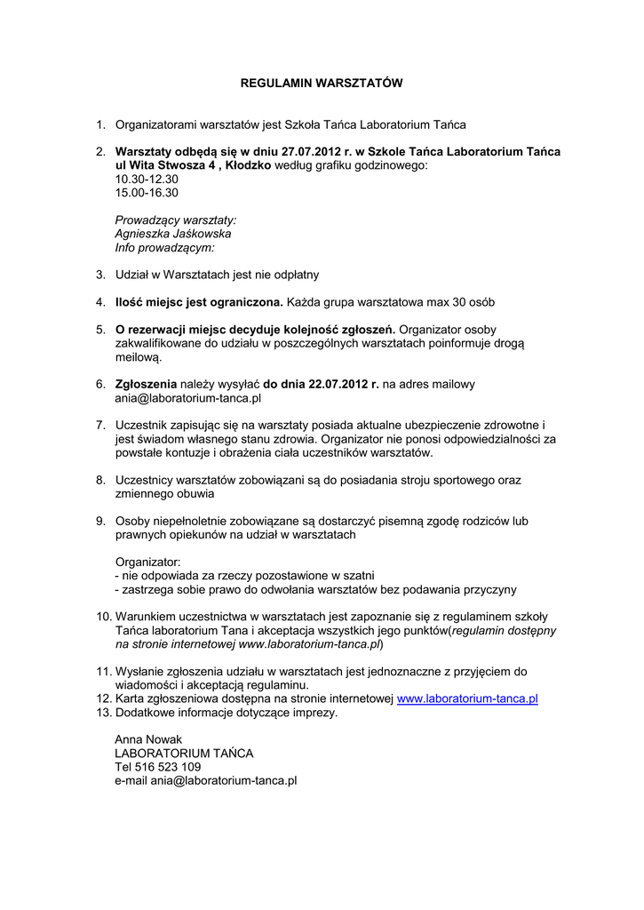 REGULAMIN WARSZTATÓW 1. Organizatorami warsztatów jest Szkoła Tańca Laboratorium Tańca 2. Warsztaty odbędą się w dniu 27.07.2012 r. w Szkole Tańca Laboratorium Tańca ul Wita Stwosza 4 , Kłodzko według grafiku godzinowego: 10.30-12.30 15.00-16.30 Prowadzący warsztaty: Agnieszka Jaśkowska Info prowadzącym: 3. Udział w Warsztatach jest nie odpłatny 4. Ilość miejsc jest ograniczona. Każda grupa warsztatowa max 30 osób 5. O rezerwacji miejsc decyduje kolejność zgłoszeń. Organizator osoby zakwalifikowane do udziału w poszczególnych warsztatach poinformuje drogą meilową. 6. Zgłoszenia należy wysyłać do dnia 22.07.2012 r. na adres mailowy [email protected] 7. Uczestnik zapisując się na warsztaty posiada aktualne ubezpieczenie zdrowotne i jest świadom własnego stanu zdrowia. Organizator nie ponosi odpowiedzialności za powstałe kontuzje i obrażenia ciała uczestników warsztatów. 8. Uczestnicy warsztatów zobowiązani są do posiadania stroju sportowego oraz zmiennego obuwia 9. Osoby niepełnoletnie zobowiązane są dostarczyć pisemną zgodę rodziców lub prawnych opiekunów na udział w warsztatach Organizator: - nie odpowiada za rzeczy pozostawione w szatni - zastrzega sobie prawo do odwołania warsztatów bez podawania przyczyny 10. Warunkiem uczestnictwa w warsztatach jest zapoznanie się z regulaminem szkoły Tańca laboratorium Tana i akceptacja wszystkich jego punktów(regulamin dostępny na stronie internetowej www.laboratorium-tanca.pl) 11. Wysłanie zgłoszenia udziału w warsztatach jest jednoznaczne z przyjęciem do wiadomości i akceptacją regulaminu. 12. Karta zgłoszeniowa dostępna na stronie internetowej www.laboratorium-tanca.pl 13. Dodatkowe informacje dotyczące imprezy. Anna Nowak LABORATORIUM TAŃCA Tel 516 523 109 e-mail [email protected]