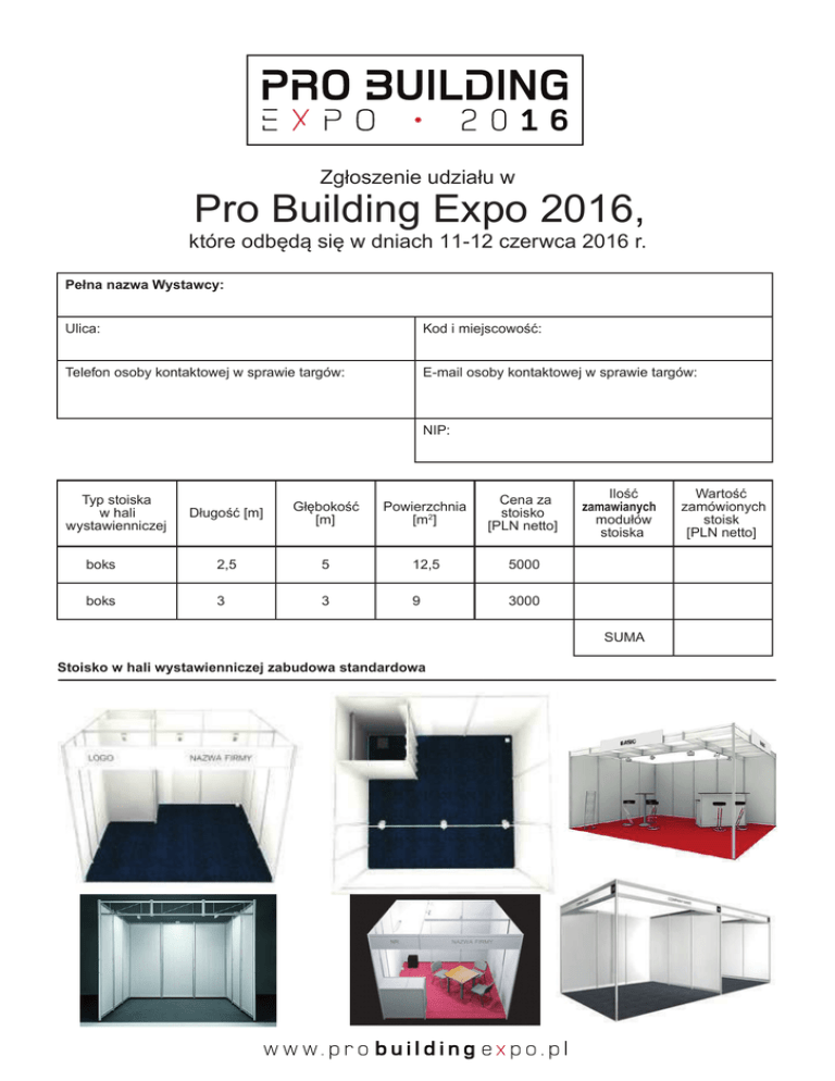 Zgłoszenie udziału w Pro Building Expo 2016, które odbędą się w dniach 11-12 czerwca 2016 r. Pełna nazwa Wystawcy: Ulica: Kod i miejscowość: Telefon osoby kontaktowej w sprawie targów: E-mail osoby kontaktowej w sprawie targów: NIP: Typ stoiska w hali wystawienniczej Długość [m] Głębokość [m] Powierzchnia [m2] Cena za stoisko [PLN netto] boks 2,5 5 12,5 5000 boks 3 3 9 3000 Ilość zamawianych modułów stoiska Wartość zamówionych stoisk [PLN netto] SUMA Stoisko w hali wystawienniczej zabudowa standardowa ------------------------------------------------------------------------------------------------------------------------------------------------------------------------------------------------------------------------------------------------------------------------------------------------- Wyposażenie standardowe stoiska w hali wystawienniczej • na fryzie nazwa firmy. Łączna długość fryzu 5m. Wysokość 0,30m (tło białe; kolor czcionki czarny); • oświetlenie stoiska; • ściany działowe kolor biały - OKTA-NORMA; • lada o wysokości 1m, szerokości 0,5m ( proszę zaznaczyć długość lady: 1m, 2m, 3m, 4m, bez lady); Wyposażenie dodatkowe Rodzaj opcji Cena [PLN netto] Krzesło 12 Stolik 60 Gniazdo 230V 350 Gniazdo 380V 450 Przyłącze wody Ustalenie indywidualne Wykładzina 11,50 / m 2 Dodatkowy bilet dwu osobowy na wieczorną imprezę 380 Hostessy 500 zł /osobę / dwa dni targów Zamawiana Ilość Wartość [PLN netto] Uwagi 1 zaproszenie ważne jest dla 2 osób Dodatkowe potrzeby wystawców powyżej nie zdefiniowane. Proszę o podanie zapotrzebowania. Zostanie ono indywidualnie wycenione SUMA Sympozjum bezpłatne Proszę skreślić wybraną opcję Sympozjum w hali konferencyjnej (opcja bezpłatna dostępna dla stoisk powyżej 5000 zł) TAK / NIE Sympozjum płatne Proszę skreślić wybraną opcję Koszt sympozjum [PLN netto] TAK / NIE 599,00 zł Sympozjum z głównej sceny. Czas trwania sympozjum 20 minut Czas trwania sympozjum Wzór napisu na fryzie stoiska Niestandardowy lub dodatkowy napis na fryzie, logo na fryzie Dodatkowy napis / logotyp Ilość Cena [PLN netto] 100 zł / napisa / logotyp Wartość [PLN netto] UWAGA! Logotyp do umieszczenia na fryzie powinien być przesłany pod adres: [email protected] Typy plików: CDR, PDF, EPS, AL, TIF, JPEG 300 dpi STOISKA POZA HALĄ Stoisko poza halą Standardowy przybliżony wymiar 5m x 5m. Dopuszczalne jest zwiększenie ekspozycji o 20%. Długość [m] Głębokość [m] Powierzchnia [m2] Cena za stoisko [PLN netto] Ilość zamawianych modułów stoiska 5000 Proszę o podanie wymiarów swojego stoiska Małe stoisko Standardowy przybliżony wymiar to 3m x 3m. Proszę o podanie dokładnego wymiaru stoiska 3000 SUMA Wartość zamówionych stoisk [PLN netto] Co zawierają poszczególne pakiety wystawiennicze ? Moduły o wartości 5000 zł i powyżej: • 1 zaproszenie dwuosobowe na imprezę VIP po zakończeniu pierwszego dnia targów 11.06.2016 • 100 zaproszeń indywidualnych z dużym logiem wystawcy na potrzeby wystawcy • logo wystawcy na wszystkich zaproszeniach • logo wystawcy na wszelkich informatorach o targach, drukowanych i rozdawanych na terenie targów oraz dołączanych do zaproszeń indywidualnych. Ilość informatorów 20 000 egzemplarzy • logo wystawcy na stronie targowej www.probuildingexpo.pl • napis z nazwą wystawcy na frezie nad stoiskiem ( w przypadku gdy stoisko jest umieszczone w hali wystawienniczej) • możliwość zorganizowania indywidualnego konkursu, który zostanie uwzględniony w scenariuszu imprezy oraz zapowiedziany z głównej sceny • możliwość zorganizowania sympozjum w hali konferencyjnej. Sympozjum zapowiedziane ze sceny oraz wpisane w program targów Kwestie organizacyjne. Wysyłka elementów ekspozycji spedycją na miejsce Targów. Od środy 08.06.2016 do piątku 10.06.2016 w godzinach od 10.00-18.00 na terenie PRO BUILDING EXPO będzie czynny magazyn, do którego można kierować wysyłki elementów Państwa ekspozycji. Po targach, elementy ekspozycji, które będą chcieli Państwo przesłać spedycją można zdać do magazynu targowego i nadać jego odbiór. Magazyn po targach będzie czynny od 13.06 do 15.06.2016, w godzinach od 10.00-18.00. Elementy oddawane do magazynu powinny być składowane na paletach i odpowiednio zabezpieczone. Firmy, które nie mają swoich materiałów wystawienniczych: systemów wystawienniczych, materiałów poligraficznych czy gadżetów proszę o kontakt na adres e-mail: [email protected] Jesteśmy w stanie zaprojektować Państwu stoisko od podstaw. Adres magazynu: Teren parku Nadraduńskiego Centrum Turystyczno Rekreacyjnego 83-322 Stężyca ul. Parkowa 4 tel kontaktowy do osoby przyjmującej przesyłki 794 510 282 Proszę podać imię i nazwisko oraz serię dowodu osobistego osoby upoważnionej z ramienia Państwa firmy, która na terenie targów będzie odbierać Państwa przesyłkę z magazynu targowego: …............................................................................................................................................................................. Imię i Nazwisko seria i numer dowodu osobistego Potwierdzam zgłoszenie oraz zaakceptowanie regulaminu targów …....................................................................... podpis wystawcy