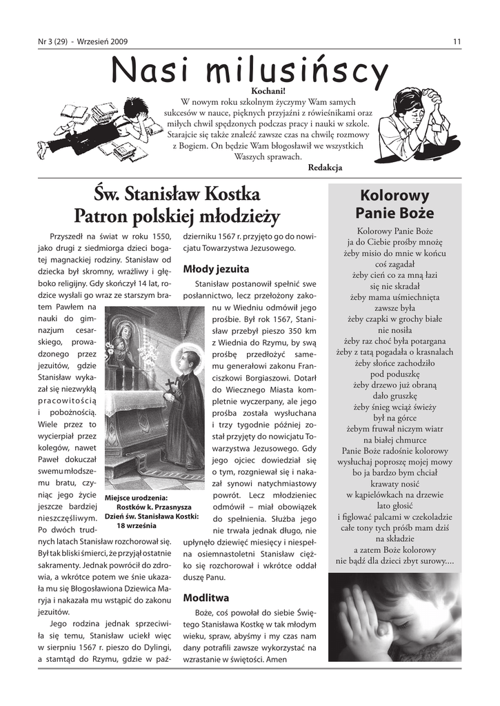 Nr 3 (29) - Wrzesień 2009 Nasi milusińscy 11 Kochani! W nowym roku szkolnym życzymy Wam samych sukcesów w nauce, pięknych przyjaźni z rówieśnikami oraz miłych chwil spędzonych podczas pracy i nauki w szkole. Starajcie się także znaleźć zawsze czas na chwilę rozmowy z Bogiem. On będzie Wam błogosławił we wszystkich Waszych sprawach. Redakcja Św. Stanisław Kostka Patron polskiej młodzieży Przyszedł na świat w roku 1550, dzierniku 1567 r. przyjęto go do nowijako drugi z siedmiorga dzieci boga- cjatu Towarzystwa Jezusowego. tej magnackiej rodziny. Stanisław od dziecka był skromny, wrażliwy i głę- Młody jezuita boko religijny. Gdy skończył 14 lat, roStanisław postanowił spełnić swe dzice wysłali go wraz ze starszym bra- posłannictwo, lecz przełożony zakotem Pawłem na nu w Wiedniu odmówił jego nauki do gimprośbie. Był rok 1567, Staninazjum cesarsław przebył pieszo 350 km skiego, prowaz Wiednia do Rzymu, by swą dzonego przez prośbę przedłożyć samejezuitów, gdzie mu generałowi zakonu FranStanisław wykaciszkowi Borgiaszowi. Dotarł zał się niezwykłą do Wiecznego Miasta kompracowitością pletnie wyczerpany, ale jego i pobożnością. prośba została wysłuchana Wiele przez to i trzy tygodnie później zowycierpiał przez stał przyjęty do nowicjatu Tokolegów, nawet warzystwa Jezusowego. Gdy Paweł dokuczał jego ojciec dowiedział się swemu młodszeo tym, rozgniewał się i nakamu bratu, czyzał synowi natychmiastowy niąc jego życie Miejsce urodzenia: powrót. Lecz młodzieniec jeszcze bardziej Rostków k. Przasnysza odmówił – miał obowiązek nieszczęśliwym. Dzień św. Stanisława Kostki: do spełnienia. Służba jego 18 września Po dwóch trudnie trwała jednak długo, nie nych latach Stanisław rozchorował się. upłynęło dziewięć miesięcy i niespełBył tak bliski śmierci, że przyjął ostatnie na osiemnastoletni Stanisław ciężsakramenty. Jednak powrócił do zdro- ko się rozchorował i wkrótce oddał wia, a wkrótce potem we śnie ukaza- duszę Panu. ła mu się Błogosławiona Dziewica Maryja i nakazała mu wstąpić do zakonu Modlitwa jezuitów. Boże, coś powołał do siebie ŚwięJego rodzina jednak sprzeciwi- tego Stanisława Kostkę w tak młodym ła się temu, Stanisław uciekł więc wieku, spraw, abyśmy i my czas nam w sierpniu 1567 r. pieszo do Dylingi, dany potrafili zawsze wykorzystać na a stamtąd do Rzymu, gdzie w paź- wzrastanie w świętości. Amen Kolorowy Panie Boże Kolorowy Panie Boże ja do Ciebie prośby mnożę żeby misio do mnie w końcu coś zagadał żeby cień co za mną łazi się nie skradał żeby mama uśmiechnięta zawsze była żeby czapki w grochy białe nie nosiła żeby raz choć była potargana żeby z tatą pogadała o krasnalach żeby słońce zachodziło pod poduszkę żeby drzewo już obraną dało gruszkę żeby śnieg wciąż świeży był na górce żebym fruwał niczym wiatr na białej chmurce Panie Boże radośnie kolorowy wysłuchaj poproszę mojej mowy bo ja bardzo bym chciał krawaty nosić w kąpielówkach na drzewie lato głosić i figlować palcami w czekoladzie całe tony tych próśb mam dziś na składzie a zatem Boże kolorowy nie bądź dla dzieci zbyt surowy....
