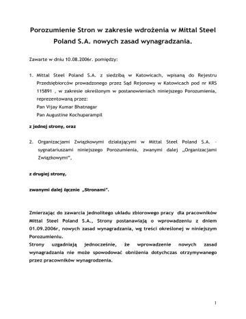 Porozumienie Stron w zakresie wdrożenia w Mittal Steel Poland S.A. nowych zasad wynagradzania. Zawarte w dniu 10.08.2006r. pomiędzy: 1. Mittal Steel Poland S.A. z siedzibą w Katowicach, wpisaną do Rejestru Przedsiębiorców prowadzonego przez Sąd Rejonowy w Katowicach pod nr KRS 115891 , w zakresie określonym w postanowieniach niniejszego Porozumienia, reprezentowaną przez: Pan Vijay Kumar Bhatnagar Pan Augustine Kochuparampil z jednej strony, oraz 2. Organizacjami Związkowymi działającymi w Mittal Steel Poland S.A. – sygnatariuszami niniejszego Porozumienia, zwanymi dalej „Organizacjami Związkowymi”, z drugiej strony, zwanymi dalej łącznie „Stronami”. Zmierzając do zawarcia jednolitego układu zbiorowego pracy dla pracowników Mittal Steel Poland S.A., Strony postanawiają o wprowadzeniu z dniem 01.09.2006r, nowych zasad wynagradzania, wg treści określonej w niniejszym Porozumieniu. Strony uzgadniają jednocześnie, że wprowadzenie nowych zasad wynagradzania nie może spowodować obniżenia dotychczas otrzymywanego przez pracowników wynagrodzenia. 1 I. Zasady wynagradzania: 1. Płaca zasadnicza zostaje ustalona poprzez włączenie do płacy dotychczasowej, takich składników jak: 1) dodatku za staż pracy/wysługa lat i ekwiwalentu za węgiel, wypłacanych w Oddziałach Spółki w Krakowie i w Sosnowcu, 2) dodatku za drugi zawód, dodatku za pracę na wysokości i dodatków funkcyjnych w Oddziale w Sosnowcu, 3) stałej części premii w Oddziale w Świętochłowicach i w Oddziale w Sosnowcu, przy czym w Oddziale w Sosnowcu po uwzględnieniu skutków; wraz z dokonaniem w/w zmiany skreśla się jednocześnie postanowienia cz.I. ust.5. Zasad uruchamiania i przyznawania funduszu premiowego i dodatkowego funduszu motywacyjnego dla pracowników Mittal Steel Poland S.A. 4) funduszu celowego w Oddziale w Dąbrowie Górniczej, 5) dodatku za pracę w warunkach szkodliwych wypłacanego w tzw. I grupie szkodliwości, dla wszystkich pracowników uprawnionych do otrzymywania dodatków szkodliwych, z jednoczesnym pozostawieniem trzech dotychczasowych grup oraz zlikwidowaniem 4 grupy szkodliwości. ` Strony ustalają ponadto, że dla pracowników zatrudnionych w Oddziale w Dąbrowie Górniczej: a) dodatek w drugiej grupie szkodliwości przysługuje także za każdą godzinę pracy pracownikom uprawnionym do urlopu zdrowotnego w ilości 6 dni w roku, b) dodatek w trzeciej grupie szkodliwości przysługuje także za każdą godzinę pracy pracownikom uprawnionym do urlopu zdrowotnego w ilości 9 lub 12 dni w roku. 6) innych dodatków, (dodatek dyspozycyjny w ZHC, dodatek za pracę w pojedynczej obsadzie – obsługa lokomotyw, wyrównanie premii ZHS). 2. Miesięczne płace zasadnicze dla wszystkich pracowników. Kwoty miesięczne dla pracowników, którzy dotychczas mieli ustalone stawki godzinowe, zostaną ustalone przez pomnożenie stawki godzinowej przez średniomiesięczny nominalny czas pracy w roku kalendarzowym, co oznacza dla 2 roku 2006 – 168h. Strony ustalają jednocześnie, że w przypadku gdy w wyniku uregulowań prawnych, w miejsce czterobrygadowej organizacji pracy ( 4BOP) niezbędne okaże się wprowadzenie innego systemu czasu pracy, podjęte zostaną negocjacje w zakresie określenia zasad i sposobu stosowania nowego systemu czasu pracy, 3. Dodatki zmianowe tj. za pracę w czterobrygadowej organizacji pracy ( 4BOP) są określone w postaci ryczałtowej ( procentowej) za każdą godzinę pracy w tym systemie w wysokości 30%, wraz z przyjęciem jednolitego, 16-sto tygodniowego okresu rozliczeniowego. Dodatkowo, dla tej grupy pracowników przyjęta zostaje zasada, zgodnie z którą pracownik systemu 4BOP, niezależnie od 30 % dodatku otrzymywać będzie za pracę w Święta Bożego Narodzenia, oraz w Święta Wielkanocne, dodatki 100% wynikające z osobistego zaszeregowania. Szczegółowe zasady stosowania zmianowej organizacji pracy określa załącznik nr 1. Strony ustalają jednocześnie, że przez stawkę godzinową wg zaszeregowania pracownika - rozumie się stawkę wyliczoną przez podzielenie zasadniczego wynagrodzenia miesięcznego przez średniomiesięczny nominalny czas pracy w roku kalendarzowym, jednak nie więcej niż przez 174, z przyjęciem tylko pełnych godzin i zaokrągleniu do pełnych groszy w górę. 4. Dodatkowo Strony ustalają, że dla pracowników zatrudnionych w innych niż czterobrygadowy system pracy, za każdą godzinę pracy w godzinach nocnych, tj. w godzinach od 2200 do 600 , przysługuje dodatek w wysokości 20 % stawki godzinowej wynikającej z osobistego zaszeregowania pracownika. Strony ustalają jednocześnie, że dotychczas wypłacane kwoty z tytułu pracy na zmianie popołudniowej zostaną wkalkulowane do wynagrodzenia pracownika, z uwzględnieniem skutków pochodnych. 5. Czas pracy w czterobrygadowej organizacji pracy będzie rozliczany wg dotychczasowych harmonogramów pracy, wg założeń: a) w każdym miesiącu wypłata wynagrodzenia za czas pracy danego miesiąca, 3 b) po zakończeniu cyklu organizacyjnego wypłata różnicy czasu pracy, czyli dopłat 100% do czasu ponadnormatywnego. c) począwszy od 01.01.2007r. wprowadzony zostanie jednolity harmonogram pracy brygad w czterobrygadowej organizacji pracy, przy czym w ZHC i ZHF w dalszym ciągu stosowane będą uzupełniające dni wolne. 6. Pracownik pełniący funkcję brygadzisty brygadzistowski, który wynosić będzie od 100 będzie otrzymywał dodatek do 200zł i będzie wypłacany wg zasad stanowiących załącznik nr 2. 1) w przypadku wystąpienia wzrostu dotychczas otrzymywanego dodatku brygadzistowskiego zostanie on pokryty z dodatkowych 100zł uruchamianych wraz z wdrożeniem kolejnego etapu w zasadach wynagradzania w ramach ujednolicania ZUZP, 2) Strony ustalają jednocześnie, że dotychczas wypłacane kwoty dodatku: a) przekraczające 200zł, b) dla pracowników - brygadzistów, którym podlega mniej niż 5 pracowników, zostaną wkalkulowane do wynagrod