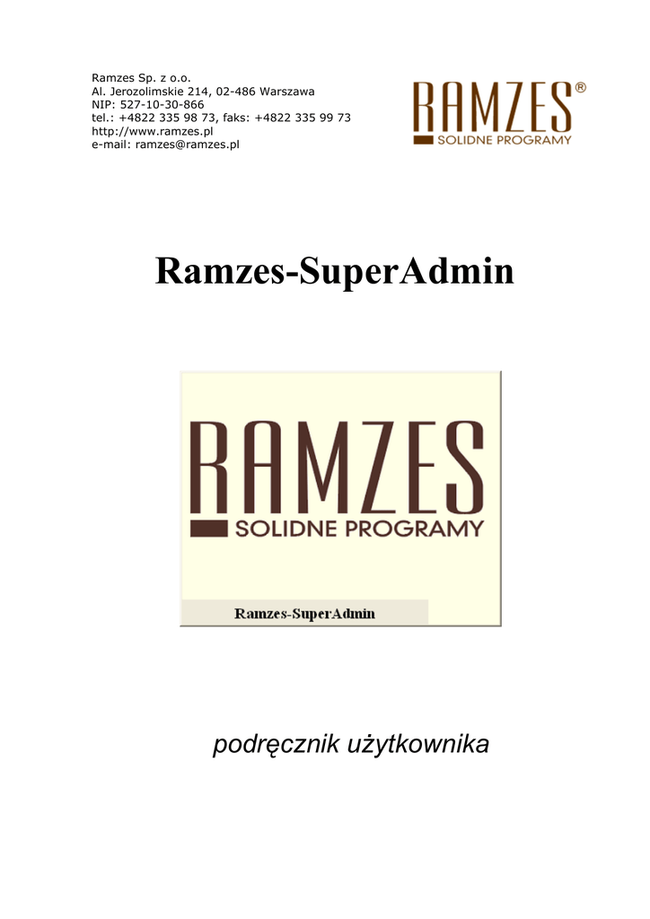 Ramzes Sp. z o.o. Al. Jerozolimskie 214, 02-486 Warszawa NIP: 527-10-30-866 tel.: +4822 335 98 73, faks: +4822 335 99 73 http://www.ramzes.pl e-mail: [email protected] Ramzes-SuperAdmin podręcznik uŜytkownika Ramzes Sp. z o.o. jest wyłącznym właścicielem praw, w tym wszelkich majątkowych praw autorskich do programu oraz treści podręcznika uŜytkownika. Powielanie w jakiejkolwiek formie programu lub treści podręcznika bez pisemnej zgody firmy Ramzes Sp. z o.o. jest zabronione. Warszawa, sierpień 2007 Opracowanie i skład: Ramzes Sp. z o.o. Ramzes – SuperAdmin podręcznik uŜytkownika I SPIS TREŚCI 1 WSTĘP ............................................................................................................................ 1 1.1 2 O PROGRAMIE I PODRĘCZNIKU ............................................................................. 3 2.1 2.2 3 Pomoc ...............................................................................................................33 O Programie......................................................................................................33 UWAGI KOŃCOWE .................................................................................................... 34 8.1 9 Deklaracje.........................................................................................................27 Raporty. ............................................................................................................30 Archiwa ............................................................................................................30 Deklaracje.........................................................................................................31 MENU O PROGRAMIE............................................................................................... 33 7.1 7.2 8 Otwieranie bazy................................................................................................15 Menu programu ................................................................................................17 Rozwijanie i zwijanie Firmy/Listy firm. ..........................................................18 Tworzenie archiwów. .......................................................................................19 Archiwa firm.....................................................................................................20 Archiwum wspólne...........................................................................................21 Archiwum wspólne baz programu SuperAdmin. .............................................21 Odtwarzanie archiwów. ....................................................................................22 Usuwanie firm. .................................................................................................23 Kopiowanie danych. .........................................................................................25 ZESTAWIENIA. ............................................................................................................ 27 6.1 6.2 6.2.1 6.2.2 7 Uruchomienie programu.....................................................................................9 Rejestracja, zmiana hasła, zmiana daty systemowej. .......................................11 Rejestracja programu........................................................................................11 Zmiana hasła.....................................................................................................13 Zmiana daty systemowej. .................................................................................14 PRACA Z DANYMI APLIKACJI RAMZES.............................................................. 15 5.1 5.2 5.3 5.4 5.4.1 5.4.2 5.4.3 5.5 5.6 5.7 6 Uruchomienie kreatora instalacji programu .......................................................5 URUCHOMIENIE PROGRAMU ................................................................................. 9 4.1 4.2 4.2.1 4.2.2 4.2.3 5 O Aplikacji Ramzes............................................................................................3 Przeznaczenie programu Ramzes-SuperAdmin .................................................4 INSTALACJA PROGRAMU ....................................................................................... 5 3.1 4 Forma prezentacji ...............................................................................................1 SPIS Zakres odpowiedzialności ................................................................................34 I L U S T R A C J I ..................................................................................... 35 II Aplikacja Ramzes – SuperAdmin podręcznik uŜytkownika 1 Aplikacja Ramzes – SuperAdmin podręcznik uŜytkownika 1 Rozdział 1 WSTĘP Podręcznik uŜytkownika zawiera informacje o komercyjnym programie oferowanym pod nazwą handlową Ramzes–SuperAdmin. Część informacji niezbędnych do korzystania z programów wchodzących w skład Aplikacji Ramzes zawiera równieŜ podręcznik uŜytkownika programu Ramzes-Administrator. NaleŜy go traktować jako wstęp do niniejszej instrukcji. Informacje o programie przygotowano dla wersji 06.01.01. DołoŜono wszelkich starań, aby informacje zawarte w podręczniku były kompletne i zgodne ze stanem oprogramowania na dzień przygotowania niniejszego opracowania (20067-07-05). Niemniej, z powodu nieustannie prowadzonych prac rozwojowych, producent zastrzega sobie prawo do wprowadzania zmian w programie. W związku z powyŜszym zakres funkcjonalny dostarczanego programu moŜe być inny niŜ wynika to z opisu. 1.1 Forma prezentacji Poszczególne funkcje programu zostały zaprezentowane w sposób umoŜliwiający szybkie rozpoczęcie pracy. Informacje przedstawiono w kolejności wynikającej z potrzeb konfiguracji programu oraz sposobu jego uŜytkowania podczas normalnej eksploatacji. śyczymy miłej pracy z systemem Ramzes Sp. z o.o. 2 Aplikacja Ramzes – SuperAdmin podręcznik uŜ