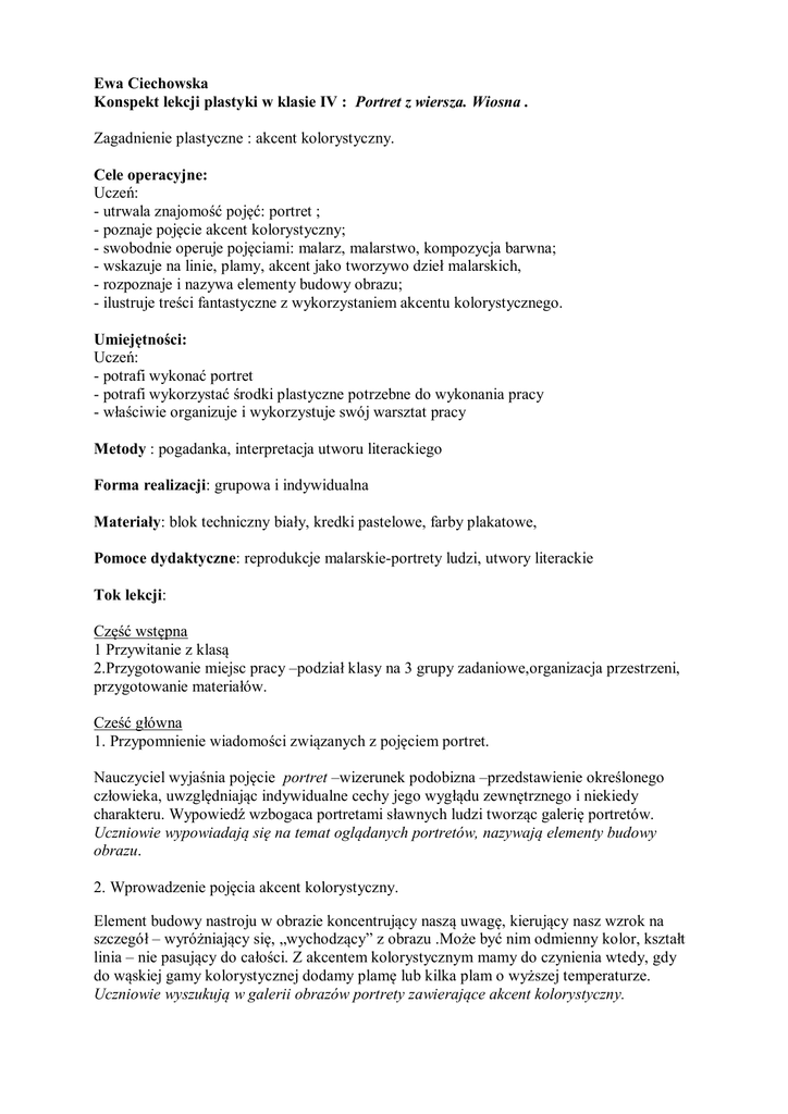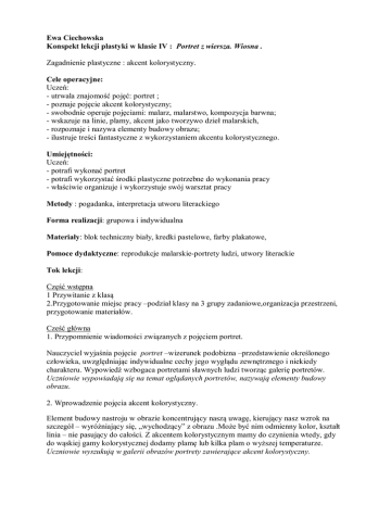 Ewa Ciechowska Konspekt lekcji plastyki w klasie IV : Portret z wiersza. Wiosna . Zagadnienie plastyczne : akcent kolorystyczny. Cele operacyjne: Uczeń: - utrwala znajomość pojęć: portret ; - poznaje pojęcie akcent kolorystyczny; - swobodnie operuje pojęciami: malarz, malarstwo, kompozycja barwna; - wskazuje na linie, plamy, akcent jako tworzywo dzieł malarskich, - rozpoznaje i nazywa elementy budowy obrazu; - ilustruje treści fantastyczne z wykorzystaniem akcentu kolorystycznego. Umiejętności: Uczeń: - potrafi wykonać portret - potrafi wykorzystać środki plastyczne potrzebne do wykonania pracy - właściwie organizuje i wykorzystuje swój warsztat pracy Metody : pogadanka, interpretacja utworu literackiego Forma realizacji: grupowa i indywidualna Materiały: blok techniczny biały, kredki pastelowe, farby plakatowe, Pomoce dydaktyczne: reprodukcje malarskie-portrety ludzi, utwory literackie Tok lekcji: Część wstępna 1 Przywitanie z klasą 2.Przygotowanie miejsc pracy –podział klasy na 3 grupy zadaniowe,organizacja przestrzeni, przygotowanie materiałów. Cześć główna 1. Przypomnienie wiadomości związanych z pojęciem portret. Nauczyciel wyjaśnia pojęcie portret –wizerunek podobizna –przedstawienie określonego człowieka, uwzględniając indywidualne cechy jego wygłądu zewnętrznego i niekiedy charakteru. Wypowiedź wzbogaca portretami sławnych ludzi tworząc galerię portretów. Uczniowie wypowiadają się na temat oglądanych portretów, nazywają elementy budowy obrazu. 2. Wprowadzenie pojęcia akcent kolorystyczny. Element budowy nastroju w obrazie koncentrujący naszą uwagę, kierujący nasz wzrok na szczegół – wyróżniający się, „wychodzący” z obrazu .Może być nim odmienny kolor, kształt linia – nie pasujący do całości. Z akcentem kolorystycznym mamy do czynienia wtedy, gdy do wąskiej gamy kolorystycznej dodamy plamę lub kilka plam o wyższej temperaturze. Uczniowie wyszukują w galerii obrazów portrety zawierające akcent kolorystyczny. 3. Podanie tematu pracy i wyjaśnienie zadania plastycznego. 4. Zapoznanie z wierszami (każda grupa otrzymuje jeden wierszyk): I. Postać lekka i radosna, Długonoga, długowłosa. Oczy błyszczące, usta w zachwycie. W błękitnej sukni biegnie o świcie. Na głowie wianek, a w dłoniach trzyma czerwone tulipany. II. Moje oczy są jak dwa dołki, w których rośnie zielona trawa. Moje usta są jak czereśnie. Mój nos jest jak pochyła droga. Moje włosy są jak brązowe jak drzewo długie do ziemi, Moje ramiona obrastają w kwiaty, siadają na nich motyle. Moje dłonie są jak odnóża ośmiornicy otoczone listkami. Moje ciało jest zielone. III. Boso po łące wiosna biega, Kwiaty we włosach wiatr jej rozwiewa. Policzki rumiane, usta palące, W krótkiej sukience biega wiosna po łące. 5. Pogadanka na temat wierszy: - O kim opowiadają wiersze? - W jaki sposób opisane są oczy, usta, włosy….? - Który element portretu wyróżnia się ? 6. Indywidualna praca uczniów ( każda grupa ilustruje jeden wiersz) Uczniowie mają przygotowane materiały do pracy rozpoczynają wykonywać swoje portrety zaznaczając akcent kolorystyczny ( w obrazie, niektóre elementy kredkami, niektóre farbami, dodają własne elementy nie zapominając o tle w obrazie) Prace wykonują farbami, mocniej zaznaczając niektóre elementy –np. usta, kwiaty, motyle - akcent kolorystyczny. Podczas wykonywania prac nauczyciel udziela rad, służy pomocą. Cześć końcowa 1.Uczniowie prezentują swoje prace, dzielą się wrażeniami. Nauczyciel dokonuje oceny. 2. Wykonanie wystawki prac. 3. Porządkowanie miejsc pracy.