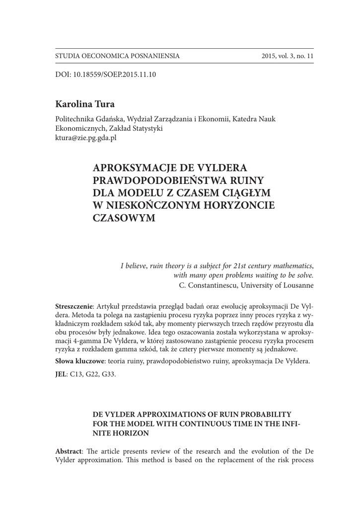 STUDIA OECONOMICA POSNANIENSIA 2015, vol. 3, no. 11 DOI: 10.18559/SOEP.2015.11.10 Karolina Tura Politechnika Gdańska, Wydział Zarządzania i Ekonomii, Katedra Nauk Ekonomicznych, Zakład Statystyki [email protected] APROKSYMACJE DE VYLDERA PRAWDOPODOBIEŃSTWA RUINY DLA MODELU Z CZASEM CIĄGŁYM W NIESKOŃCZONYM HORYZONCIE CZASOWYM I believe, ruin theory is a subject for 21st century mathematics, with many open problems waiting to be solve. C. Constantinescu, University of Lousanne Streszczenie: Artykuł przedstawia przegląd badań oraz ewolucję aproksymacji De Vyldera. Metoda ta polega na zastąpieniu procesu ryzyka poprzez inny proces ryzyka z wykładniczym rozkładem szkód tak, aby momenty pierwszych trzech rzędów przyrostu dla obu procesów były jednakowe. Idea tego oszacowania została wykorzystana w aproksymacji 4-gamma De Vyldera, w której zastosowano zastąpienie procesu ryzyka procesem ryzyka z rozkładem gamma szkód, tak że cztery pierwsze momenty są jednakowe. Słowa kluczowe: teoria ruiny, prawdopodobieństwo ruiny, aproksymacja De Vyldera. JEL: C13, G22, G33. DE VYLDER APPROXIMATIONS OF RUIN PROBABILITY FOR THE MODEL WITH CONTINUOUS TIME IN THE INFINITE HORIZON Abstract: The article presents review of the research and the evolution of the De Vylder approximation. This method is based on the replacement of the risk process 134 Karolina Tura by another risk process with exponentially distributed claims such that the first three moments coincide. This idea was used also in the 4-gamma De Vylder approximation based on the replacement of the risk process by another risk process with gamma distributed claims such that the first four moments coincide. Keywords: ruin theory, ruin probability, De Vylder approximation. Wstęp Teoria ruiny stanowi narzędzie badania procesu opisującego nadwyżkę finansową zakładu ubezpieczeniowego w długim okresie. Jest to proces długookresowy i dynamiczny, w którym uwaga jest skoncentrowana na zmianach w czasie środków finansowych, którymi dysponuje zakład ubezpieczeniowy. Analizie jest poddawany proces gromadzenia bądź przejadania środków finansowych i aktywów. Pozwala ona na analizę możliwości dywersyfikacji ryzyka działalności ubezpieczeniowej w czasie. W tym przypadku dywersyfikacja określa kompensację strat poniesionych w jednych latach nadwyżką finansową osiąganą w innych [Otto 2008, s. 214–215] . Artykuł dotyczy metod wyznaczania prawdopodobieństwa ruiny, w szczególności aproksymacji prawdopodobieństwa ruiny w modelu ciągłym dla nieskończonego horyzontu czasowego. Celem artykułu jest przedstawienie, porównanie oraz przegląd aproksymacji typu De Vyldera. Artykuł został podzielony na pięć części. W pierwszej z nich zawarto wprowadzenie do szacowania prawdopodobieństwa ruiny w modelu ciągłym w nieskończonym okresie. Kolejne dwie prezentują aproksymację De Vyldera oraz 4gamma De Vyldera. W ostatniej części przedstawiono przegląd badań empirycznych oraz porównanie powyższych aproksymacji. 1. Aproksymacje prawdopodobieństwa ruiny dla modelu z czasem ciągłym w nieskończonym horyzoncie czasowym Modelowy opis procesu nadwyżki finansowej ubezpieczyciela w czasie ciągłym jest zdefiniowany jako U (t ) = u + ct − S(t ), gdzie: t ≥ 0, Aproksymacje De Vyldera prawdopodobieństwa ruiny dla modelu z czasem135 u ≥ 0 – nadwyżka początkowa, czyli stan środków w momencie 0, {U (t ), t ≥ 0} – proces ryzyka generowany poprzez proces liczby wy płat, intensywność składki oraz kapitał początkowy, c – suma składki otrzymanej za jednostkowy okres, przy czym zakłada się, że tempo napływu składki w czasie jest stałe, ct – osiągnięty dochód ze składki do chwili, S(t ) = N (t ) ∑ Xi i =1 – łączna wartość odszkodowań za szkody zaistniałe w okresie (0, t], gdzie: N(t) – liczba szkód zaistniałych w tym okresie, { N ( t ), t ≥ 0} – proces liczby wypłat, 0 = T0 < T1 < T2 ... – momenty zgłoszenia wypłaty generowane poprzez proces liczby wypłat, X1 , X2 , X3 ,... – niezależne wielkości wypłaty o jednakowych rozkładach. Ponadto {N (t ), t ≥ 0} oraz { Xi }i∞=1 są niezależne. Oznacza to, że parametry procesu N(t) są w ogólności zależne od liczby ryzyk ubezpieczanych na jednostkę czasu i zakłada się, że proces pojawiania się szkód w czasie jest niezależny od wielkości szkód, a poszczególne szkody posiadają takie same rozkłady prawdopodobieństwa. Należy zauważyć, iż cechą procesu S(t) jest podwójna losowość, wysokość szkód Xi oraz liczba szkód N(t) są zmiennymi losowymi [Ostasiewicz 2000, s.157]. Na rysunku zaprezentowano procesy generowane przez N(t) w modelu ciągłym. Ruina ubezpieczyciela następuje, gdy U(t)<0, czyli stan kapitału jest mniejszy od zera. Moment T, w którym nastąpi ruina ubezpieczyciela, jest inf {t ≥ 0 : U (t ) < 0}. Monazywany momentem ruiny i określamy jako T := ment ten jest pierwszym z momentów czasu, w którym nadwyżka zakładu ubezpieczeniowego staje się ujemna [Otto 2008, s. 215–219]. Modele procesu nadwyżki ubezpieczyciela są różne i zależą od takich czynników, jak rozkład zmiennych losowych opisujących liczbę szkód, 136 Karolina Tura Procesy generowane przez N(t) w modelu ciągłym Źródło: [Ostasiewicz 2000, s. 157] wielkość szkód, a także od tego, w jaki sposób jest mierzony czas. Stąd też prawdopodobieństwo ruiny mierzone jest na różne sposoby. Prawdopodobieństwo ruiny w skończonym horyzoncie czasowym definiuje się, jako: ψ (u= , t ) : P (T < t ), natomiast w nieskończonym jako: ψ (= u) : lim ψ (u= , t ) P (T < ∞) t →∞ lub ψ= (u) : P[U (t ) < 0, dla 0 < t < ∞]. Aproksymacje De Vyldera prawdopodobieństwa ruiny dla modelu z czasem137 W zależności od tego, czy kontrola stanu rezerw w modelu dokonywana jest w każdym momencie, czy składki i wypłaty odszkodowań pojawiają się dowolnie, a kontrola wielkości środków przeprowa