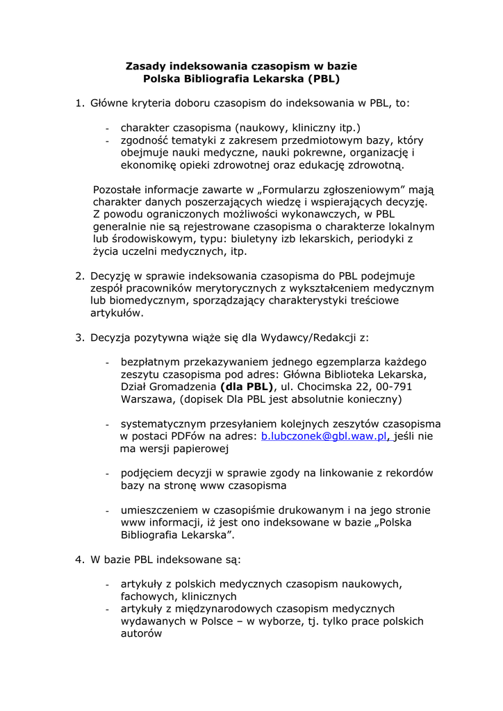 Zasady indeksowania czasopism w bazie Polska Bibliografia Lekarska (PBL) 1. Główne kryteria doboru czasopism do indeksowania w PBL, to: - charakter czasopisma (naukowy, kliniczny itp.) zgodność tematyki z zakresem przedmiotowym bazy, który obejmuje nauki medyczne, nauki pokrewne, organizację i ekonomikę opieki zdrowotnej oraz edukację zdrowotną. Pozostałe informacje zawarte w „Formularzu zgłoszeniowym” mają charakter danych poszerzających wiedzę i wspierających decyzję. Z powodu ograniczonych możliwości wykonawczych, w PBL generalnie nie są rejestrowane czasopisma o charakterze lokalnym lub środowiskowym, typu: biuletyny izb lekarskich, periodyki z życia uczelni medycznych, itp. 2. Decyzję w sprawie indeksowania czasopisma do PBL podejmuje zespół pracowników merytorycznych z wykształceniem medycznym lub biomedycznym, sporządzający charakterystyki treściowe artykułów. 3. Decyzja pozytywna wiąże się dla Wydawcy/Redakcji z: - bezpłatnym przekazywaniem jednego egzemplarza każdego zeszytu czasopisma pod adres: Główna Biblioteka Lekarska, Dział Gromadzenia (dla PBL), ul. Chocimska 22, 00-791 Warszawa, (dopisek Dla PBL jest absolutnie konieczny) - systematycznym przesyłaniem kolejnych zeszytów czasopisma w postaci PDFów na adres: [email protected], jeśli nie ma wersji papierowej - podjęciem decyzji w sprawie zgody na linkowanie z rekordów bazy na stronę www czasopisma - umieszczeniem w czasopiśmie drukowanym i na jego stronie www informacji, iż jest ono indeksowane w bazie „Polska Bibliografia Lekarska”. 4. W bazie PBL indeksowane są: - artykuły z polskich medycznych czasopism naukowych, fachowych, klinicznych artykuły z międzynarodowych czasopism medycznych wydawanych w Polsce – w wyborze, tj. tylko prace polskich autorów - artykuły z czasopism z nauk pokrewnych – w wyborze. 5. Do bazy nie są włączane dane dotyczące tekstów sponsorowanych, artykułów reklamowych, przedruków, streszczeń, krótkich informacji, itp. 6. Artykuły opracowywane są z autopsji i wg zasad stosowanych w US National Library of Medicine przy tworzeniu światowej bazy Medline. 7. Charakterystyka treściowa artykułu, która jest równocześnie jego charakterystyką wyszukiwawczą, sporządzana jest z wykorzystaniem terminologii medycznej z własnej polskiej wersji Medical Subject Headings – bazy TezMeSH (kontrolowany język informacyjno-wyszukiwawczy). 8. Każdy rekord bazy PBL zawiera: - opis bibliograficzny artykułu jego charakterystykę treściową streszczenie polskie (jeśli jest) streszczenie angielskie (jeśli jest) link na stronę www czasopisma, dający możliwość dotarcia do pełnego tekstu artykułu przejście do bazy „Katalog czasopism indeksowanych w PBL”. 9. Baza PBL opracowywana jest na bieżąco i aktualizowana raz na kwartał.