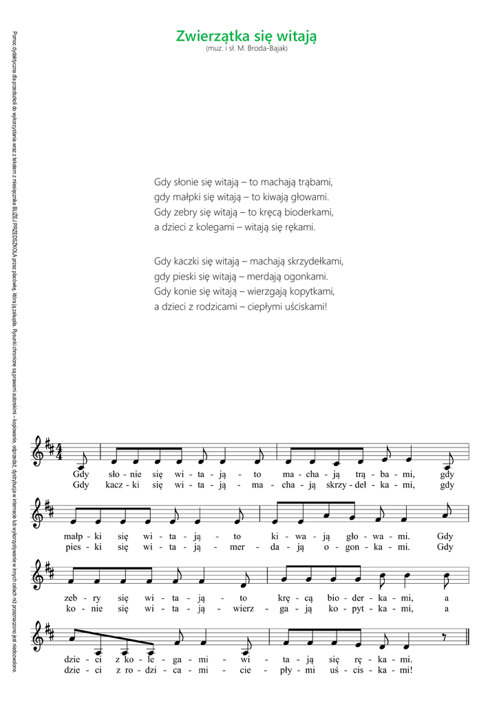 Pomoc dydaktyczna dla przedszkoli do wykorzystania wraz z tekstem z miesięcznika BLIŻEJ PRZEDSZKOLA przez placówkę, która ją zakupiła. Rysunki chronione są prawami autorskimi – kopiowanie, odprzedaż, dystrybucja w internecie lub wykorzystywanie w innych celach niż przeznaczono jest niedozwolone. Zwierzątka się witają (muz. i sł. M. Broda-Bajak) Gdy słonie się witają – to machają trąbami, gdy małpki się witają – to kiwają głowami. Gdy zebry się witają – to kręcą bioderkami, a dzieci z kolegami – witają się rękami. Gdy kaczki się witają – machają skrzydełkami, gdy pieski się witają – merdają ogonkami. Gdy konie się witają – wierzgają kopytkami, a dzieci z rodzicami – ciepłymi uściskami!