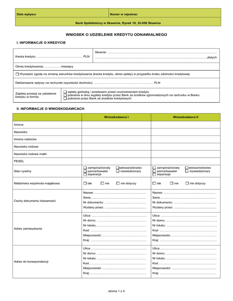 Data wpływu: Numer w rejestrze: Bank Spółdzielczy w Skawinie, Rynek 19, 32-050 Skawina WNIOSEK O UDZIELENIE KREDYTU ODNAWIALNEGO I. INFORMACJE O KREDYCIE Słownie: ……………………………..…………………….……………………………………… Kwota kredytu: …………….………………………. PLN ………………….………………………………..…………………………………………złotych Okres kredytowania: …………… miesięcy Wyrażam zgodę na zmianę warunków kredytowania (kwota kredytu, okres spłaty) w przypadku braku zdolności kredytowej Deklarowane wpływy na rachunek (wysokość dochodu): ………………………………………………… PLN Zapłata prowizji za udzielenie kredytu w formie: wpłaty gotówką / przelewem przed uruchomieniem kredytu pobrania w dniu wypłaty kredytu przez Bank ze środków zgromadzonych na rachunku w Banku pobrania przez Bank ze środków kredytowych II. INFORMACJE O WNIOSKODAWCACH Wnioskodawca I Wnioskodawca II Imiona Nazwisko Imiona rodziców Nazwisko rodowe Nazwisko rodowe matki PESEL Stan cywilny zamężna/żonaty panna/kawaler separacja Małżeńska wspólnota majątkowa tak Cechy dokumentu tożsamości Adres zamieszkania Adres do korespondencji nie wdowa/wdowiec rozwiedziona/y nie dotyczy zamężna/żonaty panna/kawaler separacja tak nie wdowa/wdowiec rozwiedziona/y nie dotyczy Nazwa: …………………………………………. Nazwa: ………………………….………………. Seria…………………………………………….. Seria…………………………….……………….. Nr dokumentu: ……………….………………… Nr dokumentu: …………….…….……………… Wydany przez: ................................................ Wydany przez: ................................................. Ulica: ………………………….…………………. Ulica: ……………………………………………... Nr domu: ………………….…………………….. Nr domu: …………………………………………. Nr lokalu………………….……………………… Nr lokalu: …………………….…………………… Kod: ……………………………………………... Kod: …………………………….………………… Miejscowość: …………………….……………… Miejscowość………………….………………….. Kraj: ……………………………………………... Kraj: ………………………….…………………… Ulica……...………………………….…………… Ulica……...…………………….….……………… Nr domu: ……...………………………………… Nr domu: ……...…………………….…………… Nr lokalu: ……...……………...………………… Nr lokalu: ……...…………….…………………… Kod……...………….……….…………………… Kod……...………..…………….………………… Miejscowość: ……...…………………………… Miejscowość: …………....……………………… Kraj: ……...……………………………………… Kraj: ……...…………….………………………… strona 1 z 4 Wnioskodawca I Nr telefonu (do wyboru) Wnioskodawca II Stacjonarny…………………………….………… stacjonarny: ……………………………………… komórkowy: ………………………….………….. komórkowy: ……………………….……………… E-mail: wyższe magisterskie licencjat/inżynier średnie zasadnicze zawodowe podstawowe/gimnazjalne Wykształcenie wyższe magisterskie licencjat/inżynier średnie zasadnicze zawodowe podstawowe/gimnazjalne Wykonywany zawód III. INFORMACJE O DOCHODACH I WYDATKACH Wnioskodawca I Wnioskodawca II Całkowity staż pracy (w latach) Okres zatrudnienia u obecnego pracodawcy/czas prowadzenia obecnej dział. gospodarczej (w latach) Informacje o pracodawcy (nazwa, adres) właściciel firmy wyższa kadra zarządzająca średnia kadra zarządzająca urzędnik specjalista pracownik inne Stanowisko Miesięczny dochód netto: właściciel firmy wyższa kadra zarządzająca średnia kadra zarządzająca urzędnik specjalista pracownik inne ..................................... PLN, w tym: umowa o pracę: .................................... emerytura: ............................................ renta: .................................................... zasiłek przedemerytalny: ...................... wolne zawody: ...................................... działalność gospodarcza: ..................... działalność rolnicza: ............................. umowa cywilno-prawna: ....................... umowa najmu: ...................................... umowa o pracę na czas określony do…….................: ............................... odsetki z aktywów finansowych: ............................................................. dywidendy: ........................................... inne: ...................................................... Źródła dochodu ..................................... PLN, w tym: umowa o pracę: ........................................ emerytura: ................................................ renta: ........................................................ zasiłek przedemerytalny: .......................... wolne zawody: .......................................... działalność gospodarcza: ......................... działalność rolnicza: ................................. umowa cywilno-prawna: ........................... umowa najmu: .......................................... umowa o pracę na czas określony do…….................: ................................... odsetki z aktywów finansowych: ............................................................. dywidendy: ...............