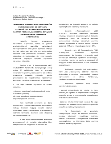 1|Strona Autor: Marzena Pawlicka, Narodowy Instytut Zdrowia Publicznego – Państwowy Zakład Higieny WYMAGANIA ZDROWOTNE DLA MATERIAŁÓW kontaktującej się żywności wykonuje się badanie organoleptyczne oraz testy migracyjne. PRZEZNACZONYCH DO KONTAKTU Z ŻYWNOŚCIĄ – WYMAGANE DOKUMENTY, BADANIA MIGRACJI, ZAGROŻENIA ZWIĄZANE ZE STOSOWANIEM OPAKOWAŃ do kontaktu z żywnością i wyroby z żywnością z najistotniejszych należą czynników powodowały mogących wpływających uwalniania swoich wpływać negatywnie 27 Parlamentu Europejskiego października z żywnością wszystkie przeznaczone do 2004 r. w sprawie materiały bezpośredniego i wyroby i pośredniego kontaktu z żywnością, w warunkach użytkowania: nie mogą stanowić zagrożenia dla zdrowia człowieka; w składzie żywności; - nie mogą powodować pogorszenia cech i szybkość uwalniania się danej substancji do żywności zależy przede wszystkim od żywności materiałom przeznaczonym do kontaktu i wyrobom z żywnością musi towarzyszyć deklaracja zgodności stwierdzająca, że materiały i wyroby są zgodne z przepisami UE mającej kontakt szczegółowymi. Deklaracja zgodności jest dokumentem, który jest termicznej żywności oraz przekazywany do kontaktu z żywnością wprowadzania do odbiorcy materiału na wszystkich obrotu etapach handlowego, z wyłączeniem obrotu detalicznego. Deklaracja zgodności służy przede wszystkim dwóm celom: dla klienta, że dany produkt jest zgodny ze odpowiednimi wymogami przepisów prawa, w tym przepisów szczegółowych z danym - dostarcza klientowi informacji, które są dla niego niezbędne do ustalenia lub sprawdzenia zgodności produktu z właściwymi przepisami. materiałem, czasu i temperatury przechowywania i obróbki powinny o ile zostały ustanowione; organoleptycznych żywności. rodzaju materiały Zgodnie z art. 16 Rozporządzenia (WE) nr 1935/2004 - stanowi potwierdzenie - nie mogą powodować nieakceptowalnych zmian Ilość wszystkie sztucznych globalnej - OML oraz migracji specyficznej - SML. i Rady materiałów i wyrobów przeznaczonych do kontaktu - z tworzyw mającymi do nich zastosowanie, w tym przepisami Zgodnie z art. 3 Rozporządzenie (WE) z dnia zm. spełniać wymagania w zakresie limitów migracji jednych na zdrowie człowieka. nr 1935/2004 z późn. do składników do kontaktujące się z nimi żywności w ilościach (UE) i wyrobów opakowaniowe też tak ważne jest, aby były one wystarczająco i nie materiałów przeznaczone na bezpieczeństwo oraz jakość żywności. Dlatego obojętne z Rozporządzeniem w sprawie z tworzyw sztucznych przeznaczonych do kontaktu Z RECYKLINGU Materiały Zgodnie nr 10/2011 ekspozycji na promieniowanie UV. W celu oceny bezpieczeństwa materiałów przeznaczonych do kontaktu z żywnością i tym samym oceny ich obojętności w stosunku do W Załącznikach do przepisów szczegółowych, w tym dla tworzyw sztucznych, tworzyw sztucznych z recyklingu, ceramiki, celofanu i aktywnych i inteligentnych materiałów wyszczególnione są informacje, jakie powinna zawierać deklaracja zgodności. Forum Jakość w branży FMCG 2016, www.movida.com.pl 2|Strona Zaleca się, aby była z tworzyw sztucznych pochodzących z recyklingu wydawana w co najmniej jednym języku UE, który przeznaczonych do kontaktu z żywnością z późn. jest łatwo zrozumiały zarówno dla dostawcy, jak zm. i dla powinny bezpieczeństwa tworzyw sztucznych pochodzących dotyczyć faktycznego składu materiału. Pojedyncza z recyklingu, których stosowanie może wiązać się deklaracja zgodności nie można dotyczyć kilku z ryzykiem materiałów do żywności, takich jak: klienta. istotnymi deklaracja Podawane informacje o odmiennym różnicami zgodności składzie między skutkującym tymi za wykonywanie urzędowej kontroli żywności, w tym materiałów do kontaktu z żywnością. i wyrobów Urzędowe do kontrole kontaktu materiałów z żywnością są przeprowadzane zgodnie z Rozporządzeniem (WE) nr 882/2004 w sprawie ma migracji na celu substancji kontroli urzędowych przeprowadzanych w celu sprawdzenia zgodności z prawem paszowym i żywnościowym. chemicznych - substancje, które mogły zostać wprowadzone do opakowania i które do stosowania nie w materiałach - przypadkowe z poprzednich danego dozwolone kontaktu pochodzące opakowania np. resztki żywności lub innych produktów; substancje chemiczne stosowane w procesie rozkładu powstałe w wyniku recyklingu; - poprawność wielokrotnego przetwarzania. zgodności do zanieczyszczenia zastosowań do kontaktu z żywnością obejmuje dostępność oraz deklaracji są z żywnością np. farby drukarskie; - Urzędowa kontrola materiałów i wyrobów wystawienia zapewnienie materiałami. Deklarację zgodności należy udostępnić organom odpowiedzialnym Rozporządzenie produkty i dokumentów uzupełniających w zakładach: Zgodnie z Rozporządzeniem Komisji (WE) - produkcji materiałów i wyrobów do kontaktu nr z żywnością; otrzymuje się tworzywa sztuczne przeznaczone - stosujących materiały i wyroby do kontaktu z żywnością; - obrotu 282/2008 materiałami i wyrobami do kontaktu musi uzyskać unijne zezwolenie i jakości produkcyjnej zgodności musi być przez w którym zgodnie być objęty z Rozporządzeniem (WE) nr 2023/2006 w sprawie dobrej praktyki i wyrobów Deklaracja recyklingu, do produkcji materiałów do kontaktu z żywnością systemem z żywnością. proces w odniesieniu przeznaczonych z żywnością. Natomiast do materiałów do kontaktu surowiec z tworzywa podmiot wystawiający aktualizowana w przypadku sztucznego poddawany recyklingowi musi spełniać gdy: kryteria art. 3 Rozporządzenia (WE) nr 1935/2004 i pochodzić - wprowadzono zmiany w składzie lub procesie wytwarzania materiałów do kontaktu z żywnością; - opublikowano nowe przepisy zgodnie z materiałów z wymaganiami wyprodukowanych Rozporządzenia (UE) nr 10/2011 z późn. zm. prawne lub zalecenia/dane nauk