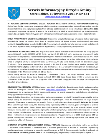 Serwis Informacyjny Urzędu Gminy Stare Babice, 10 kwietnia 2015 r. Nr 434 www.stare-babice.waw.pl 75. ROCZNICA ZBRODNI KATYŃSKIEJ ORAZ 5. ROCZNICA KATASTROFY LOTNICZEJ POD SMOLEŃSKIEM Wójt Gminy Stare Babice zaprasza na uroczystość religijno-patriotyczną upamiętniającą siedemdziesiątą piątą rocznicę Zbrodni Katyńskiej oraz piątą rocznicę katastrofy lotniczej pod Smoleńskiem, która odbędzie się 12 kwietnia 2015. Uroczystość rozpocznie się o godz. 9.30 mszą św. w Kościele p.w. NMP w Starych Babicach, po której uczestnicy przejdą do Alei Dębów Katyńskich, gdzie przy tablicach pamiątkowych zostaną zapalone znicze i złożone kwiaty. DYŻUR PRACOWNIKÓW URZĘDU SKARBOWEGO Pracownicy Urzędu Skarbowego Warszawa-Bielany zapraszają mieszkańców Gminy na kolejny- drugi dyżur w Urzędzie Gminy ul. Rynek 32 (sala konferencyjna) tym razem w dniu 15 (środa) kwietnia w godz. 10.00-15.00. Pracownicy będą udzielać porad w sprawie zeznań podatkowych za rok 2014, wydawać druki, pomagać przy ich wypełnieniu, a także przyjmować już wypełnione. ROKOWANIA NA SPRZEDAŻ POJAZDU Wójt Gminy Stare Babice zaprasza do składania ofert na zakup pojazdu marki: RENAULT model: MASTER MR`06 3,9 t, wersja 2.5 dCi 150 (145 kM), autobus do przewozu 15 osób, przystosowany do przewozu 3 osób niepełnosprawnych na wózkach inwalidzkich. Liczba miejsc: 15 lub 10+3 wózki inwalidzkie Rok produkcji 2008. Rokowania na sprzedaż pojazdu odbędą się w dniu 15 kwietnia 2015r. od godz. 10.00 w Urzędzie Gminy w Starych Babicach, ul. Rynek 32, 05-082 Stare Babice, w sali im. Stanisława Zająca (I piętro) . Cena wywoławcza samochodu wynosi – 50 430 zł brutto. Podana cena zawiera podatek VAT. Samochód można oglądać, na terenie G.P.K. EKO- BABICE Sp. z o.o., w Starych Babicach przy ul. Kutrzeby 36, po wcześniejszym uzgodnieniu telefonicznym z Kierownikiem Referatu Gospodarki Komunalnej Urzędu Gminy Stare Babice (pok. nr 1) - Marcinem Klimek, tel. 22 722-95-35. Oferty należy składać w kopercie zaklejonej z dopiskiem „Oferta na zakup autobusu marki Renault” w sekretariacie Urzędu Gminy Stare Babice ul. Rynek 32 05-082 Stare Babice (pok. nr 18) w terminie do dnia 15 kwietnia 2015 do godz. 10.00. W przypadku ofert przesłanych drogą pocztową decyduje data wpływu do Kancelarii Urzędu Gminy. KOLEJNA EDYCJA KONKURSU NIVEA Zachęcamy wszystkich mieszkańców do oddawania głosów na budowę placu zabaw w Koczargach Starych. Na stronie www.nivea.pl/podworko prowadzony jest ranking lokalizacji ubiegających się o zwycięstwo. Dzięki głosom oddawanym na stronie zapewnimy najmłodszym mieszkańcom ekscytujące i bezpieczne miejsce do zabawy. Liczy się każdy głos oddany na stronie, zatem zachęcamy rodziców, przyjaciół i wszystkich sympatyków gminy, którym zależy na stworzeniu kolejnego zakątka dla najmłodszych. Tylko 40 miejscowości w kraju otrzyma wsparcie. Głosowanie prowadzone jest w całej Polsce za pośrednictwem internetu od 3 kwietnia do 31 maja 2015. Uczestniczyć może każdy, kto dokona prostej rejestracji profilu w serwisie, gdzie wymagane są jedynie: imię, adres e-mail login i hasło. Można także jednorazowo zweryfikować się przez podanie adresu e-mail. Głosować można jeden raz w ciągu dnia. Zajmuje to zaledwie parę chwil, a podwórko będzie miejscem, w którym każdy znajdzie coś dla siebie - wyposażone w nowoczesne elementy i miejsce na klasyczne zabawy sprawi, że dzieci i rodzice będą mogli oddawać się beztroskiej zabawie. Przypominamy, że w 2011 dzięki ponad 128 tys. głosów oddanym w konkursie "100 placów zabaw na 100 lat NIVEA" udało się wybudować plac zabaw przy przedszkolu w Starych Babicach. SPOTKANIA OT!WARTE STOWARZYSZENIA KUŹNIA PRZYJAŹNI Zapraszamy miłośników roślin na spotkanie z Witoldem Czuksanowem - dziennikarzem i autorem poradników i książek o tematyce ogrodniczej, współprowadzącym emitowany w sobotnie poranki program w TVP 1 Rok w ogrodzie. Spotkanie odbędzie się w czwartek 16 kwietnia o godzinie 17.00 w sali konferencyjnej Urzędu Gminy Stare Babice przy ul. Rynek 21.