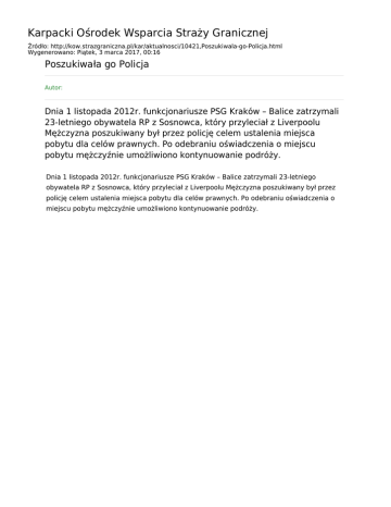 Karpacki Ośrodek Wsparcia Straży Granicznej Źródło: http://kow.strazgraniczna.pl/kar/aktualnosci/10421,Poszukiwala-go-Policja.html Wygenerowano: Piątek, 3 marca 2017, 00:16 Poszukiwała go Policja Autor: Dnia 1 listopada 2012r. funkcjonariusze PSG Kraków – Balice zatrzymali 23-letniego obywatela RP z Sosnowca, który przyleciał z Liverpoolu Mężczyzna poszukiwany był przez policję celem ustalenia miejsca pobytu dla celów prawnych. Po odebraniu oświadczenia o miejscu pobytu mężczyźnie umożliwiono kontynuowanie podróży. Dnia 1 listopada 2012r. funkcjonariusze PSG Kraków – Balice zatrzymali 23-letniego obywatela RP z Sosnowca, który przyleciał z Liverpoolu Mężczyzna poszukiwany był przez policję celem ustalenia miejsca pobytu dla celów prawnych. Po odebraniu oświadczenia o miejscu pobytu mężczyźnie umożliwiono kontynuowanie podróży.