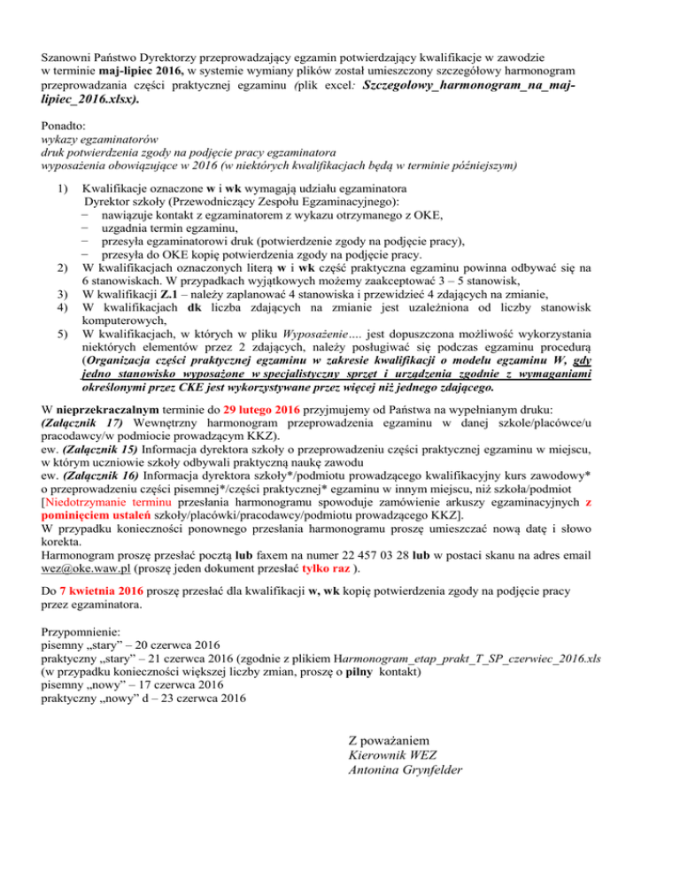 Szanowni Państwo Dyrektorzy przeprowadzający egzamin potwierdzający kwalifikacje w zawodzie w terminie maj-lipiec 2016, w systemie wymiany plików został umieszczony szczegółowy harmonogram przeprowadzania części praktycznej egzaminu (plik excel: Szczegolowy_harmonogram_na_maj- lipiec_2016.xlsx). Ponadto: wykazy egzaminatorów druk potwierdzenia zgody na podjęcie pracy egzaminatora wyposażenia obowiązujące w 2016 (w niektórych kwalifikacjach będą w terminie późniejszym) 1) 2) 3) 4) 5) Kwalifikacje oznaczone w i wk wymagają udziału egzaminatora Dyrektor szkoły (Przewodniczący Zespołu Egzaminacyjnego): − nawiązuje kontakt z egzaminatorem z wykazu otrzymanego z OKE, − uzgadnia termin egzaminu, − przesyła egzaminatorowi druk (potwierdzenie zgody na podjęcie pracy), − przesyła do OKE kopię potwierdzenia zgody na podjęcie pracy. W kwalifikacjach oznaczonych literą w i wk część praktyczna egzaminu powinna odbywać się na 6 stanowiskach. W przypadkach wyjątkowych możemy zaakceptować 3 – 5 stanowisk, W kwalifikacji Z.1 – należy zaplanować 4 stanowiska i przewidzieć 4 zdających na zmianie, W kwalifikacjach dk liczba zdających na zmianie jest uzależniona od liczby stanowisk komputerowych, W kwalifikacjach, w których w pliku Wyposażenie…. jest dopuszczona możliwość wykorzystania niektórych elementów przez 2 zdających, należy posługiwać się podczas egzaminu procedurą (Organizacja części praktycznej egzaminu w zakresie kwalifikacji o modelu egzaminu W, gdy jedno stanowisko wyposażone w specjalistyczny sprzęt i urządzenia zgodnie z wymaganiami określonymi przez CKE jest wykorzystywane przez więcej niż jednego zdającego. W nieprzekraczalnym terminie do 29 lutego 2016 przyjmujemy od Państwa na wypełnianym druku: (Załącznik 17) Wewnętrzny harmonogram przeprowadzenia egzaminu w danej szkole/placówce/u pracodawcy/w podmiocie prowadzącym KKZ). ew. (Załącznik 15) Informacja dyrektora szkoły o przeprowadzeniu części praktycznej egzaminu w miejscu, w którym uczniowie szkoły odbywali praktyczną naukę zawodu ew. (Załącznik 16) Informacja dyrektora szkoły*/podmiotu prowadzącego kwalifikacyjny kurs zawodowy* o przeprowadzeniu części pisemnej*/części praktycznej* egzaminu w innym miejscu, niż szkoła/podmiot [Niedotrzymanie terminu przesłania harmonogramu spowoduje zamówienie arkuszy egzaminacyjnych z pominięciem ustaleń szkoły/placówki/pracodawcy/podmiotu prowadzącego KKZ]. W przypadku konieczności ponownego przesłania harmonogramu proszę umieszczać nową datę i słowo korekta. Harmonogram proszę przesłać pocztą lub faxem na numer 22 457 03 28 lub w postaci skanu na adres email [email protected] (proszę jeden dokument przesłać tylko raz ). Do 7 kwietnia 2016 proszę przesłać dla kwalifikacji w, wk kopię potwierdzenia zgody na podjęcie pracy przez egzaminatora. Przypomnienie: pisemny „stary” – 20 czerwca 2016 praktyczny „stary” – 21 czerwca 2016 (zgodnie z plikiem Harmonogram_etap_prakt_T_SP_czerwiec_2016.xls (w przypadku konieczności większej liczby zmian, proszę o pilny kontakt) pisemny „nowy” – 17 czerwca 2016 praktyczny „nowy” d – 23 czerwca 2016 Z poważaniem Kierownik WEZ Antonina Grynfelder