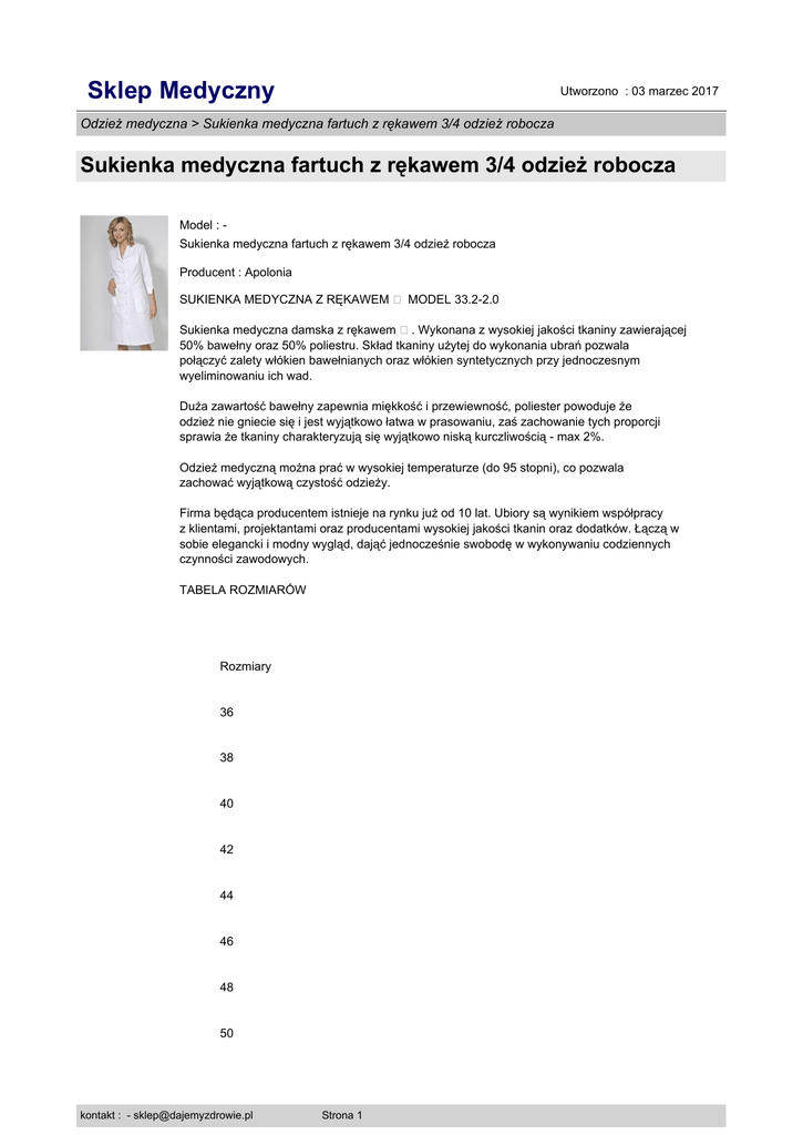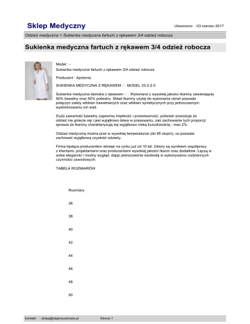 Sklep Medyczny Utworzono : 03 marzec 2017 Odzież medyczna > Sukienka medyczna fartuch z rękawem 3/4 odzież robocza Sukienka medyczna fartuch z rękawem 3/4 odzież robocza Model : Sukienka medyczna fartuch z rękawem 3/4 odzież robocza Producent : Apolonia SUKIENKA MEDYCZNA Z RĘKAWEM � MODEL 33.2-2.0 Sukienka medyczna damska z rękawem �. Wykonana z wysokiej jakości tkaniny zawierającej 50% bawełny oraz 50% poliestru. Skład tkaniny użytej do wykonania ubrań pozwala połączyć zalety włókien bawełnianych oraz włókien syntetycznych przy jednoczesnym wyeliminowaniu ich wad. Duża zawartość bawełny zapewnia miękkość i przewiewność, poliester powoduje że odzież nie gniecie się i jest wyjątkowo łatwa w prasowaniu, zaś zachowanie tych proporcji sprawia że tkaniny charakteryzują się wyjątkowo niską kurczliwością - max 2%. Odzież medyczną można prać w wysokiej temperaturze (do 95 stopni), co pozwala zachować wyjątkową czystość odzieży. Firma będąca producentem istnieje na rynku już od 10 lat. Ubiory są wynikiem współpracy z klientami, projektantami oraz producentami wysokiej jakości tkanin oraz dodatków. Łączą w sobie elegancki i modny wygląd, dająć jednocześnie swobodę w wykonywaniu codziennych czynności zawodowych. TABELA ROZMIARÓW Rozmiary 36 38 40 42 44 46 48 50 kontakt : - [email protected] Strona 1 Sklep Medyczny Utworzono : 03 marzec 2017 Odzież medyczna > Sukienka medyczna fartuch z rękawem 3/4 odzież robocza Sukienka medyczna fartuch z rękawem 3/4 odzież robocza 52 � Obwód klatki piersiowej Obwód talii Obwód bioder � 84 66 92 � 88 70 96 � 92 74 98 � 96 78 102 � kontakt : - [email protected] Strona 2 Sklep Medyczny Utworzono : 03 marzec 2017 Odzież medyczna > Sukienka medyczna fartuch z rękawem 3/4 odzież robocza Sukienka medyczna fartuch z rękawem 3/4 odzież robocza 100 82 106 � 104 86 110 � 108 90 114 � 112 94 118 � 116 98 124 Cena : 109,00 zł Brutto ( 89,34 zł Netto) kontakt : - [email protected] Strona 3 Sklep Medyczny Utworzono : 03 marzec 2017 Odzież medyczna > Sukienka medyczna fartuch z rękawem 3/4 odzież robocza Sukienka medyczna fartuch z rękawem 3/4 odzież robocza Dostępność: Produkt dostępny w naszym sklepie od 21 październik 2010 kontakt : - [email protected] Strona 4