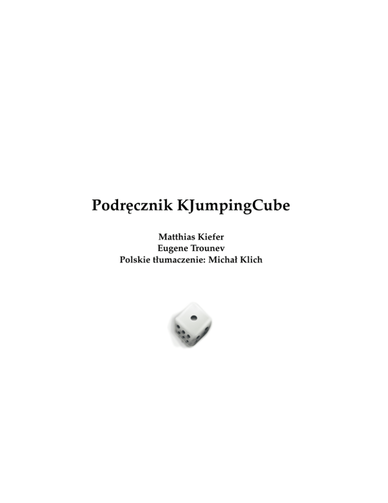 Podr˛ecznik KJumpingCube Matthias Kiefer Eugene Trounev Polskie tłumaczenie: Michał Klich Podr˛ecznik KJumpingCube 2 Spis treści 1 Wprowadzenie 5 2 Jak grać 6 3 Zasady gry, strategia i porady: 7 3.1 Reguły . . . . . . . . . . . . . . . . . . . . . . . . . . . . . . . . . . . . . . . . . . . . 7 3.2 Strategia oraz podpowiedzi. . . . . . . . . . . . . . . . . . . . . . . . . . . . . . . . . 7 4 Ogólne informacje o interfejsie 4.1 4.2 4.3 4.4 4.5 Menu Gra . . . . . . . . . . . . Menu Ruch . . . . . . . . . . . Menu Ustawienia . . . . . . . . Menu Pomoc . . . . . . . . . . . Pasek narz˛edzi KJumpingCube 9 . . . . . . . . . . . . . . . . . . . . . . . . . . . . . . . . . . . . . . . . . . . . . . . . . . . . . . . . . . . . . . . . . . . . . . . . . . . . . . . . . . . . . . . . . . . . . . . . . . . . . . . . . . . . . . . . . . . . . . . . . . . . . . . . . . . . . . . . . . . . . . . . . . . . . . 9 9 10 10 10 5 Najcz˛eściej zadawane pytania 12 6 Konfiguracja gry 13 7 Zasługi i licencja 14 A Instalacja A.1 Kompilacja i instalacja . . . . . . . . . . . . . . . . . . . . . . . . . . . . . . . . . . . 15 15 Streszczenie Ta dokumentacja dotyczy gry KJumpingCube w wersji 1.2 Podr˛ecznik KJumpingCube Rozdział 1 Wprowadzenie R ODZAJ GRY: Strategia, gra w kości. L ICZBA GRACZY: Dwoje KJumpingCube jest prosta,˛ taktyczna˛ gra.˛ Możesz w nia˛ grać z druga˛ osoba˛ lub z komputerem. Plansza do gry składa si˛e z pól zawierajacych ˛ punkty. Klikajac ˛ w pole zwi˛eksza si˛e liczba punktów, jeśli punkty osiagn ˛ a˛ punkt maksymalny przeskakuja˛ na sasiednie ˛ pola i je przejmuja.˛ Zwyci˛ezca˛ zostaje ten, kto zdob˛edzie wszystkie pola. 5 Podr˛ecznik KJumpingCube Rozdział 2 Jak grać C EL GRY: Zajmij wszystkie pola na planszy. KJumpingCube uruchamia si˛e w trybie grania, możesz rozpoczać ˛ gr˛e tuż po uruchomieniu. Ruch polega na klikaniu w wolne pola lub te należace ˛ do ciebie. Jeśli klikniesz na wolne pole przejmujesz nad nim kontrol˛e i jego kolor zmienia si˛e na twój kolor.Za każdym razem gdy klikniesz pole ilość punktów w polu zmienia si˛e o jeden. Jeśli osiaga ˛ maksimum, punkty sa˛ przekazywane na najbliższych sasiadów ˛ (punkty «przeskakuja»). ˛ Jeśli właścicielem sasiedniego ˛ pola jest przeciwnik, pole zostaje przej˛ete wraz ze wszystkimi punktami oraz zmienia ono swój kolor. P RZYKŁAD : Jeśli środkowe pole osiagnie ˛ pieć ˛ punktów, cztery punkty zostana˛ podzielone pomiedzy ˛ sasiaduj ˛ ace ˛ z nim pola pozostawiajac ˛ na polu jeden punkt. W wypadku jeśli sasiaduj ˛ ace ˛ pola osiagn ˛ a˛ poziom pieciu ˛ punktów uzyskamy efekt fali. N OTATKA : Duże obszary pola gry moge˛ bardzo szybko zmieniać właściciela. Zwyci˛eża osoba kontrolujaca ˛ wszystkie pola na planszy. 6 Podr˛ecznik KJumpingCube Rozdział 3 Zasady gry, strategia i porady: 3.1 Reguły 1. Ruch polega na klikni˛eciu w pole nie należace ˛ do twojego przeciwnika. 2. Klikni˛ecie zwi˛eksza o jeden ilość punktów na polu. 3. Na poczatku ˛ gry każde pole posiada jeden punkt oraz jest koloru neutralnego 4. Każdy z graczy ma przypisany własny kolor którym oznacza swoje pola. 5. Klikni˛ecie pola nie posiadajacego ˛ właściciela, przejmuje to pole i zmienia kolor na kolor posiadacza. Jednocześnie liczba punktów zwi˛eksza si˛e o jeden. 6. Jeśli pole ma wi˛ecej punktów niż jego sasiedzi, ˛ punkty przeskakuja˛ na sasiednie ˛ pola i zajmuja˛ je. 7. Podczas takiego ruchu wszystkie sasiaduj ˛ ace ˛ pola oraz ich punkty zostaja˛ przydzielone do puli gracza który wykonał ruch, nawet jeśli były koloru neutralnego badź ˛ przeciwnika. 8. Pola sasiaduj ˛ ace ˛ to pola poniżej, powyżej, na lewo lub na prawo, do nich nie zalicza si˛e pól położonych po przekatnej. ˛ Pola narożne posiadaja˛ tylko dwa pola sasiaduj ˛ ace, ˛ pola boczne posiadaja˛ trzy, a pola centralne cztery. 9. Jeśli podczas ruchu pole sasiaduj ˛ ace ˛ zmienia ilość punktów na maksymalna˛ ruch przenosi si˛e na to pole a potem na nast˛epne i tak dalej, tworzy si˛e fala. Duże ilości pól moga˛ zmienić swoja˛ przynależność podczas takego ruchu. 10. Zwyci˛ezca˛ jest osoba kontrolujaca ˛ wszystkie pola. 11. Może użyć Ustawienia → Konfiguracja KJumpingCube... aby wybrać kolor pól, komputerowego gracza, poziom gry i rozmiar planszy. 3.2 Strategia oraz podpowiedzi. • Staraj si˛e unikać zwi˛ekszania punktów na polu, kiedy twój przeciwnik posiada sasiaduj ˛ ace ˛ pole które osiagnie ˛ maksimum wcześniej niż twoje. • Spróbuj najpierw przejać ˛ pola narożne, potem boczne. Potrzeba mniej ruchów aby osiagn˛ ˛ eły maksimum. • Staraj si˛e nie grać zbyt blisko swojego przeciwnika, zwłaszcza na poczatku ˛ rozgrywki. Cofnij si˛e o pole lub dwa albo wybieraj pola po przekatnej ˛ od pól przeciwnika. 7 Podr˛ecznik KJumpingCube • Pilnuj długich łańcuchów pól które maja˛ prawie maksymalna˛ ilość punktów. Jeśli sa˛ twoje strzeż je przed reakcja˛ łańcuchowa.˛ Jeśli sa˛ przeciwnika moga˛ być przej˛ete przez ruch rozpoczynajacy ˛ reakcj˛e łańcuchowa˛ gdy b˛eda˛ wystarczajaco ˛ blisko twoich pól. 8 Podr˛ecznik KJumpingCube Rozdział 4 Ogólne informacje o interfejsie 4.1 Menu Gra Gra → Nowa (Ctrl+N) Rozpoczyna nowa˛ gr˛e. Gra → Otwórz... (Ctrl+O) Otwiera poprzednio zapisana˛ gr˛e. Gra → Zapisz (Ctrl+S) Zapisuje bieżac ˛ a˛ gr˛e. Gra → Zapisz jako... Zapisuje bieżac ˛ a˛ gr˛e pod inna˛ nazwa.˛ Gra → Zatrzymaj (Esc) Zatrzymuje planowanie kolejnego ruchu przez komputerowego przeciwnika. Komputer wykona najlepszy z możliwych ruchów jaki odnalazł do rozkazu zaprzestania planowania. Gra → Zakończ (Ctrl+Q) Kończy gr˛e w KJumpingCube. 4.2 Menu Ruch Ruch → Cofnij (Ctrl+Z) Cofnij ostatni wykonany ruch Tylko jeden ostatni ruch, może być cofni˛ety w tej grze. Ruch → Podpowiedź (H) Pokaż podpowiedź jaki jest najlepszy nast˛epny ruch. 9 Podr˛ecznik