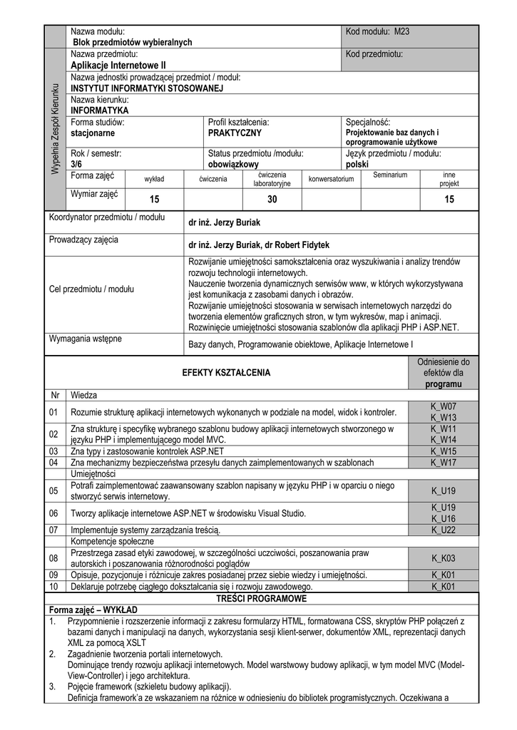 Nazwa modułu: Blok przedmiotów wybieralnych Nazwa przedmiotu: Kod modułu: M23 Kod przedmiotu: Wypełnia Zespół Kierunku Aplikacje Internetowe II Nazwa jednostki prowadzącej przedmiot / moduł: INSTYTUT INFORMATYKI STOSOWANEJ Nazwa kierunku: INFORMATYKA Forma studiów: Profil kształcenia: stacjonarne PRAKTYCZNY Rok / semestr: 3/6 Forma zajęć Wymiar zajęć Cel przedmiotu / modułu Wymagania wstępne Projektowanie baz danych i oprogramowanie użytkowe Status przedmiotu /modułu: obowiązkowy wykład ćwiczenia ćwiczenia laboratoryjne 15 Koordynator przedmiotu / modułu Prowadzący zajęcia Specjalność: Język przedmiotu / modułu: polski konwersatorium Seminarium 30 dr inż. Jerzy Buriak, dr Robert Fidytek Rozwijanie umiejętności samokształcenia oraz wyszukiwania i analizy trendów rozwoju technologii internetowych. Nauczenie tworzenia dynamicznych serwisów www, w których wykorzystywana jest komunikacja z zasobami danych i obrazów. Rozwijanie umiejętności stosowania w serwisach internetowych narzędzi do tworzenia elementów graficznych stron, w tym wykresów, map i animacji. Rozwinięcie umiejętności stosowania szablonów dla aplikacji PHP i ASP.NET. Bazy danych, Programowanie obiektowe, Aplikacje Internetowe I Nr Wiedza 01 Rozumie strukturę aplikacji internetowych wykonanych w podziale na model, widok i kontroler. 03 04 05 06 07 15 dr inż. Jerzy Buriak EFEKTY KSZTAŁCENIA 02 inne projekt Zna strukturę i specyfikę wybranego szablonu budowy aplikacji internetowych stworzonego w języku PHP i implementującego model MVC. Zna typy i zastosowanie kontrolek ASP.NET Zna mechanizmy bezpieczeństwa przesyłu danych zaimplementowanych w szablonach Umiejętności Potrafi zaimplementować zaawansowany szablon napisany w języku PHP i w oparciu o niego stworzyć serwis internetowy. Tworzy aplikacje internetowe ASP.NET w środowisku Visual Studio. Odniesienie do efektów dla programu K_W07 K_W13 K_W11 K_W14 K_W15 K_W17 K_U19 K_U19 K_U16 K_U22 Implementuje systemy zarządzania treścią. Kompetencje społeczne Przestrzega zasad etyki zawodowej, w szczególności uczciwości, poszanowania praw 08 K_K03 autorskich i poszanowania różnorodności poglądów 09 Opisuje, pozycjonuje i różnicuje zakres posiadanej przez siebie wiedzy i umiejętności. K_K01 10 Deklaruje potrzebę ciągłego dokształcania się i rozwoju zawodowego. K_K01 TREŚCI PROGRAMOWE Forma zajęć – WYKŁAD 1. Przypomnienie i rozszerzenie informacji z zakresu formularzy HTML, formatowana CSS, skryptów PHP połączeń z bazami danych i manipulacji na danych, wykorzystania sesji klient-serwer, dokumentów XML, reprezentacji danych XML za pomocą XSLT 2. Zagadnienie tworzenia portali internetowych. Dominujące trendy rozwoju aplikacji internetowych. Model warstwowy budowy aplikacji, w tym model MVC (ModelView-Controller) i jego architektura. 3. Pojęcie framework (szkieletu budowy aplikacji). Definicja framework’a ze wskazaniem na różnice w odniesieniu do bibliotek programistycznych. Oczekiwana a oferowana funkcjonalność. Rozszerzalność oferowanej funkcjonalności (rozbudowa framework’a). Zastosowania. Przegląd dostępnych framework’ów w technologii PHP. Prezentacja wytypowanego frameworka z wyróżnieniem architektury MVC. Przykład instalacji, konfiguracji, użycia. 5. Wprowadzenie do CMS (Content Management System- system zarządzania treścią) Framework a CMS. Główne funkcje CMS i sposoby ich implementacji. Typy systemów CMS i ich przykłady. Przegląd istniejących rozwiązań systemów zarządzania treścią CMS oraz ich ocena pod kątem wybranych kryteriów budowy portali o określonej oglądalności.. 6. Budowa serwisu WWW z użyciem ASP.NET 7. Implementacja strony głównej serwisu i rodzaje menu aplikacji. 8. Kontrolki użytkownika, walidacja danych wejściowych formularzy ASP.NET. 9. Typy połączeń ze źródłami danych. Zarządzanie połączeniami danymi. 10. ASP.NET Ajax i Windows Communication Foundation Services 11. Zarządzanie użytkownikami, uprawnieniami I inne aspekty bezpieczeństwa serwisu ASP.NET 12. Serwis ASP.NET zgodny z szablonem MVC 4. Forma zajęć – LABORATORIUM Podczas pierwszych zajęć laboratorium studenci poprzez ćwiczenia praktyczne przypominają i rozszerzają swoje umiejętności nabyte w zakresie przedmiotu Aplikacje Internetowe I tj.: budują formularze HTML z formatowaniem CSS, skrypty PHP połączeń z bazami danych i manipulacji na danych, używają funkcji PHP zarządzania sesjami klient-serwer, eksportuja dane do pliku XML i je prezentują za pomocą XSLT. W dalszej części laboratorium studentom udostępniony zostaje zestaw kursów e-learningu w ramach Microsoft IT Academy E-Learning: https://itacademy.microsoftelearning.com/default.aspx Poszczególne etapy kursu realizowane są metodą blended-learning podczas ćwiczeń laboratoryjnych z wykorzystaniem sprzętu i oprogramowania laboratorium komputerowego oraz zdalnego serwera Microsoft. Metodą blended-learning realizowany jest kurs: Collection 10267: Introduction to Web Development with Microsoft® Visual Studio® 2010 składający się z części: Course 70009: Introduction to Microsoft® ASP.NET Web Applications Course 70010: Creating and Adding Functionality to a Microsoft® ASP.NET Web Form Course 70011: Implementing Master Pages and User Controls, Validating User Input Course 70012: Troubleshooting and Managing Data in an ASP.NET 4.0 Web Application Course 70013: Managing Data Access Tasks and Data Course 70014: ASP.NET Ajax and Windows Communication Foundation Services Course 70015: Managing State, Configuring and Deploying an ASP.NET Web Application Course 70016: Security and Advanced Technologies Kursy umożliwiają podgląd na bieżąco postępów w realizacji wskazanych na początku ćwiczeń etapów, gdyż platforma Microsoft IT Academy E-Learning umożliwia sporządzanie dla określonych terminów, grup i pojedynczych studentów raportów aktywności i postępów. Na tej podst