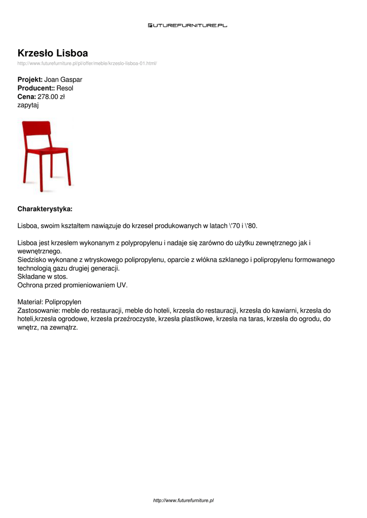 Krzesło Lisboa http://www.futurefurniture.pl/pl/offer/meble/krzeslo-lisboa-01.html/ Projekt: Joan Gaspar Producent:: Resol Cena: 278.00 zł zapytaj Charakterystyka: Lisboa, swoim kształtem nawiązuje do krzeseł produkowanych w latach \'70 i \'80. Lisboa jest krzesłem wykonanym z polypropylenu i nadaje się zarówno do użytku zewnętrznego jak i wewnętrznego. Siedzisko wykonane z wtryskowego polipropylenu, oparcie z włókna szklanego i polipropylenu formowanego technologią gazu drugiej generacji. Składane w stos. Ochrona przed promieniowaniem UV. Materiał: Polipropylen Zastosowanie: meble do restauracji, meble do hoteli, krzesła do restauracji, krzesła do kawiarni, krzesła do hoteli,krzesła ogrodowe, krzesła przeźroczyste, krzesła plastikowe, krzesła na taras, krzesła do ogrodu, do wnętrz, na zewnątrz. http://www.futurefurniture.pl Dostępne wersje produktu: nazwa produktu Krzesło Lisboa warianty kolor biały cena 278.00zł dostępne Zapytaj Krzesło Lisboa kolor czarny 278.00zł Zapytaj Krzesło Lisboa kolor zielony 278.00zł Zapytaj Krzesło Lisboa kolor ecru 278.00zł Zapytaj Krzesło Lisboa Krzesło Lisboa kolor brąz kolor czerwony 278.00zł 278.00zł Zapytaj Zapytaj http://www.futurefurniture.pl Zdjęcia produktu: http://www.futurefurniture.pl Powered by TCPDF (www.tcpdf.org)