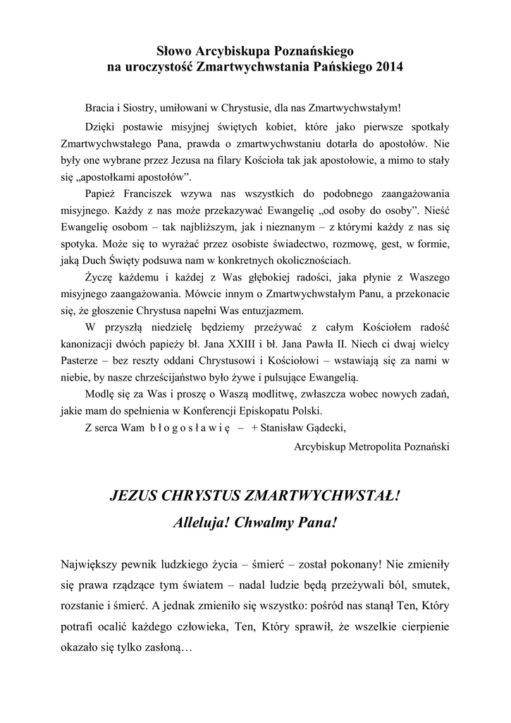 Słowo Arcybiskupa Poznańskiego na uroczystość Zmartwychwstania Pańskiego 2014 Bracia i Siostry, umiłowani w Chrystusie, dla nas Zmartwychwstałym! Dzięki postawie misyjnej świętych kobiet, które jako pierwsze spotkały Zmartwychwstałego Pana, prawda o zmartwychwstaniu dotarła do apostołów. Nie były one wybrane przez Jezusa na filary Kościoła tak jak apostołowie, a mimo to stały się „apostołkami apostołów”. Papież Franciszek wzywa nas wszystkich do podobnego zaangażowania misyjnego. Każdy z nas może przekazywać Ewangelię „od osoby do osoby”. Nieść Ewangelię osobom – tak najbliższym, jak i nieznanym – z którymi każdy z nas się spotyka. Może się to wyrażać przez osobiste świadectwo, rozmowę, gest, w formie, jaką Duch Święty podsuwa nam w konkretnych okolicznościach. Życzę każdemu i każdej z Was głębokiej radości, jaka płynie z Waszego misyjnego zaangażowania. Mówcie innym o Zmartwychwstałym Panu, a przekonacie się, że głoszenie Chrystusa napełni Was entuzjazmem. W przyszłą niedzielę będziemy przeżywać z całym Kościołem radość kanonizacji dwóch papieży bł. Jana XXIII i bł. Jana Pawła II. Niech ci dwaj wielcy Pasterze – bez reszty oddani Chrystusowi i Kościołowi – wstawiają się za nami w niebie, by nasze chrześcijaństwo było żywe i pulsujące Ewangelią. Modlę się za Was i proszę o Waszą modlitwę, zwłaszcza wobec nowych zadań, jakie mam do spełnienia w Konferencji Episkopatu Polski. Z serca Wam b ł o g o s ł a w i ę – + Stanisław Gądecki, Arcybiskup Metropolita Poznański JEZUS CHRYSTUS ZMARTWYCHWSTAŁ! Alleluja! Chwalmy Pana! Największy pewnik ludzkiego życia – śmierć – został pokonany! Nie zmieniły się prawa rządzące tym światem – nadal ludzie będą przeżywali ból, smutek, rozstanie i śmierć. A jednak zmieniło się wszystko: pośród nas stanął Ten, Który potrafi ocalić każdego człowieka, Ten, Który sprawił, że wszelkie cierpienie okazało się tylko zasłoną… Czcigodni Goście, Drodzy Mieszkańcy naszej parafii, niech Jezus Chrystus da nam wszystkim łaskę wiary, jeszcze mocniejszej wiary – tak, aby nikomu z nas nie zabrakło nadziei na każdy kolejny poranek, na nowe wyzwanie, na kolejne dobro w naszym życiu; by nie zabrakło nam siły, aby kochać – aby pragnąć miłości na miarę samego Boga. O to się modlimy i o podobna modlitwę prosimy – ks.Szymon, ks.Piotr, ks.Ryszard *** Zachwycamy się wydarzeniem sprzed blisko 2000 lat – Jezus Chrystus, Syn Maryi z Nazaretu, narodzony w Betlejem, dokonujący niezwykłych znaków po całej Judei, Galilei i Samarii, pokazujący oblicze „kochającego do końca” Boga, został stracony na krzyżu a trzeciego dnia zmartwychwstał. Gdy odchodzi od nas ktoś nam bardzo bliski, ktoś, kto o nas się troszczył, kto dbał o wszystko, co najpotrzebniejsze do codziennego życia, świat się nam wali. W takiej chwili nie jest dla nas żadnym pocieszeniem, że przecież „każdy kiedyś musi umrzeć” – śmierć kogoś bardzo bliskiego wydaje się czasem straszniejsza od naszej własnej śmierci. Jezus pokonał śmierć! Pokazał nam nową drogę „ze śmierci – do życia”, natchnął nas nadzieją na pokonanie wszystkich naszych „strat”, na przezwyciężenie wszelkiego lęku przed śmiercią – skoro jest zmartwychwstanie! Jednak najważniejsze jest dla nas, że sam Jezus Chrystus żyje, że jest obecny w naszym życiu – Ten, Który tak mnie pokochał, że oddał za mnie swoje życie! „Jeżeli Bóg z nami, któż przeciwko nam!” Jezus żyje – nie jestem już bezbronny, jestem bezpieczny, nigdy nie przegram – jest Ktoś, Kto w swojej mądrości, sile i dobroci zawsze stoi przy mnie! - ks.Szymon Likowski Znalezione w internecie – Ojciec Święty Franciszek: Czym jest cierpienie i Zmartwychwstanie? „Często bierzmy w tym tygodniu do ręki krzyż i całujmy go wielokrotnie, mówiąc: dziękuję Ci Panie Jezu, że uczyniłeś to dla mnie” – mówił dziś Ojciec Święty. Wyjaśnił też, czym jest Zmartwychwstanie. Papież rozpoczął dzisiejszą katechezę od słów Ewangelii, w której słyszymy o zdradzie Judasza. „Ile mi dacie, jeśli Go wam wydam? Od tej chwili Jezus ma cenę – mówił Ojciec Święty. "To tragiczne wydarzenie znaczy początek męki Chrystusa, drogę boleści, którą wybrał On sam w pełnej wolności. On sam mówi to jasno: 'Ja daję moje życie. Nikt mi go nie zabiera'. Od tej zdrady rozpoczyna się ta droga upokorzenia, ogołocenia. Jezus, jakby był na rynku, kosztuje 30 srebrników. I przebywa tę drogę upokorzenia i ogołocenia aż do końca. Zupełnego upokorzenia zaznaje w śmierci na krzyżu. Była to śmierć najgorsza, przeznaczona dla niewolników i przestępców. Jezus był uważany za proroka, a umierał jak przestępca” – powiedział Papież. Ojciec Święty przyznał też, że człowieka często przeraża zło i cierpienie, jakie spotyka w świecie. „Czujemy się głęboko zranieni, ilekroć widzimy cierpienie i śmierć, zwłaszcza niewinnych! Boli nas serce, kiedy widzimy, jak cierpią dzieci. Jest to tajemnica zła. A Jezus bierze na siebie wszystko to zło, wszystkie te boleści. W tym tygodniu warto patrzeć na Ukrzyżowanego, całować rany Jezusa, całować Ukrzyżowanego. On wziął na siebie wszelkie ludzkie cierpienia, obarczył się nimi. My czekamy, że Bóg w swej wszechmocy pokona niesprawiedliwość, zło, grzech i cierpienia w tryumfalnym, boskim zwycięstwie. Bóg pokazuje nam tymczasem zwycięstwo pokorne, które po ludzku wydaje się klęską. Jezus pozwala, by zło się nań zawzięło, i bierze je na siebie, by je pokonać. Jego męka nie jest wypadkiem, Jego śmierć była Mu pisana” – mówił Ojciec Święty. Papież powiedział, że Zmartwychwstanie jest „potężną interwencją Boga” pośród największych ciemności. „Zmartwychwstanie Jezusa nie jest dobrym zakończeniem pięknej bajk