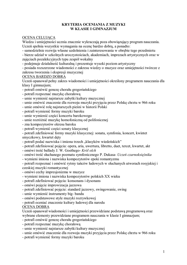 1 KRYTERIA OCENIANIA Z MUZYKI W KLASIE I GIMNAZJUM