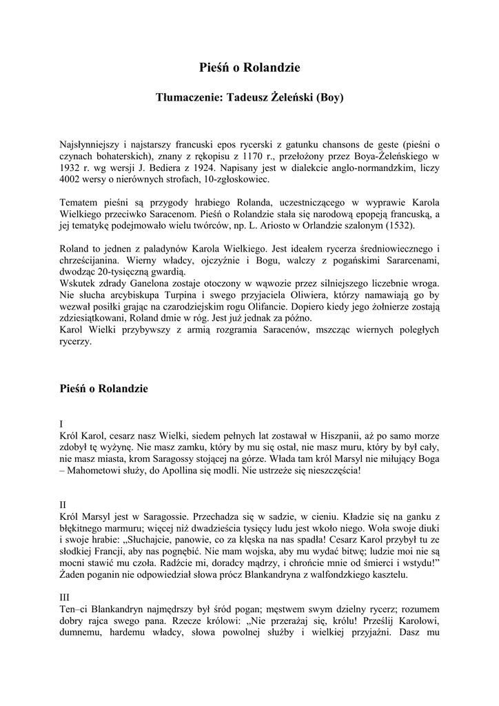 Pieśń o Rolandzie Tłumaczenie: Tadeusz Żeleński (Boy) Najsłynniejszy i najstarszy francuski epos rycerski z gatunku chansons de geste (pieśni o czynach bohaterskich), znany z rękopisu z 1170 r., przełożony przez Boya-Żeleńskiego w 1932 r. wg wersji J. Bediera z 1924. Napisany jest w dialekcie anglo-normandzkim, liczy 4002 wersy o nierównych strofach, 10-zgłoskowiec. Tematem pieśni są przygody hrabiego Rolanda, uczestniczącego w wyprawie Karola Wielkiego przeciwko Saracenom. Pieśń o Rolandzie stała się narodową epopeją francuską, a jej tematykę podejmowało wielu twórców, np. L. Ariosto w Orlandzie szalonym (1532). Roland to jednen z paladynów Karola Wielkiego. Jest ideałem rycerza średniowiecznego i chrześcijanina. Wierny władcy, ojczyźnie i Bogu, walczy z pogańskimi Sararcenami, dwodząc 20-tysięczną gwardią. Wskutek zdrady Ganelona zostaje otoczony w wąwozie przez silniejszego liczebnie wroga. Nie słucha arcybiskupa Turpina i swego przyjaciela Oliwiera, którzy namawiają go by wezwał posiłki grając na czarodziejskim rogu Olifancie. Dopiero kiedy jego żołnierze zostają zdziesiątkowani, Roland dmie w róg. Jest już jednak za późno. Karol Wielki przybywszy z armią rozgramia Saracenów, mszcząc wiernych poległych rycerzy. Pieśń o Rolandzie I Król Karol, cesarz nasz Wielki, siedem pełnych lat zostawał w Hiszpanii, aż po samo morze zdobył tę wyżynę. Nie masz zamku, który by mu się ostał, nie masz muru, który by był cały, nie masz miasta, krom Saragossy stojącej na górze. Włada tam król Marsyl nie miłujący Boga – Mahometowi służy, do Apollina się modli. Nie ustrzeże się nieszczęścia! II Król Marsyl jest w Saragossie. Przechadza się w sadzie, w cieniu. Kładzie się na ganku z błękitnego marmuru; więcej niż dwadzieścia tysięcy ludu jest wkoło niego. Woła swoje diuki i swoje hrabie: „Słuchajcie, panowie, co za klęska na nas spadła! Cesarz Karol przybył tu ze słodkiej Francji, aby nas pognębić. Nie mam wojska, aby mu wydać bitwę; ludzie moi nie są mocni stawić mu czoła. Radźcie mi, doradcy mądrzy, i chrońcie mnie od śmierci i wstydu!” Żaden poganin nie odpowiedział słowa prócz Blankandryna z walfondzkiego kasztelu. III Ten–ci Blankandryn najmędrszy był śród pogan; męstwem swym dzielny rycerz; rozumem dobry rajca swego pana. Rzecze królowi: „Nie przerażaj się, królu! Prześlij Karolowi, dumnemu, hardemu władcy, słowa powolnej służby i wielkiej przyjaźni. Dasz mu niedźwiedzie i lwy, i psy; i siedemset wielbłądów, i tysiąc wypierzonych sokołów; czterysta mułów ładownych złotem i srebrem i pięćdziesiąt wozów, z których on złoży tabor; i daj mu szczerego złota tyle, aby mógł hojnie opłacić swoich najemników. Przekaż mu, że dość długo wojował już w tej ziemi; że powinien by wracać do Francji, do Akwizgranu, że pośpieszysz tam za nim na święty Michał, że przyjmiesz tam prawo chrześcijan i zostaniesz jego wiernym lennikiem. A zechce zakładników, to poślij mu ich, dziesięciu albo dwudziestu, aby go natchnąć ufnością. Poślijmy mu synów naszych żon; ja poślę mego, choćby miał i zginąć. Lepiej, by tam potracili swoje głowy, a my żebyśmy nie stracili naszej swobody i państwa i nie przyszli do torby żebraczej!” IV Blankandryn mówił: „Na tę moją prawicę i na tę brodę, którą wiatr kołysze mi na piersi, wnet ujrzycie, jak francuskie woje stąd odchodzą. Pójdą Frantowie do Francji – to ich ziemia. Kiedy wrócą, każdy do swej najdroższej dziedziny, a Karol do Akwizgranu, do swojej stolicy, będzie tam odbywał na święty Michał uroczyste rok. Przyjdzie święto, dzień upłynie, o nas ani słychu. Dumny jest ów król, a serce ma okrutne: każe uciąć głowy zakładnikom. Lepiej–ci jest, aby oni stradali głowy, a my abyśmy nie stracili naszej pięknej Hiszpanii i nie cierpieli niedoli i klęski!” Poganie rzekli: „Może i prawdę gada!” V Król Marsyl zwołał radę. Zwołał Klaryna Balagierskiego, Estamaryna i jego para Eudropa, i Pryjamona, i Garlana brodacza, i Masznera, i stryja jego Mahona, i Żynera, i Malbiena zza morza, i Blankandryna, iżby im powiedział swoją myśl. Dziesięciu najchytrzejszych odwołał na stronę. „Pójdziecie, barony, do Karola Wielkiego. Jest pod Kordową, którą oblega. Będziecie mieli w rękach gałązki oliwne, co oznacza pokój i pokorę. Jeśli chytrością swoją wyjednacie dla mnie zgodę, dam wam złota i srebra co wlezie, i ziem, i lenna, ile sami zechcecie!” A poganie na to: „Oto mamy zadość!” V Król Marsyl zwołał radę. Zwołał Klaryna Balagierskiego, Estamaryna i jego para Eudropa, i Pryjamona, i Garlana brodacza, i Masznera, i stryja jego Mahona, i Żynera, i Malbiena zza morza, i Blankandryna, iżby im powiedział swoją myśl. Dziesięciu najchytrzejszych odwołał na stronę. „Pójdziecie, barony, do Karola Wielkiego. Jest pod Kordową, którą blega. Będziecie mieli w rękach gałązki oliwne, co oznacza pokój i pokorę. eśli chytrością swoją wyjednacie dla mnie zgodę, dam wam złota i srebra co wlezie, i ziem, i lenna, ile sami zechcecie!” A poganie na to: „Oto mamy zadość!” VI Król Marsyl zamknął radę. Powiada swoim ludziom; „Pójdziecie, panowie! Będziecie nieśli w rękach gałązki oliwne i powiecie królowi Karolowi Wielkiemu, aby przez Boga swego zlitował się nade mną: że nie upłynie ani miesiąc, jak doń pośpieszę z tysiącem moich lenników; i przyjmę zakon chrześcijański, i zostanę jego wasalem z całą miłością i wiarą. Jeśli chce zakładników, wierę, dostanie ich.” Blankandryn rzekł: „W ten sposób uzyskasz dobrą zgodę.” VII Marsyl kazał przywieść dziesięć białych mulic, które mu był przysłał król Sycylii. Wędzidła na nich złote, siodła wykładane srebrem. Posły wsiadają na nie, trzymają w rękach gałązki oliwne. Spieszą do Karola, któr