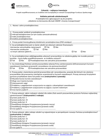 Człowiek – najlepsza inwestycja Projekt współfinansowany ze środków Unii Europejskiej w ramach Europejskiego Funduszu Społecznego Ankieta potrzeb szkoleniowych Przedsiębiorstw zgłaszających się do projektu „Szkolenia na kierowców dla kadr MMŚP z branży transportowej“ 1. Nazwa i adres przedsiębiorstwa: 2. Proszę podać wielkość przedsiębiorstwa mikroprzedsiębiorstwo (w tym osoba samozatrudniona) małe przedsiębiorstwo średnie przedsiębiorstwo 2. Proszę podać branżę głównej działalności przedsiębiorstwa (PKD wiodące) ......................................... 3. Czy przedsiębiorstwo jest w stanie szkolić we własnym zakresie finansowym: -kierowców samochodów ciężarowych Tak Nie -kierowców autobusów Tak Nie -w innym zakresie (jakim?)........................................................................... Tak Nie 4. Czy przedsiębiorstwo oddelegowałoby własnych pracowników na szkolenia gdyby nie musiało ponosić kosztów – kursy byłby współfinansowane ze środków unijnych? Tak Nie Przedsiębiorstwo nie zatrudnia pracowników 5. Czy stwierdzają Państwo wśród pracowników własnej firmy zaintersowanie dofinansowanymi kursami zawodowymi (zarówno pracownik i pracodawca nie ponoszą kosztów)? Tak Nie Przedsiębiorstwo nie zatrudnia pracowników 6. Proszę podać, stwierdzone pośród pracowników jak i pracodawców, powody dla których nie szkolono pracowników lub pracownicy niechętnie uczestniczyli w kursach zawodowych. Proszę zaznaczyć krzyżykiem poniższe przykładowe dane lub podać inne (maksymalnie 2 powody): Wysokie koszty kursów zawodowych Długi czas trwania kursów Intensywność zajęć Problemy z pogodzeniem uczęszczania na zajęcia z obowiązkami zawodowymi Problemy z pogodzeniem uczęszczania na zajęcia z życiem rodzinnym Inne bariery (jakie?) ………………………………………………………………………. 7. Proszę wskazać, jakim rodzajem szkoleń dla siebie i/lub swoich pracowników jesteście Państwo najbardziej zainteresowani? (maksymalnie 2 rodzaje): prawo jazdy kat. C prawo jazdy kat. CE prawo jazdy kat. D Kwalifikacja Wstępna Przyspieszona (przewóz rzeczy) Kwalifikacja Wstępna Przyspieszona (przewóz osób) inne (jakie?) ………………………………………………………………. 8. Proszę wskazać, jakie rodzaje szkoleń są najważniejsze w perspektywie rozwoju Państwa przedsiębiorstwa? (maksymalnie 2 rodzaje): prawo jazdy kat. C prawo jazdy kat. CE prawo jazdy kat. D Kwalifikacja Wstępna Przyspieszona (przewóz rzeczy) Kwalifikacja Wstępna Przyspieszona (przewóz osób) inne (jakie?) ………………………………………………………………. AUTO SZKOŁA WOTA SP. J. ul. Nowy Józefów 6, 90-406 Łódź NIP: 7271045136 REGON: 470379202 tel.: 514 117 515, e-mail: [email protected] www.kielce.wota.com.pl Człowiek – najlepsza inwestycja Projekt współfinansowany ze środków Unii Europejskiej w ramach Europejskiego Funduszu Społecznego 9. Proszę wskazać, jakie oczekiwania wiąże Państwo przedsiębiorstwo z uczestnictwem w projekcie? (maksymalnie 2 rodzaje): pracownicy zdobędą nowe kompetencje przydatne z perspektywy przedsiębiorstwa przedsiębiorstwo, dzięki nowo wyszkolonym pracownikom, uzyska lepszą pozycję na rynku transportowym będzie to szansa na rozwój przedsiębiorstwa jest to inwestycja w potencjał firmy inne (jakie?) ………………………………………………………………. inne (jakie?) ………………………………………………………………. 10. Mając na uwadze możliwości organizacyjno-techniczne przedsiębiorstwa oraz czas pracy w przedsiębiorstwie, proszę określić jaki tryb szkoleń byłby dla Państwa najkorzystniejszy: całodniowo w dni robocze wieczorowo w dni robocze weekendowo w trakcie godzin pracy poza godzinami pracy brak preferencji odnośnie trybu szkoleń inne (jakie?) ………………………………………………………………. inne (jakie?) ………………………………………………………………. 11. Proszę wpisać to, co uważacie Państwo za istotne w kontekście Państwa potrzeb szkoleniowych, a co nie znalazło się w powyższej ankiecie ………………………………………………………………………………………………………………..………………………………………………………… ………………………………………………..………………………………………………………………………………………………………………………… ………………………………………………………………………………………………………………………………………………………………………….. !! Wypełnienie ankiety jest konieczne do zakwalifikowania przedsiębiorstwa do projektu !! AUTO SZKOŁA WOTA SP. J. ul. Nowy Józefów 6, 90-406 Łódź NIP: 7271045136 REGON: 470379202 tel.: 514 117 515, e-mail: [email protected] www.kielce.wota.com.pl