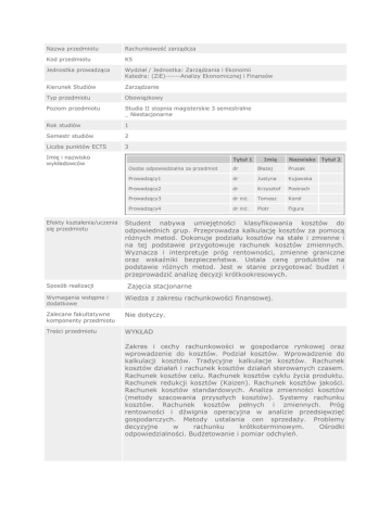 Nazwa przedmiotu Rachunkowość zarządcza Kod przedmiotu K5 Jednostka prowadząca Wydział / Jednostka: Zarządzania i Ekonomii Katedra: (ZiE)------Analizy Ekonomicznej i Finansów Kierunek Studiów Zarządzanie Typ przedmiotu Obowiązkowy Poziom przedmiotu Studia II stopnia magisterskie 3 semestralne _ Niestacjonarne Rok studiów 1 Semestr studiów 2 Liczba punktów ECTS 3 Imię i nazwisko wykładowców Efekty kształenia/uczenia się przedmiotu Sposób realizacji Tytuł 1 Imię Nazwisko Osoba odpowiedzialna za przedmiot dr Błażej Prusak Prowadzący1 dr Justyna Kujawska Prowadzący2 dr Krzysztof Postrach Prowadzący3 dr inż. Tomasz Korol Prowadzący4 dr inż. Piotr Figura Tytuł 2 Student nabywa umiejętności klasyfikowania kosztów do odpowiednich grup. Przeprowadza kalkulację kosztów za pomocą różnych metod. Dokonuje podziału kosztów na stałe i zmienne i na tej podstawie przygotowuje rachunek kosztów zmiennych. Wyznacza i interpretuje próg rentowności, zmienne graniczne oraz wskaźniki bezpieczeństwa. Ustala cenę produktów na podstawie różnych metod. Jest w stanie przygotować budżet i przeprowadzić analizę decyzji krótkookresowych. Zajęcia stacjonarne Wymagania wstępne i dodatkowe Wiedza z zakresu rachunkowości finansowej. Zalecane fakultatywne komponenty przedmiotu Nie dotyczy. Treści przedmiotu WYKŁAD Zakres i cechy rachunkowości w gospodarce rynkowej oraz wprowadzenie do kosztów. Podział kosztów. Wprowadzenie do kalkulacji kosztów. Tradycyjne kalkulacje kosztów. Rachunek kosztów działań i rachunek kosztów działań sterowanych czasem. Rachunek kosztów celu. Rachunek kosztów cyklu życia produktu. Rachunek redukcji kosztów (Kaizen). Rachunek kosztów jakości. Rachunek kosztów standardowych. Analiza zmienności kosztów (metody szacowania przyszłych kosztów). Systemy rachunku kosztów. Rachunek kosztów pełnych i zmiennych. Próg rentowności i dźwignia operacyjna w analizie przedsięwzięć gospodarczych. Metody ustalania cen sprzedaży. Problemy decyzyjne w rachunku krótkoterminowym. Ośrodki odpowiedzialności. Budżetowanie i pomiar odchyleń. ĆWICZENIA Klasyfikowanie operacji gospodarczych do poszczególnych grup kosztów. Podział kosztów na istotne i nieistotne. Koszty okresu a koszty produktu. Tradycyjne kalkulacje kosztów. Rachunek kosztów działań. Rachunek kosztów działań sterowanych czasem. Rachunek kosztów celu. Podział kosztów na stałe i zmienne. Rachunek kosztów pełnych i zmiennych. Jednoasortymentowy próg rentowności. Wieloasortymentowy próg rentowności. Dźwignia operacyjna. Ustalanie cen. Problemy decyzyjne w rachunku krótkoterminowym. Wyodrębnianie ośrodków odpowiedzialności w ramach struktury organizacyjnej przedsiębiorstwa. Przygotowanie budżetu (budżet produkcji, budżet sprzedaży, budżet kosztów bezpośrednich i pośrednich). Zalecana lista lektur Literatura podstawowa: 1. Czubakowska K. , Gabrusewicz W. , Nowak E.: Podstawy rachunkowości zarządczej. PWE, Warszawa 2006. 2. Gabrusewicz W. , Kamela-Sowińska A. , Poetschke H.: Rachunkowość zarządcza. PWE, Warszawa 2002. 3. Kobiela - Pionnier K.: Rachunkowość w zarządzaniu kosztami i wynikami przedsiębiorstwa. Vizja Press&IT, 2010. 4. Sojak S.: Rachunkowość zarządcza. Dom Organizatora, Toruń 2003. 5. red. Świderska G.: Rachunkowość zarządcza i rachunek kosztów t. I i II. Difin, Warszawa 2003. Literatura uzupełniajaca: 1. Drury C.: Rachunek kosztów. PWN, Warszawa 1995. 2. Kaplan R.S., Cooper R.: Zarządzanie kosztami i efektywnością. Oficyna ekonomiczna, Kraków 2002. 3. Kaplan R.S., Anderson S.R.: Rachunek kosztów działań sterowanych czasem. PWN, Warszawa 2008. 4. red. Sobańska I.: Rachunek kosztów i rachunkowość zarządcza. C. H. BECK, Warszawa 2003. Metody nauczania Wyk. 8.00 Metody i kryteria oceniania. Ćw. 16.00 Kryteria oceniania składowe Lab. 0.00 Pr. 0.00 Próg zaliczeniowy Sem. 0.00 Procent składowej oceny końcowej Egzamin pisemny 60.00% 40.00% Kolokwia w czasie semestru 60.00% 60.00% Język wykładowy Polski Praktyki zawodowe w ramach przedmiotu. Nie dotyczy Suma 24