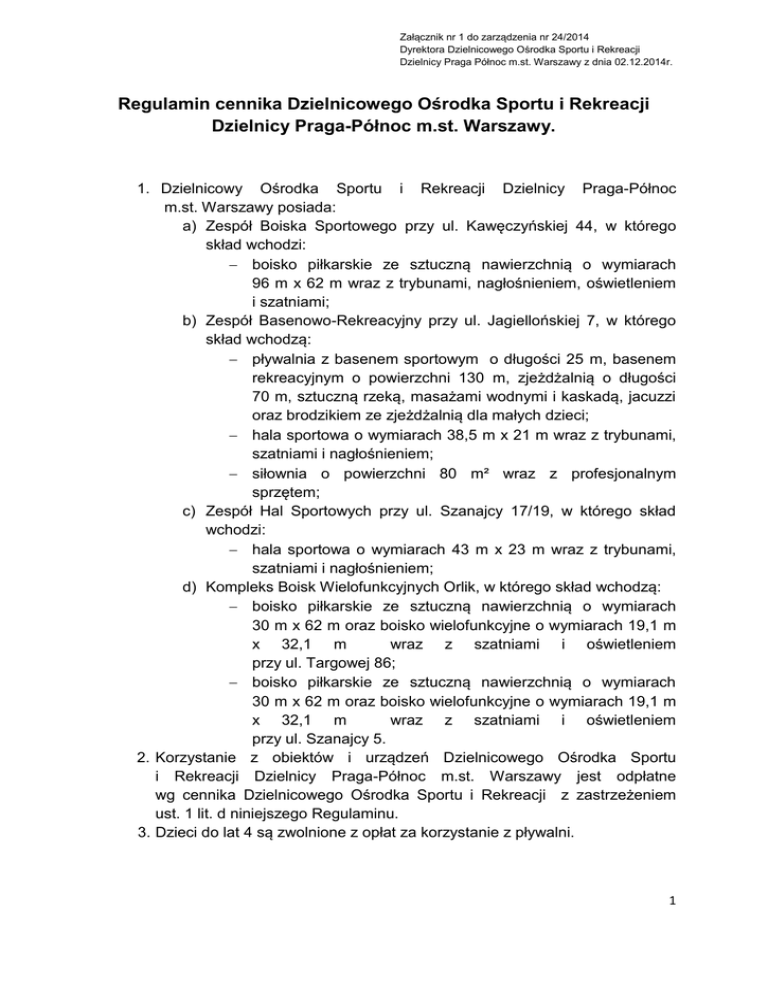 Załącznik nr 1 do zarządzenia nr 24/2014 Dyrektora Dzielnicowego Ośrodka Sportu i Rekreacji Dzielnicy Praga Północ m.st. Warszawy z dnia 02.12.2014r. Regulamin cennika Dzielnicowego Ośrodka Sportu i Rekreacji Dzielnicy Praga-Północ m.st. Warszawy. 1. Dzielnicowy Ośrodka Sportu i Rekreacji Dzielnicy Praga-Północ m.st. Warszawy posiada: a) Zespół Boiska Sportowego przy ul. Kawęczyńskiej 44, w którego skład wchodzi: boisko piłkarskie ze sztuczną nawierzchnią o wymiarach 96 m x 62 m wraz z trybunami, nagłośnieniem, oświetleniem i szatniami; b) Zespół Basenowo-Rekreacyjny przy ul. Jagiellońskiej 7, w którego skład wchodzą: pływalnia z basenem sportowym o długości 25 m, basenem rekreacyjnym o powierzchni 130 m, zjeżdżalnią o długości 70 m, sztuczną rzeką, masażami wodnymi i kaskadą, jacuzzi oraz brodzikiem ze zjeżdżalnią dla małych dzieci; hala sportowa o wymiarach 38,5 m x 21 m wraz z trybunami, szatniami i nagłośnieniem; siłownia o powierzchni 80 m² wraz z profesjonalnym sprzętem; c) Zespół Hal Sportowych przy ul. Szanajcy 17/19, w którego skład wchodzi: hala sportowa o wymiarach 43 m x 23 m wraz z trybunami, szatniami i nagłośnieniem; d) Kompleks Boisk Wielofunkcyjnych Orlik, w którego skład wchodzą: boisko piłkarskie ze sztuczną nawierzchnią o wymiarach 30 m x 62 m oraz boisko wielofunkcyjne o wymiarach 19,1 m x 32,1 m wraz z szatniami i oświetleniem przy ul. Targowej 86; boisko piłkarskie ze sztuczną nawierzchnią o wymiarach 30 m x 62 m oraz boisko wielofunkcyjne o wymiarach 19,1 m x 32,1 m wraz z szatniami i oświetleniem przy ul. Szanajcy 5. 2. Korzystanie z obiektów i urządzeń Dzielnicowego Ośrodka Sportu i Rekreacji Dzielnicy Praga-Północ m.st. Warszawy jest odpłatne wg cennika Dzielnicowego Ośrodka Sportu i Rekreacji z zastrzeżeniem ust. 1 lit. d niniejszego Regulaminu. 3. Dzieci do lat 4 są zwolnione z opłat za korzystanie z pływalni. 1 4. Czasowym jednostkami podstawowymi stosowanymi w Dzielnicowym Ośrodku Sportu i Rekreacji Dzielnicy Praga-Północ m.st. Warszawy są: a) pływalnia 40 min, (70 min – niepełnosprawni) b) hale sportowe 1 h; c) boisko piłkarskie 1 h; d) siłownia wejście open; e) sauna 1 h; f) w uzasadnionych przypadkach stosuje się inne jednostki. 5. Klient może wykupić usługę organizacji imprez okolicznościowych np.: urodziny, imieniny, spotkania firmowe itp. Ceny tych imprez ustala się w drodze negocjacji. 6. W przypadku jednorazowych, okazjonalnych promocji, kampanii reklamowych i informacyjnych nie stosuje się odrębnego zarządzenia Dyrektora Dzielnicowego Ośrodka Sportu i Rekreacji Dzielnicy PragaPółnoc m.st. Warszawy. Ceny usług mogą być ustalane z jednorazowym rabatem (np. Walentynki, Dzień Kobiet, Dzień Dziecka itp.) za zgodą Dyrektora Dzielnicowego Ośrodka Sportu i Rekreacji Dzielnicy PragaPółnoc m.st. Warszawy. 7. Pozostałe zmiany w Cenniku mogą być wprowadzane tylko zarządzeniem Dyrektora Dzielnicowego Ośrodka Sportu i Rekreacji Dzielnicy PragaPółnoc m.st. Warszawy. 8. Bilety normalne i ulgowe: a) zakup biletu normalnego odbywa się w recepcji/administracji w dniach i godzinach funkcjonowania obiektu wg aktualnie obowiązującego Cennika; b) zakup biletu ulgowego odbywa się w recepcji w dniach i godzinach funkcjonowania obiektu wg aktualnie obowiązującego Cennika; c) do zakupu biletu ulgowego upoważniona jest osoba: dzieci oraz młodzież ucząca się do 26 roku życia za okazaniem legitymacji szkolnej; emeryci, renciści, inwalidzi oraz osoby niepełnosprawne za okazaniem ważnej legitymacji. 9. Bilet weekendowy: a) zakup biletu weekendowego odbywa się w recepcji w soboty i niedziele; b) bilet weekendowy nie posiada limitu czasowego. 10. Bilet open: a) zakup biletu odbywa się w recepcji w dniach i godzinach; funkcjonowania obiektu wg aktualnie obowiązującego cennika; b) bilet open nie posiada limitu czasowego. 11. Bilet rodzinny: a) zakup biletu rodzinnego odbywa się w recepcji w dniach i godzinach funkcjonowania obiektu wg aktualnie obowiązującego cennika; b) do zakupu biletu rodzinnego upoważnione są osoby: - jedna osoba dorosła + maksymalnie dwoje dzieci do 18-tego roku życia; - dwie osoby dorosłe + maksymalnie troje dzieci do 18-tego roku życia; 2 12. Bilet poranny: a) zakup biletu porannego odbywa się w recepcji w dniach i godzinach funkcjonowania obiektu wg aktualnie obowiązującego cennika; b) ostatnie wejście (bilet poranny) o godzinie 9.20. 13.Pakiet rodzinny: c) zakup pakietu odbywa się w recepcji w dniach i godzinach funkcjonowania obiektu wg aktualnie obowiązującego cennika; d) do zakupu pakietu upoważnione są rodziny: minimum trzy osoby (rodzice z dziećmi, dzieci z rodzicami). 14.Grupy zorganizowane: a) zakup biletów dla grupy zorganizowanej odbywa się w recepcji w dniach i godzinach funkcjonowania obiektu wg aktualnie obowiązującego cennika; b) obecność opiekuna w grupie zorganizowanej jest obowiązkowa c) opiekunem może być wyłącznie osoba dorosła za okazaniem dokumentu tożsamości; d) wejście dotyczy grupy minimum 10 osób wraz z opiekunem. 15. Karnety normalne i ulgowe: a) zakup karnetów odbywa się w recepcji w dniach i godzinach funkcjonowania obiektu wg aktualnie obowiązującego cennika; b) karnet posiada określoną wartość wyrażoną w złotych, uprawniającą okaziciela karty do korzystania z usług wg aktualnie obowiązującego cennika; c) koszt pobytu na pływalni jest rozliczony z dokładnością minutową poprzez pomniejszenie wartości środków finansowych na wykupionej karcie; d) ważność Karnetu jest liczona od dnia zakupu; e) z jednego Karnetu może korzystać więcej niż jedna osoba, opłata będzie naliczona automatycznie za każdą osobę wg taryfy z danego Karnetu; f) Dzielnicowy Ośrodek Sportu i Rekreacji Dzielnicy Praga-Północ m.st. Warszawy nie zwraca środków pieniężnych za niewykorzystane karnety. W przypadku gdy na karnecie pozostanie kwota mniejsza ni